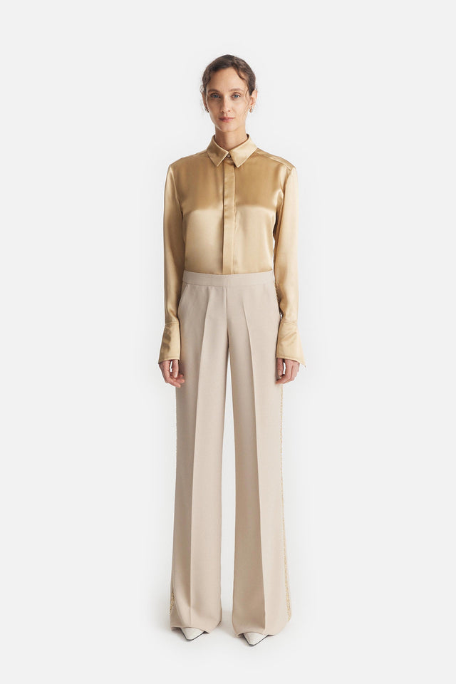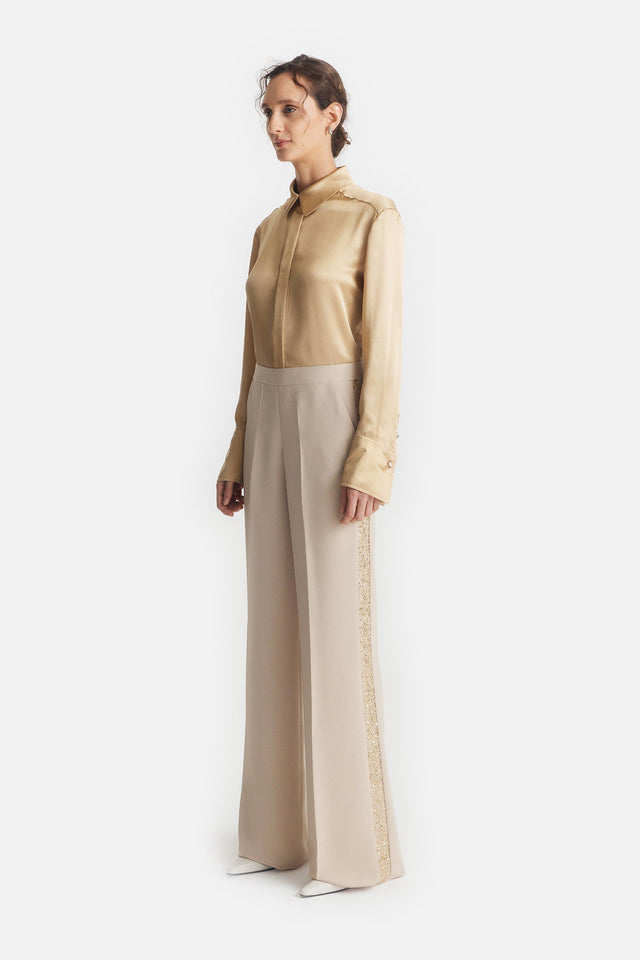 Pantalón Smoking Oro de Crepe Elastizado y Tul Bordado
