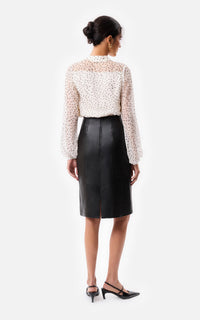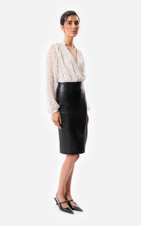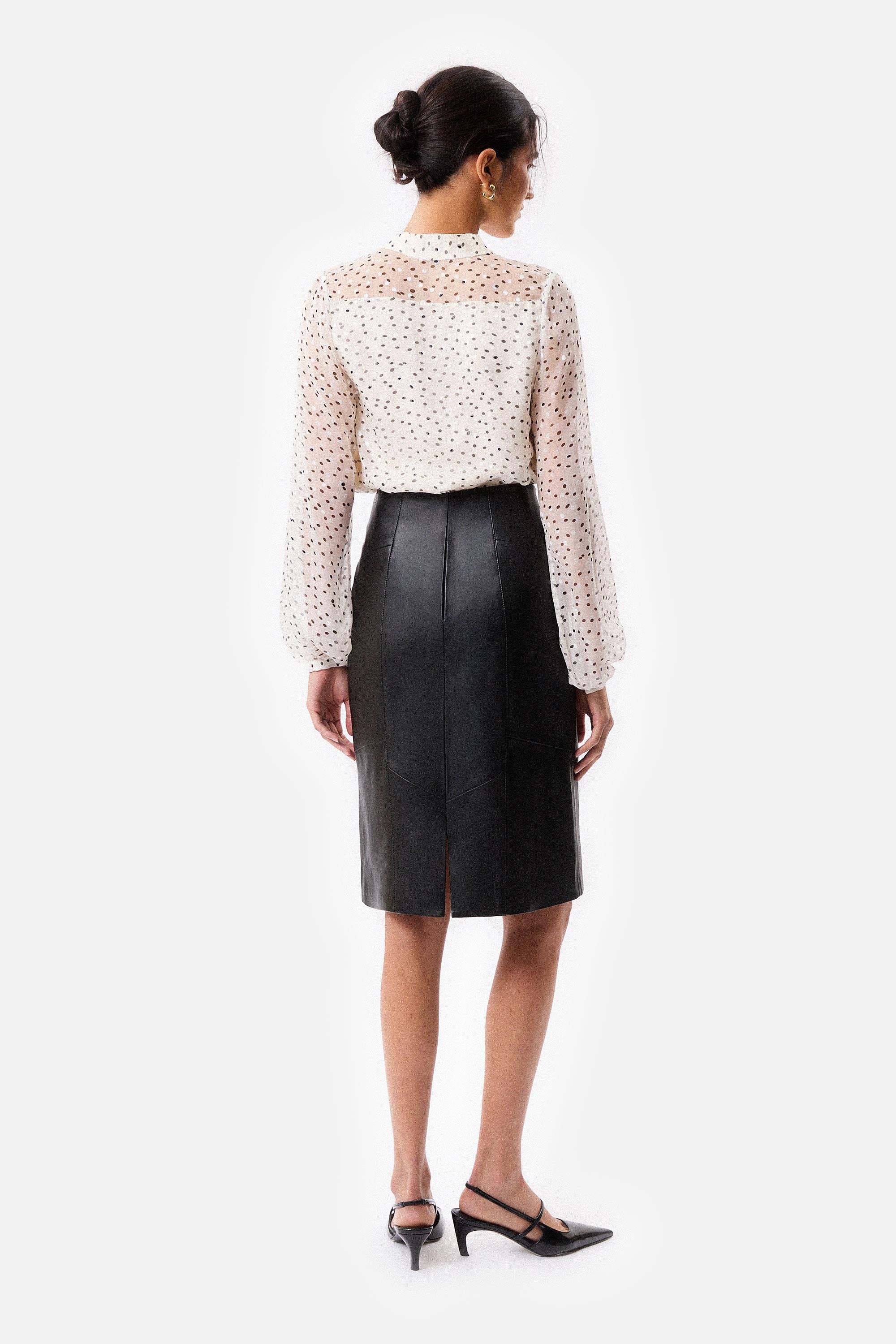 • Blusa drapeada con mangas globo confeccionada en gasa estampada de lunares blanco y negro forrada en satén a tono con botón de nácar en el puño.