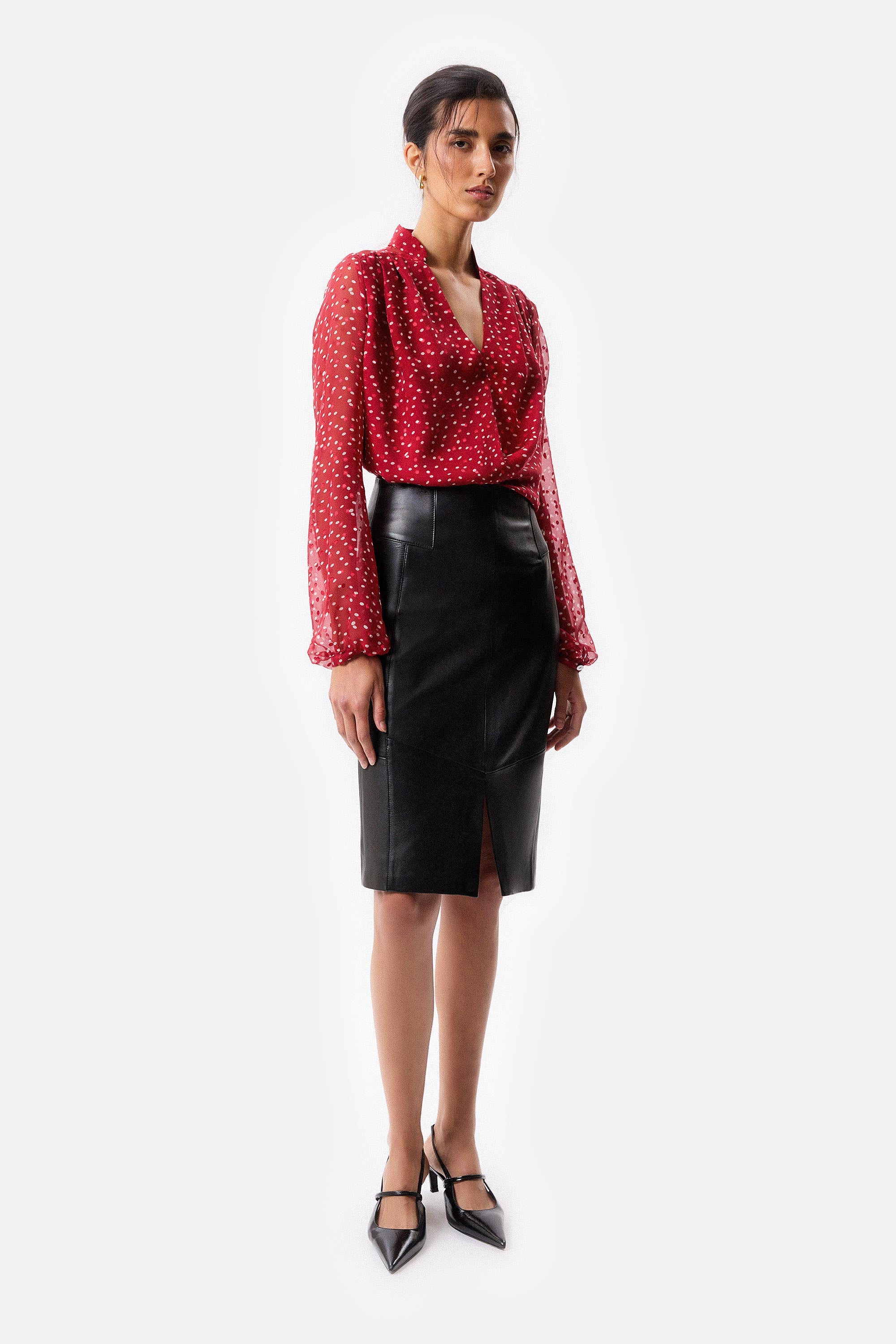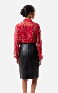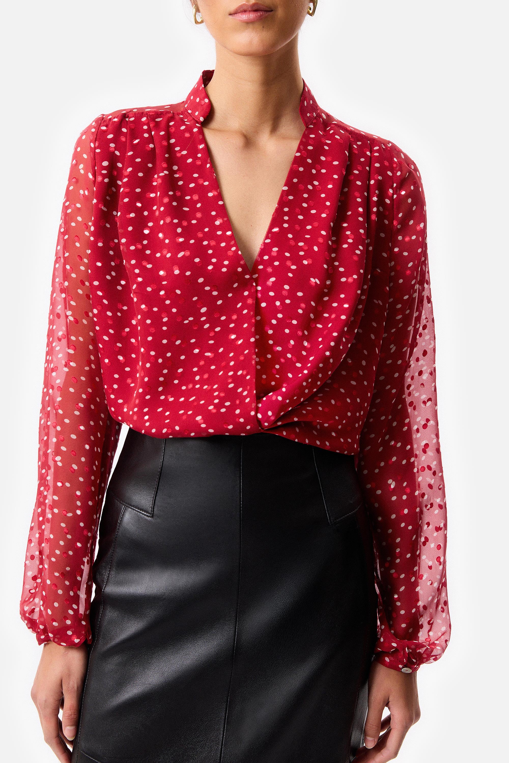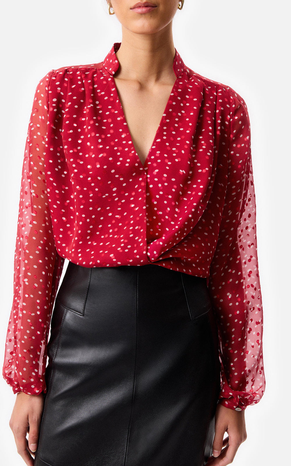 • Blusa drapeada con mangas globo confeccionada en gasa estampada de lunares roja forrada en satén a tono con botón de nácar en el puño.