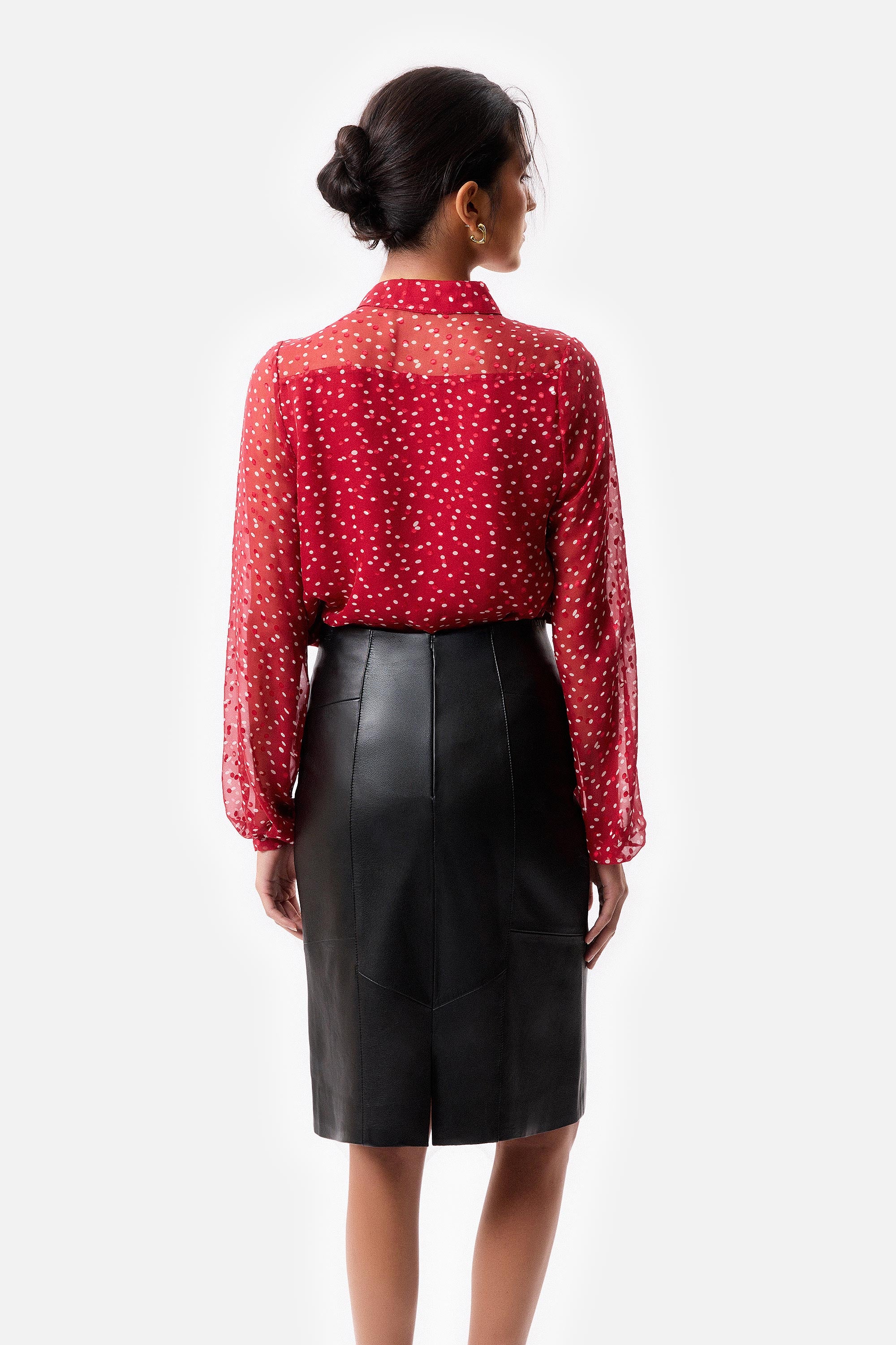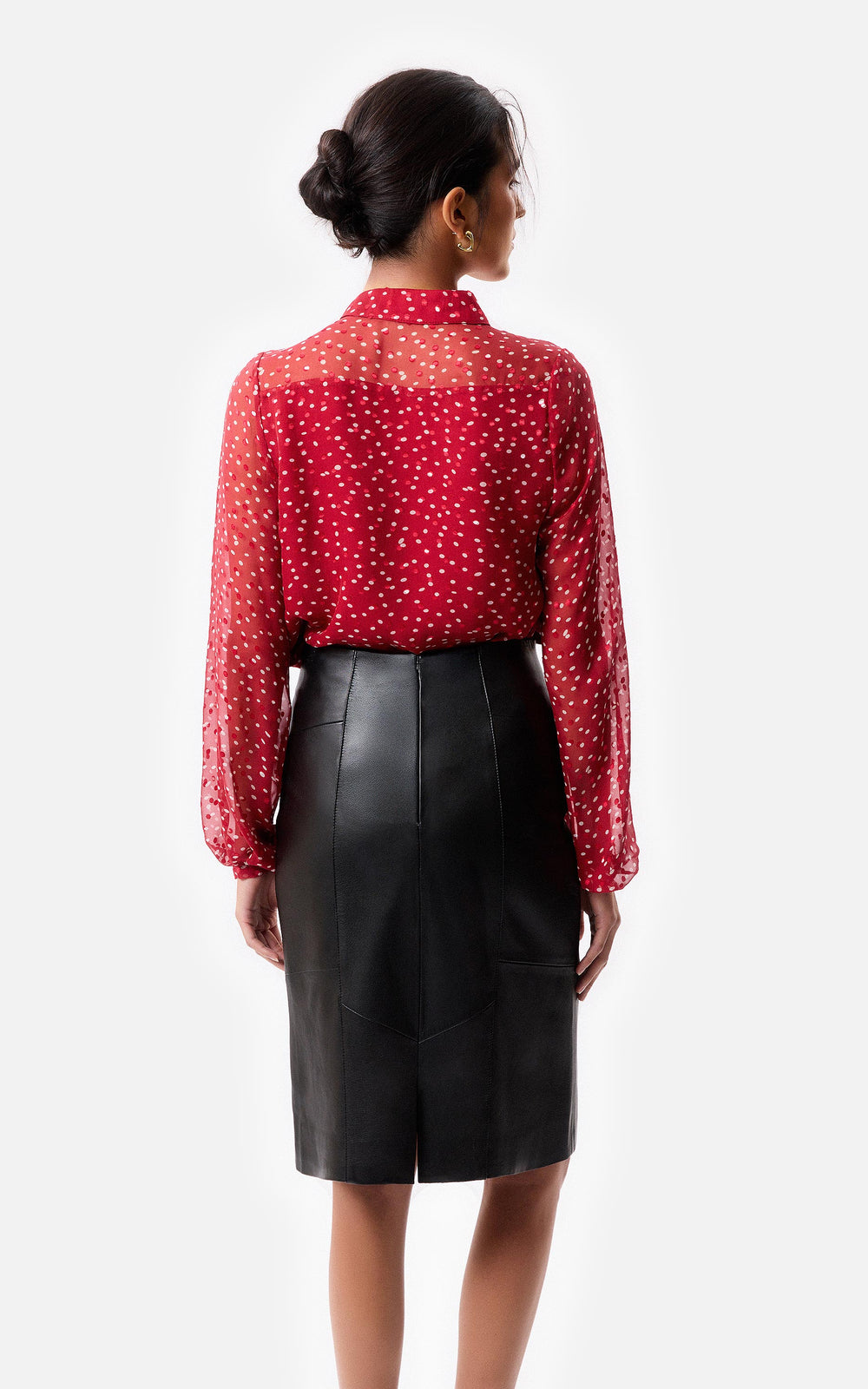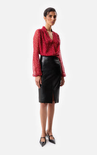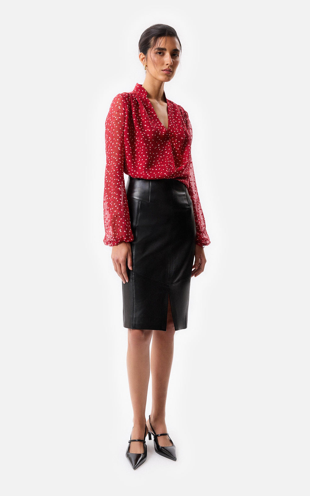 • Blusa drapeada con mangas globo confeccionada en gasa estampada de lunares roja forrada en satén a tono con botón de nácar en el puño.