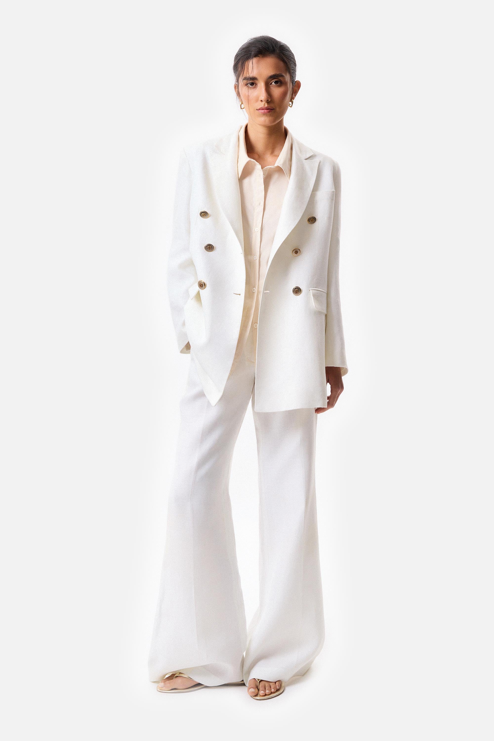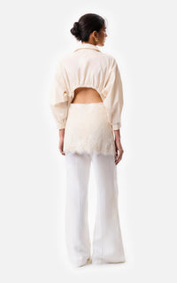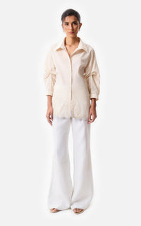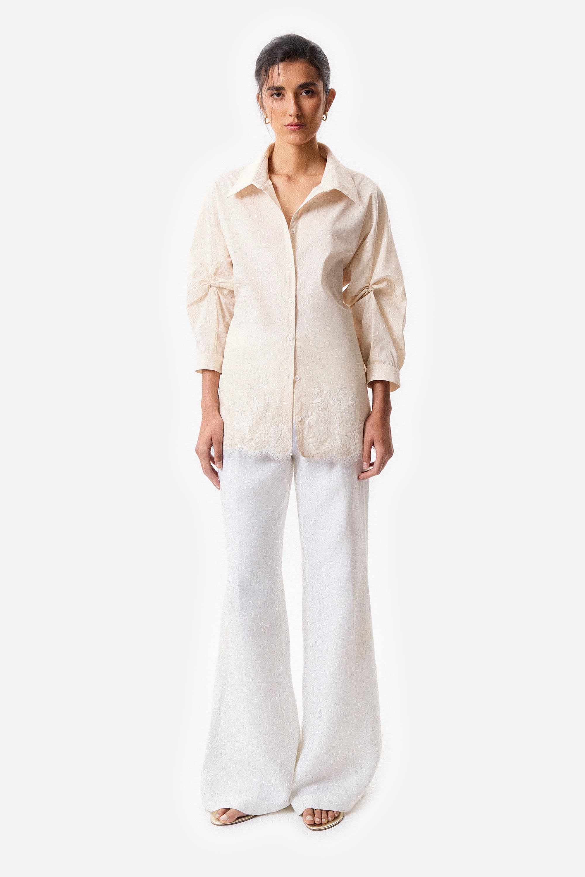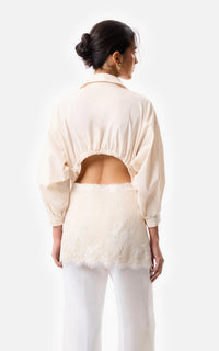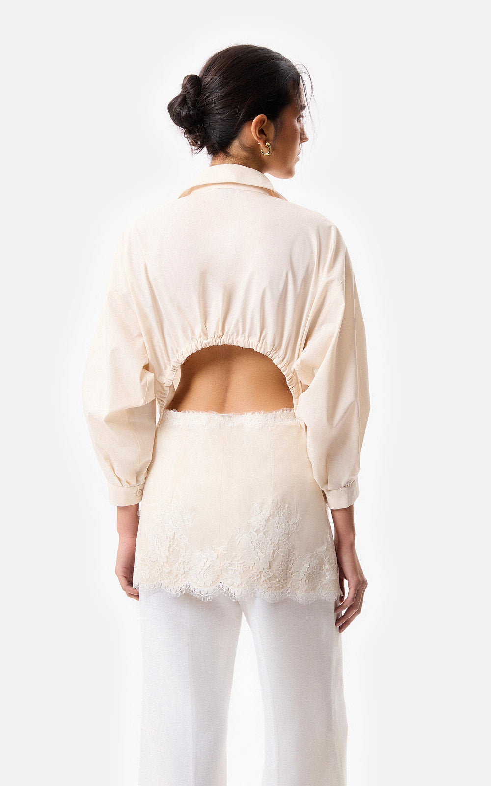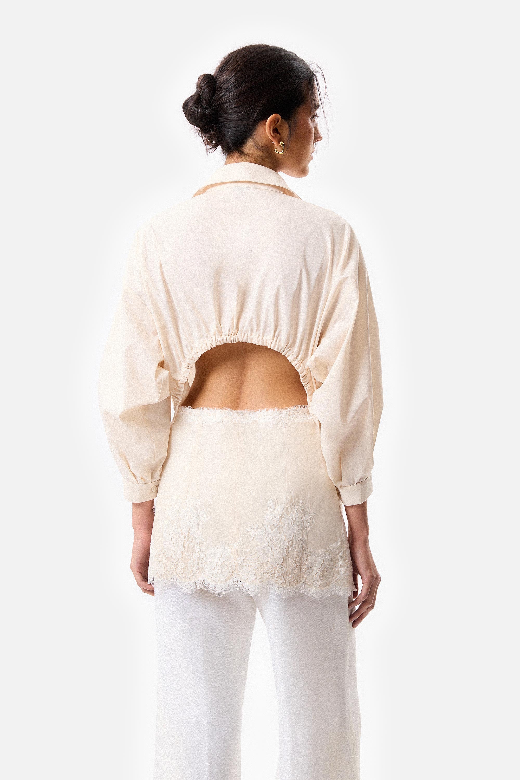 • Camisa con apertura en espalda en poplin elastizado, con sus mangas fruncidas y con apliques de puntilla off white.
