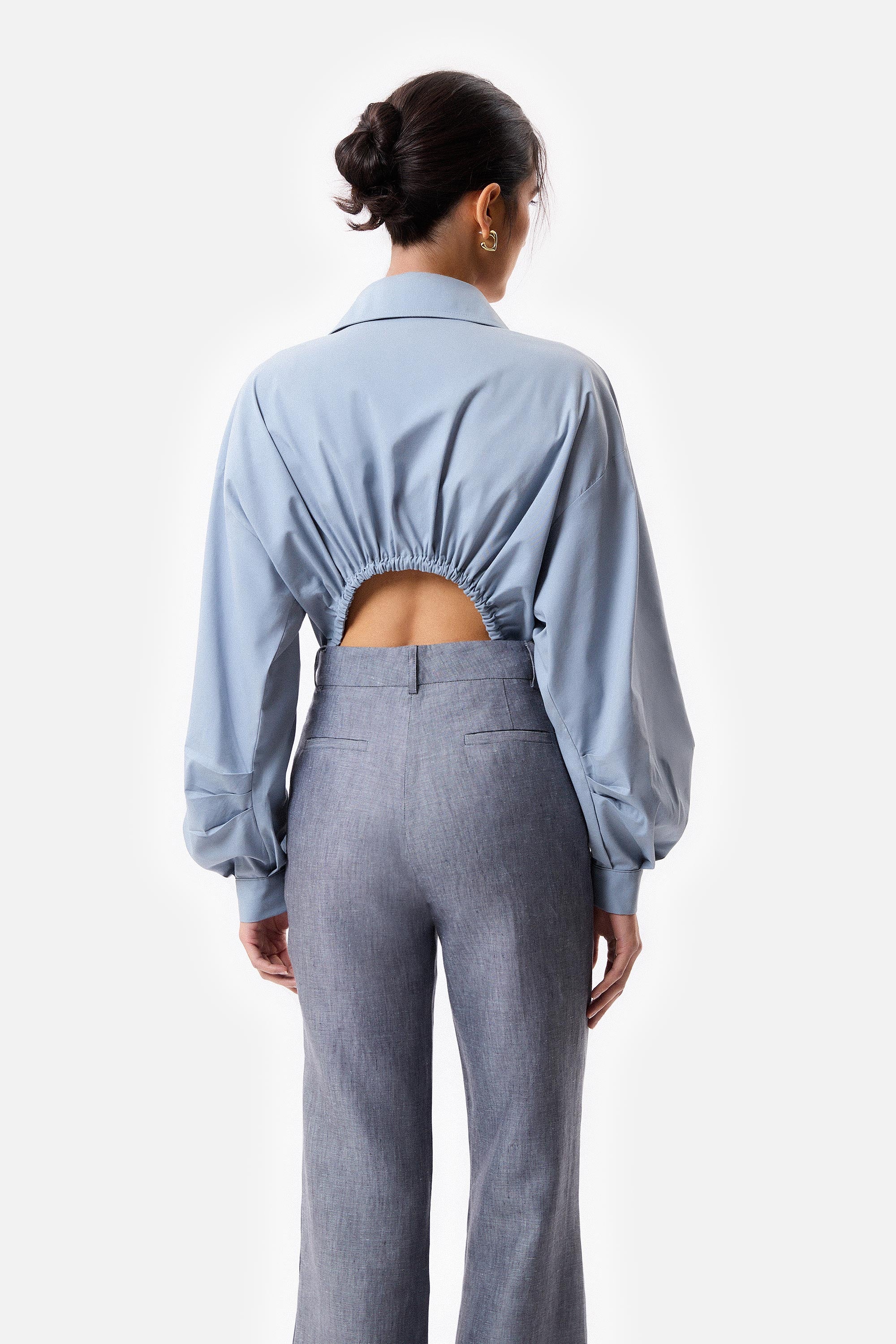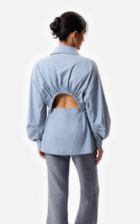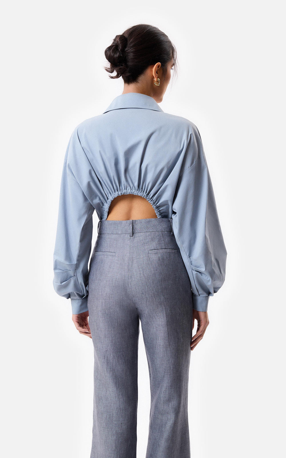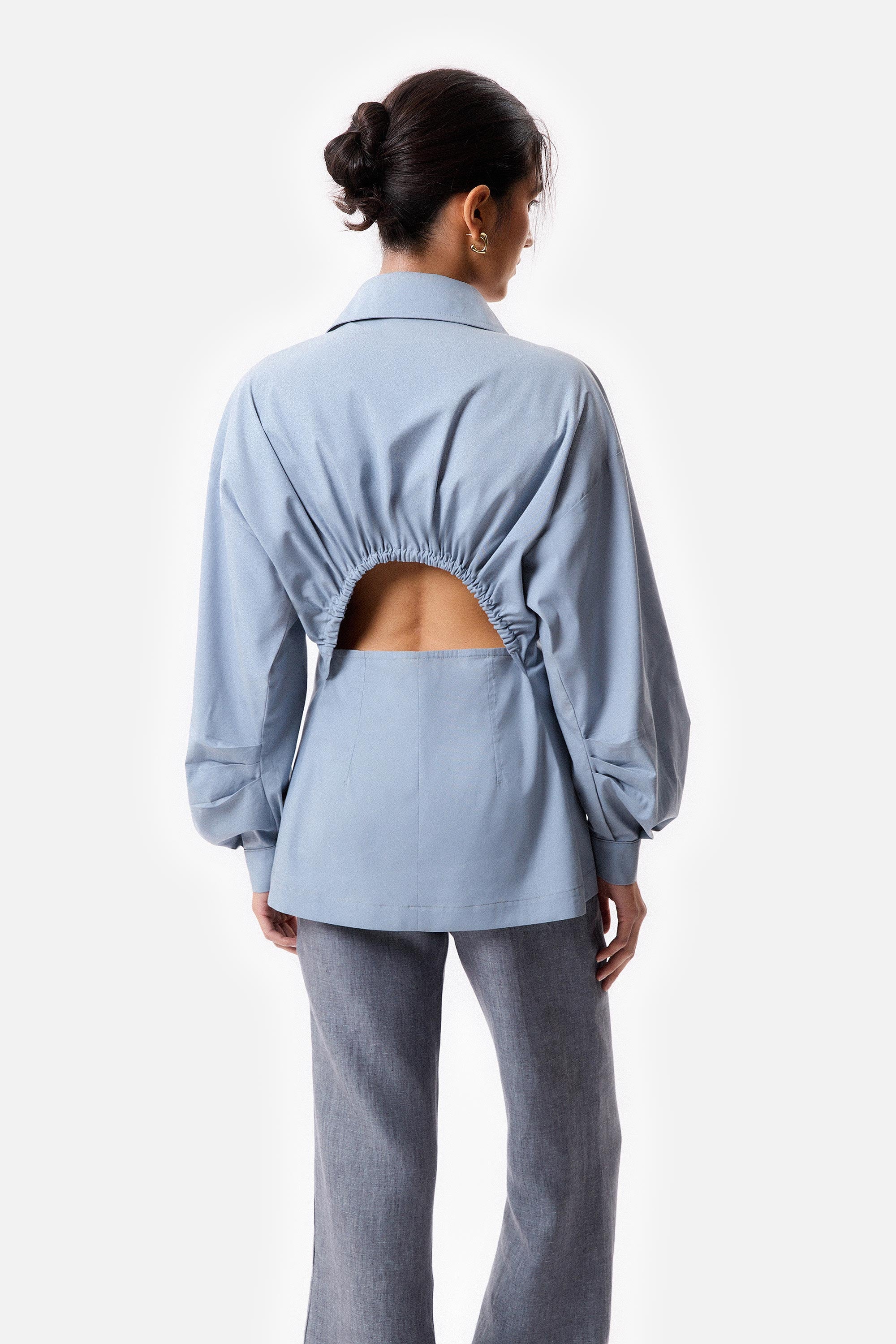 • Camisa con apertura en espalda y mangas fruncidas en poplin elastizado.