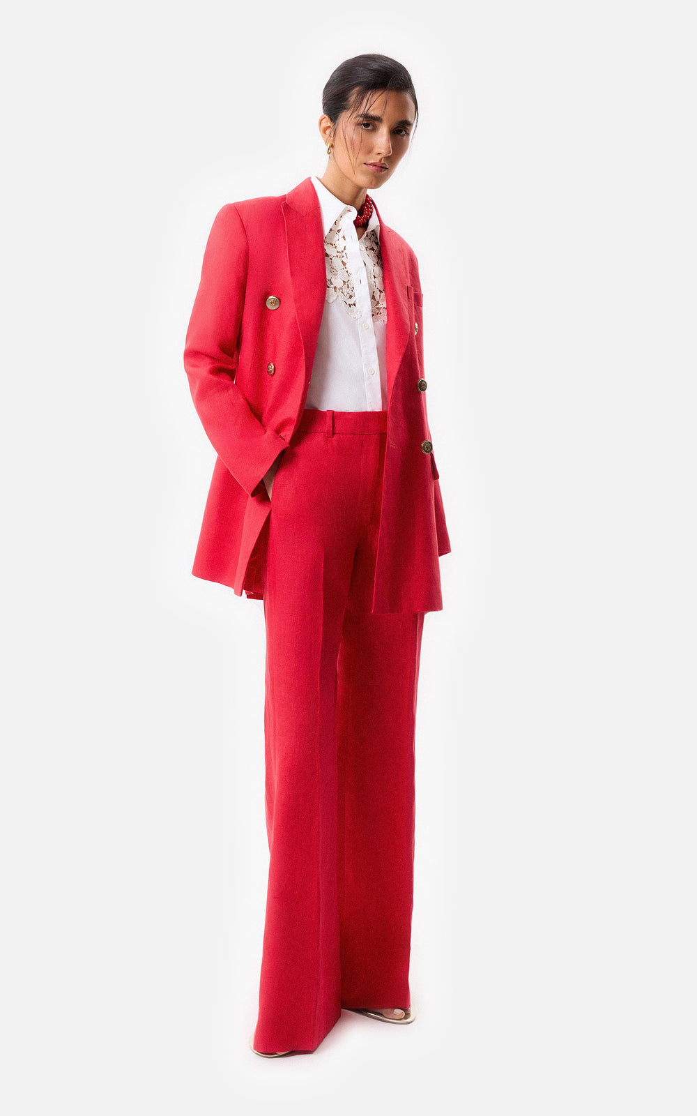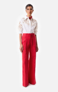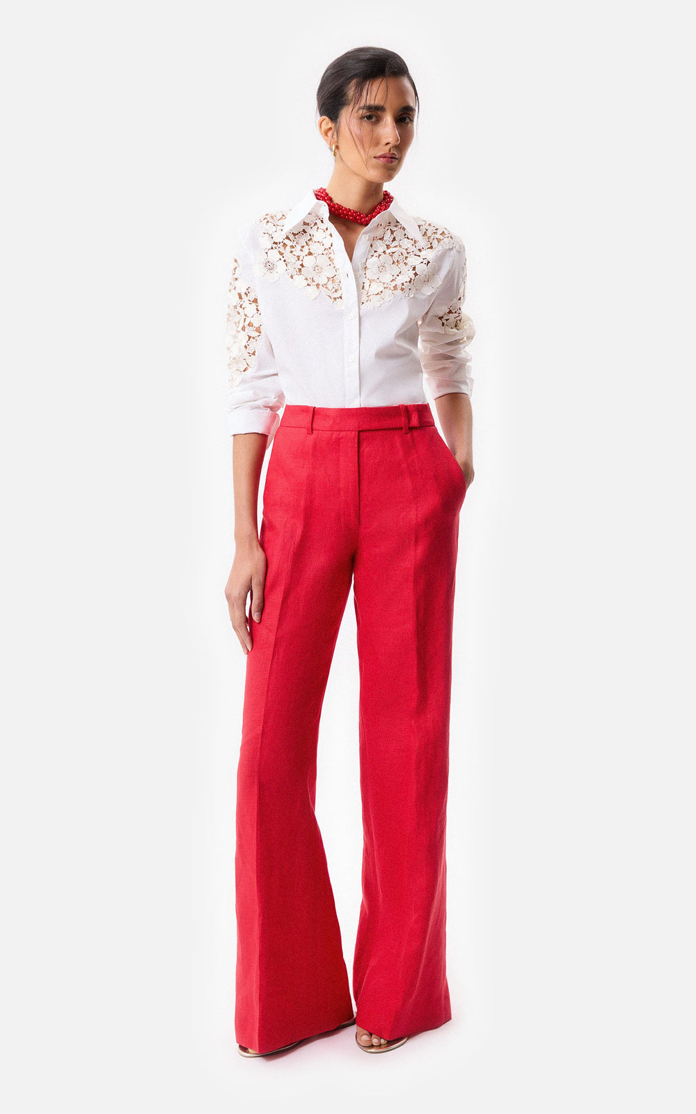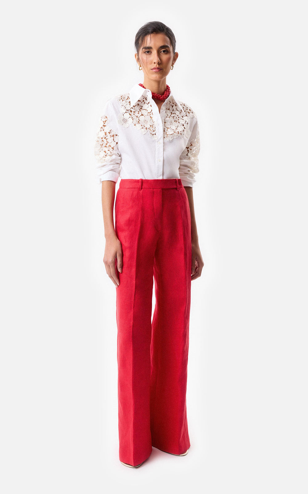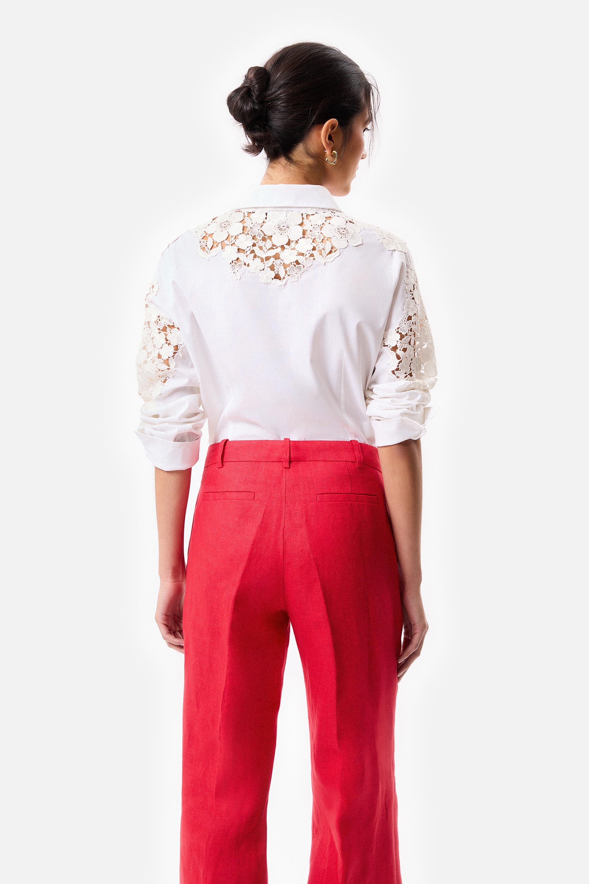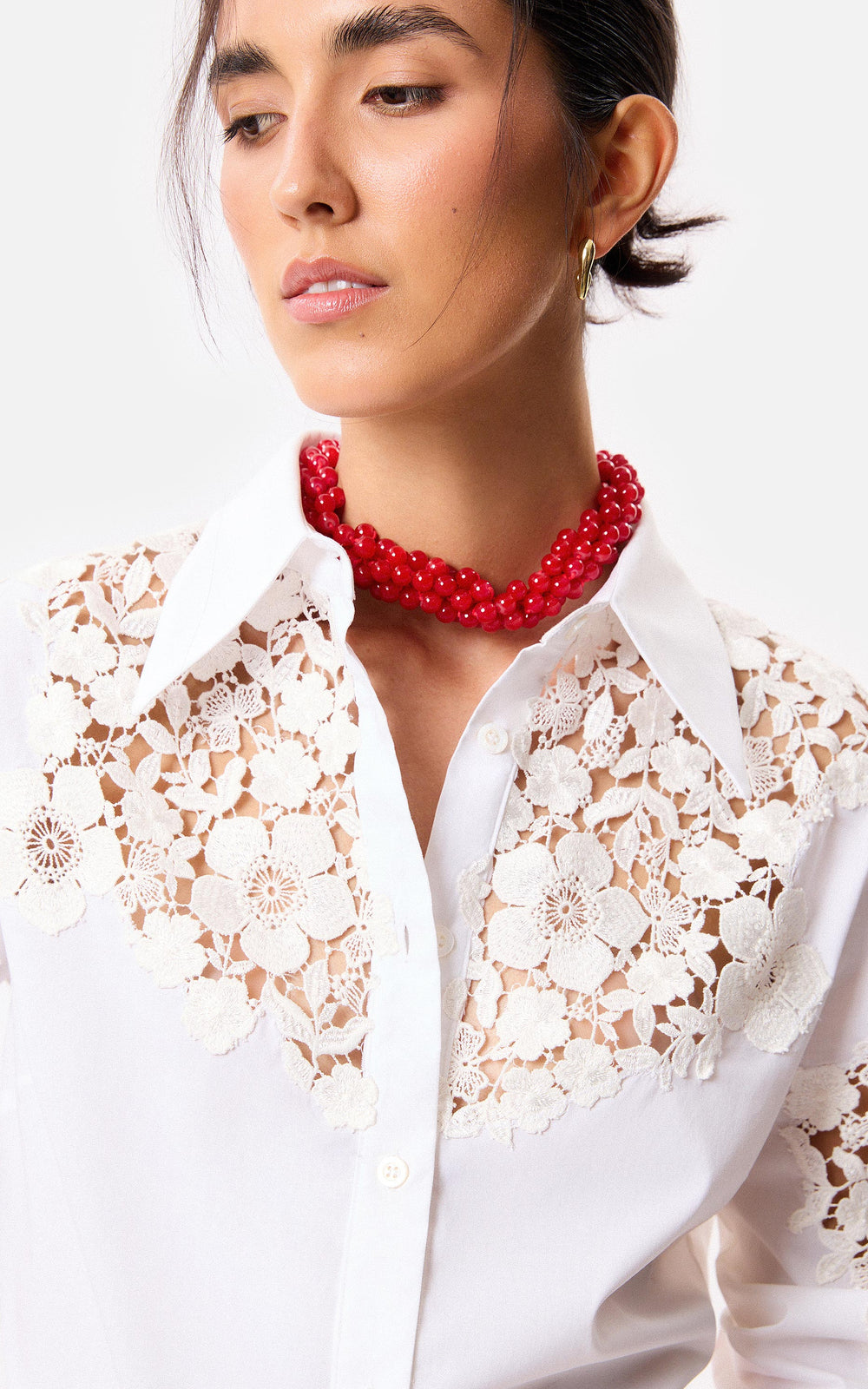 • Camisa slim fit de poplin elastizado blanco con calado de guipure.