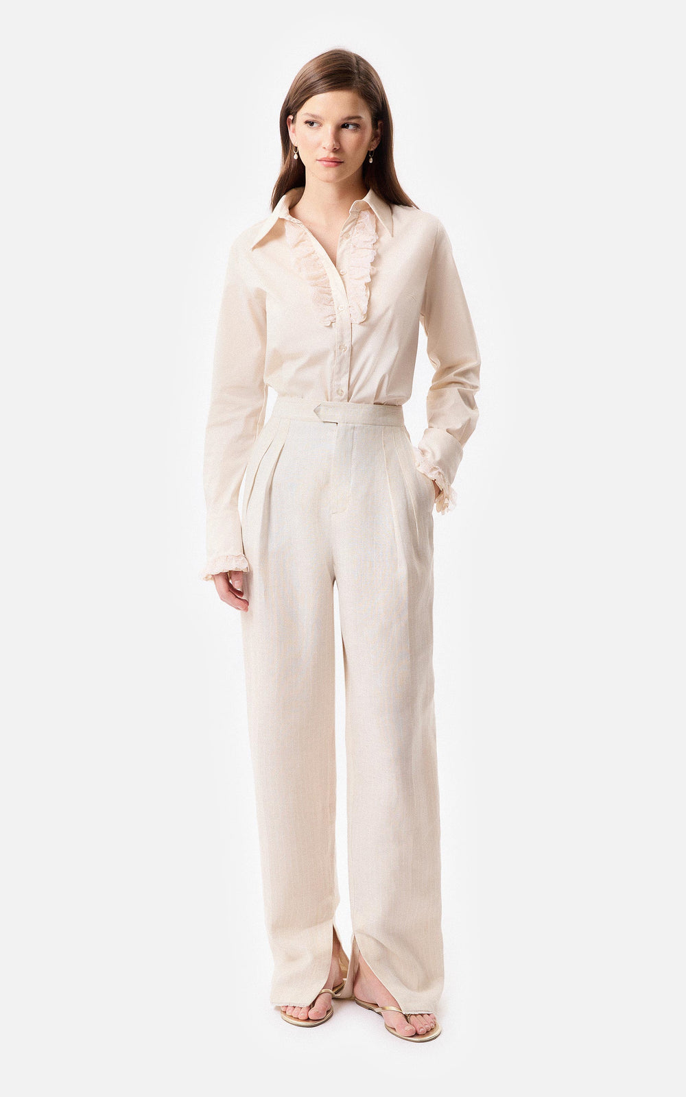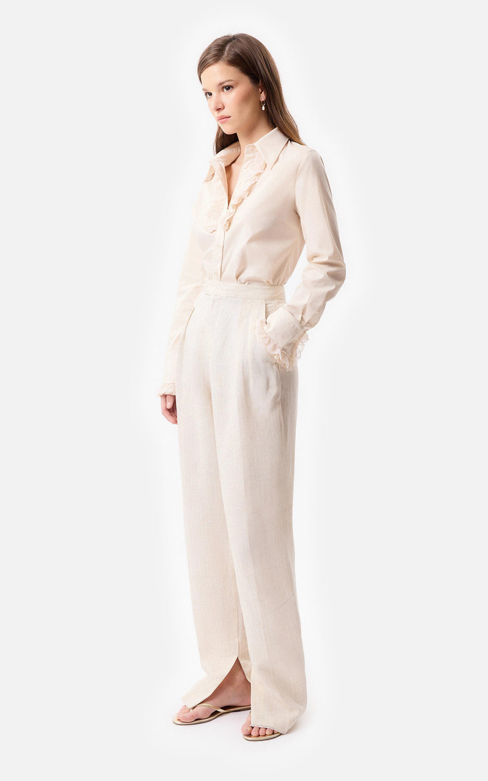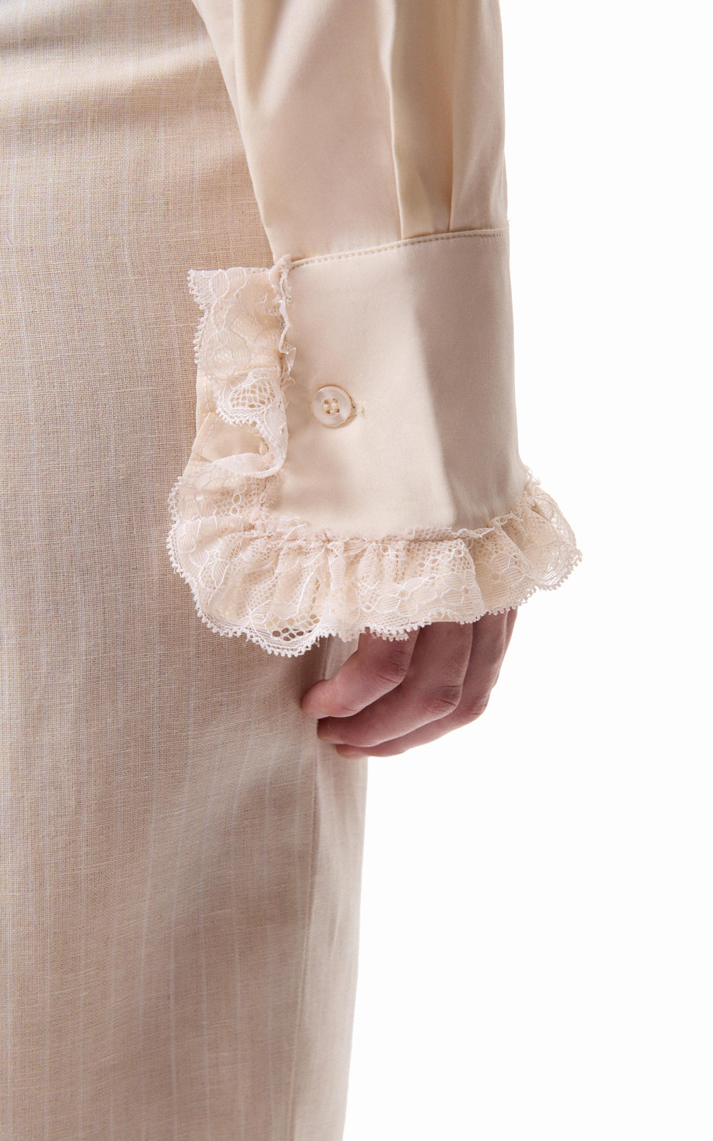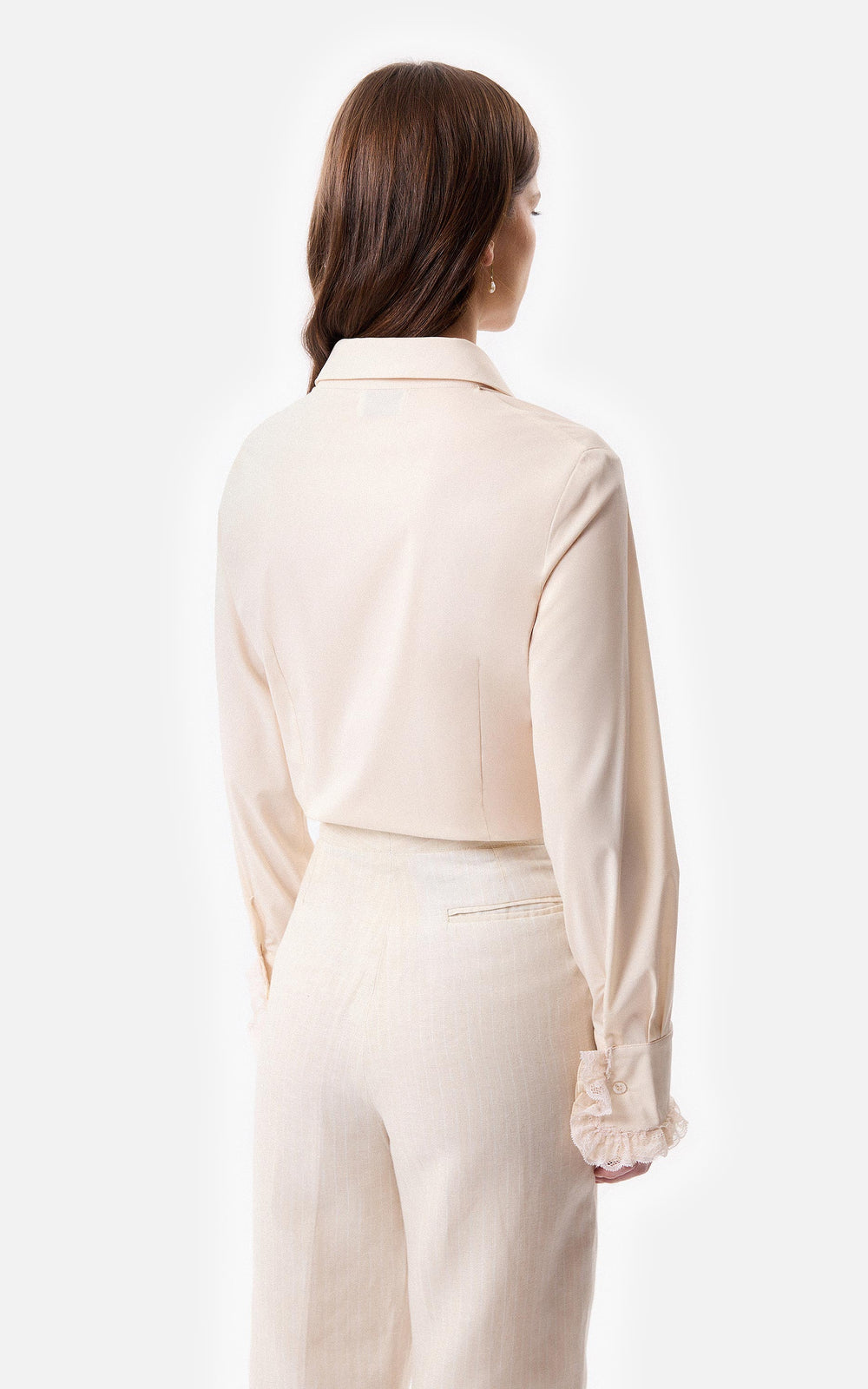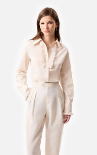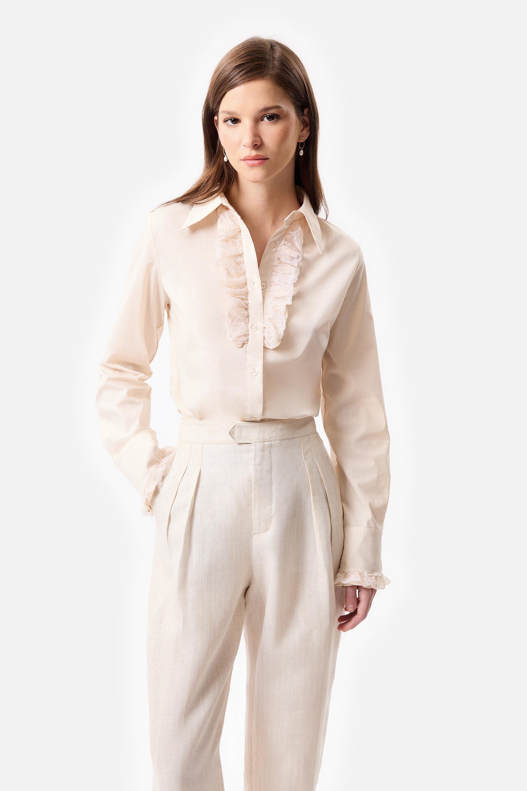 • Camisa slim fit de poplin elastizado con shabot en la cartera delantera y en los puños con aplique de puntilla a tono.