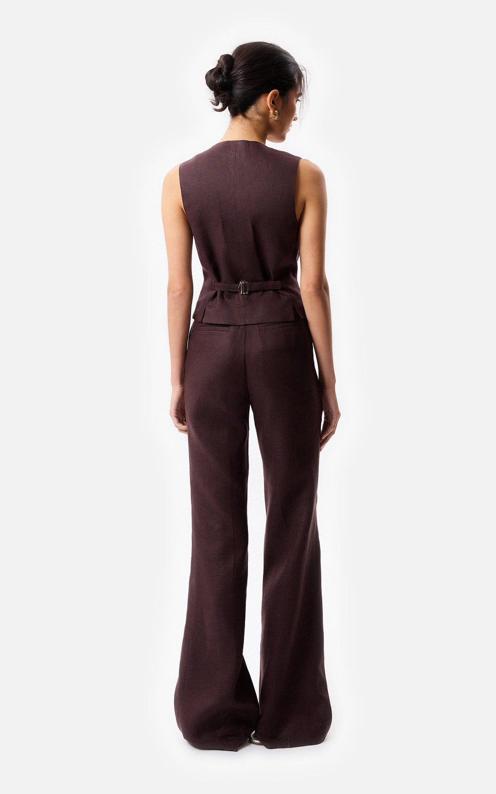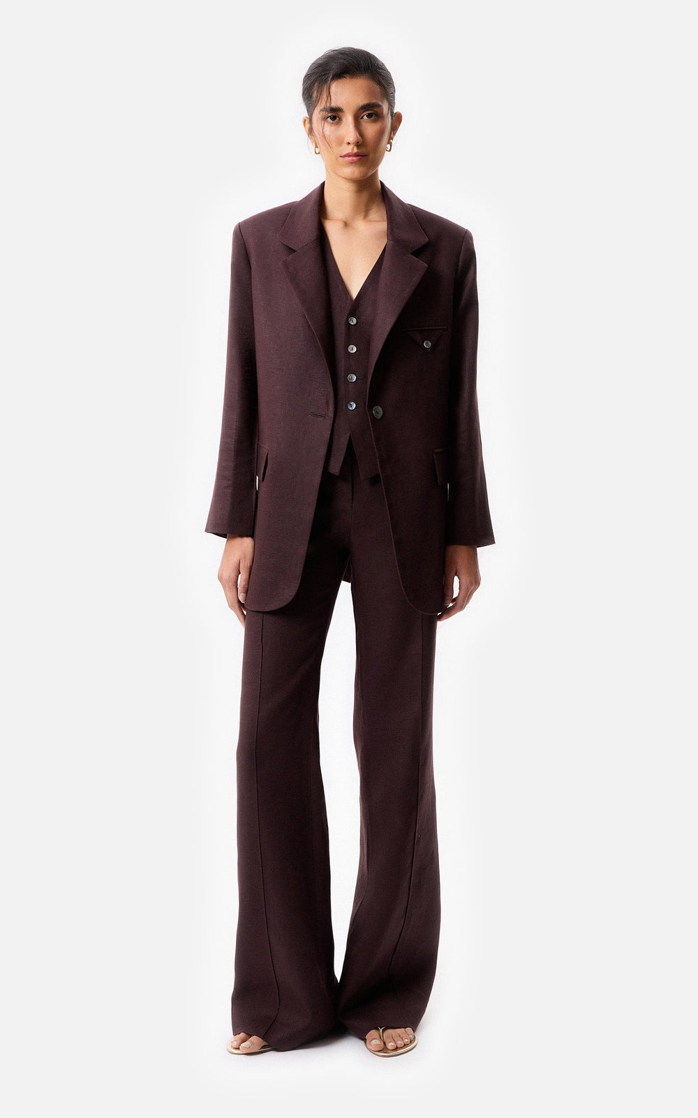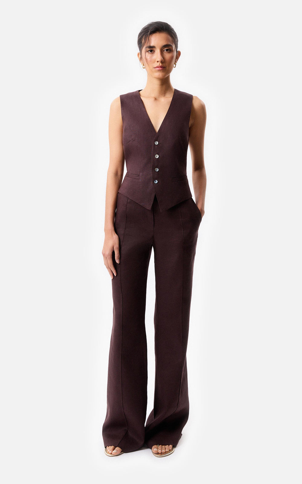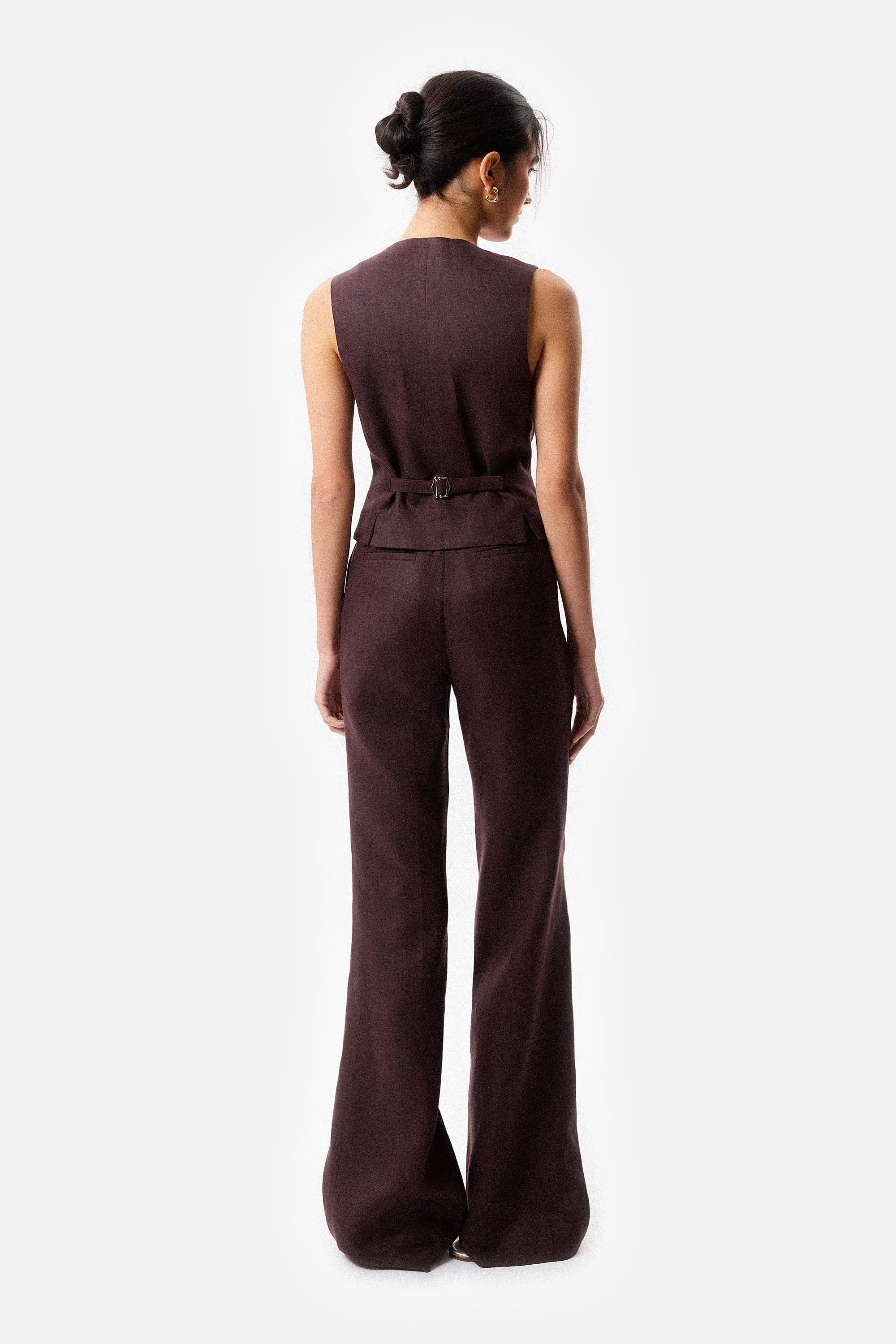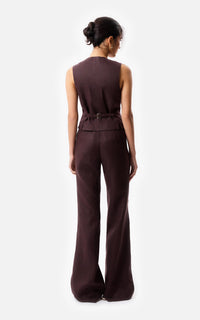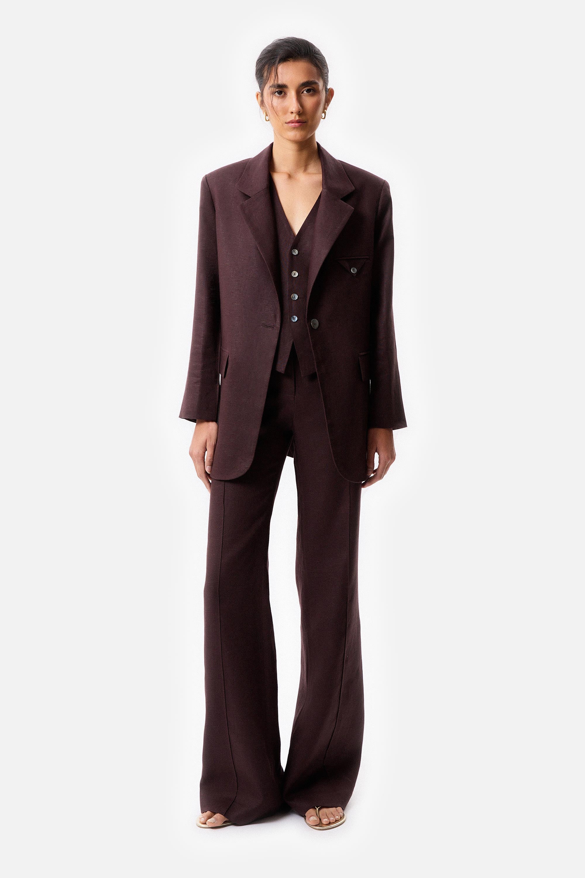 Chaleco sastrero con apertura frontal con botones, Composicion: 100% Lino, forrado en alpaseda 100% acetato, largo 58cm desde el hombro, la modelo mide 178cm y usa talle s, fabricado en Argentina, limpieza en seco en tintoreria.