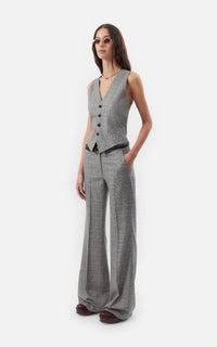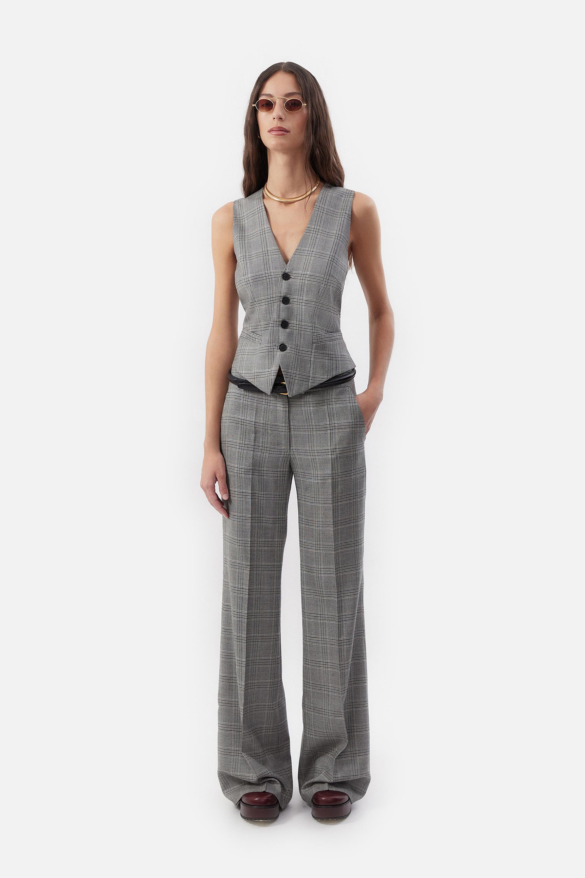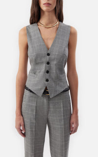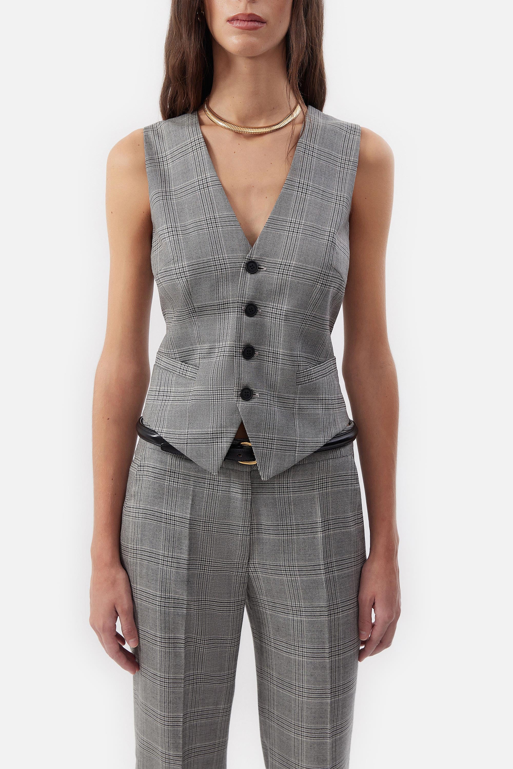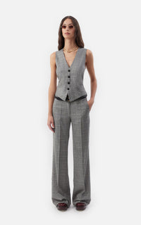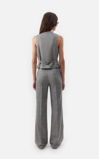 • Chaleco sastrero confeccionado en pura lana príncipe de gales forrado en alpaseda negra, con hebilla metálica regulable en la espalda.