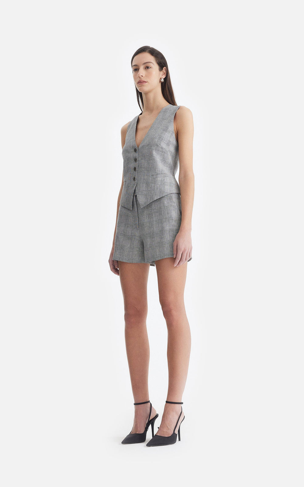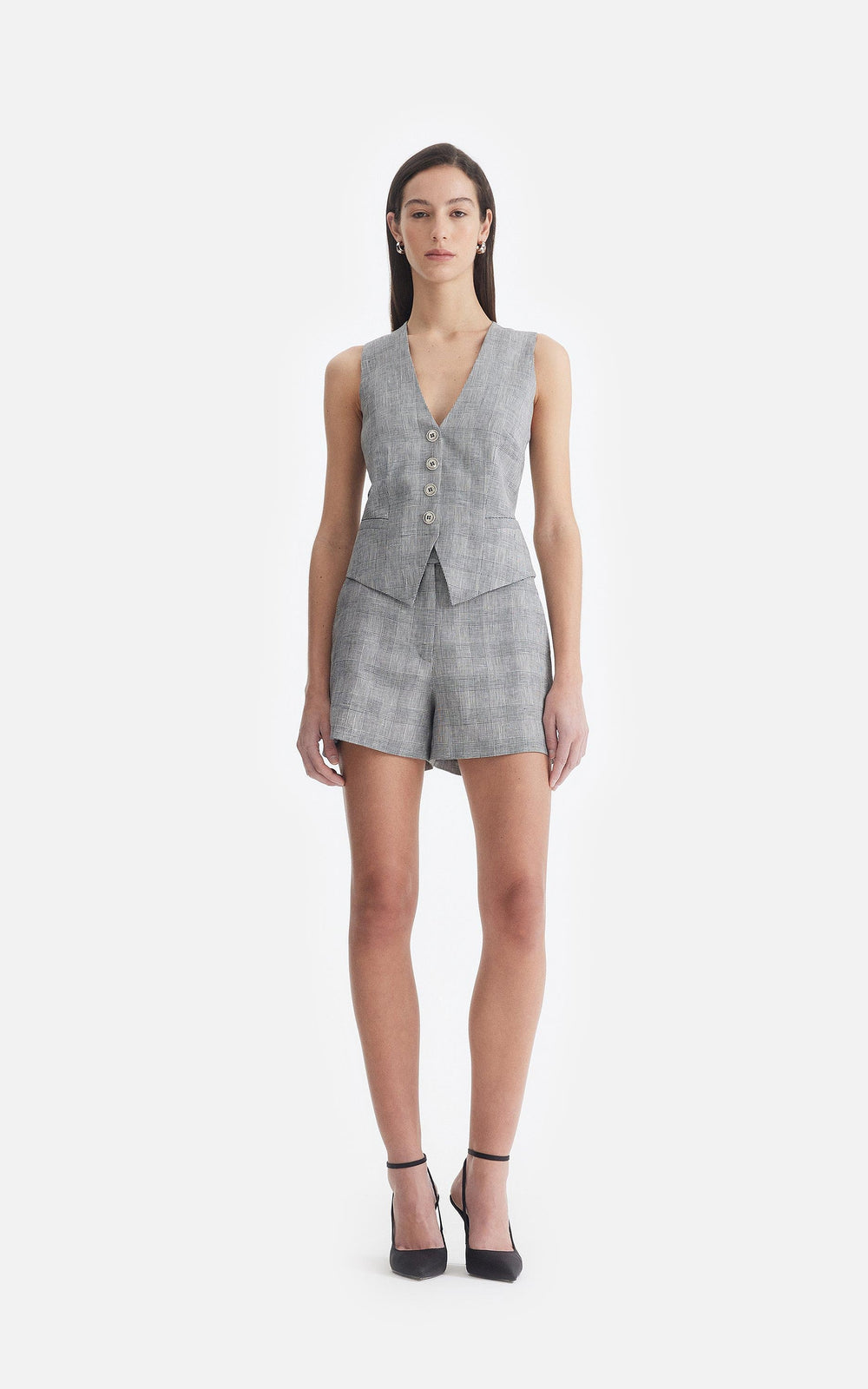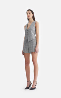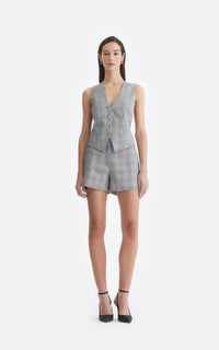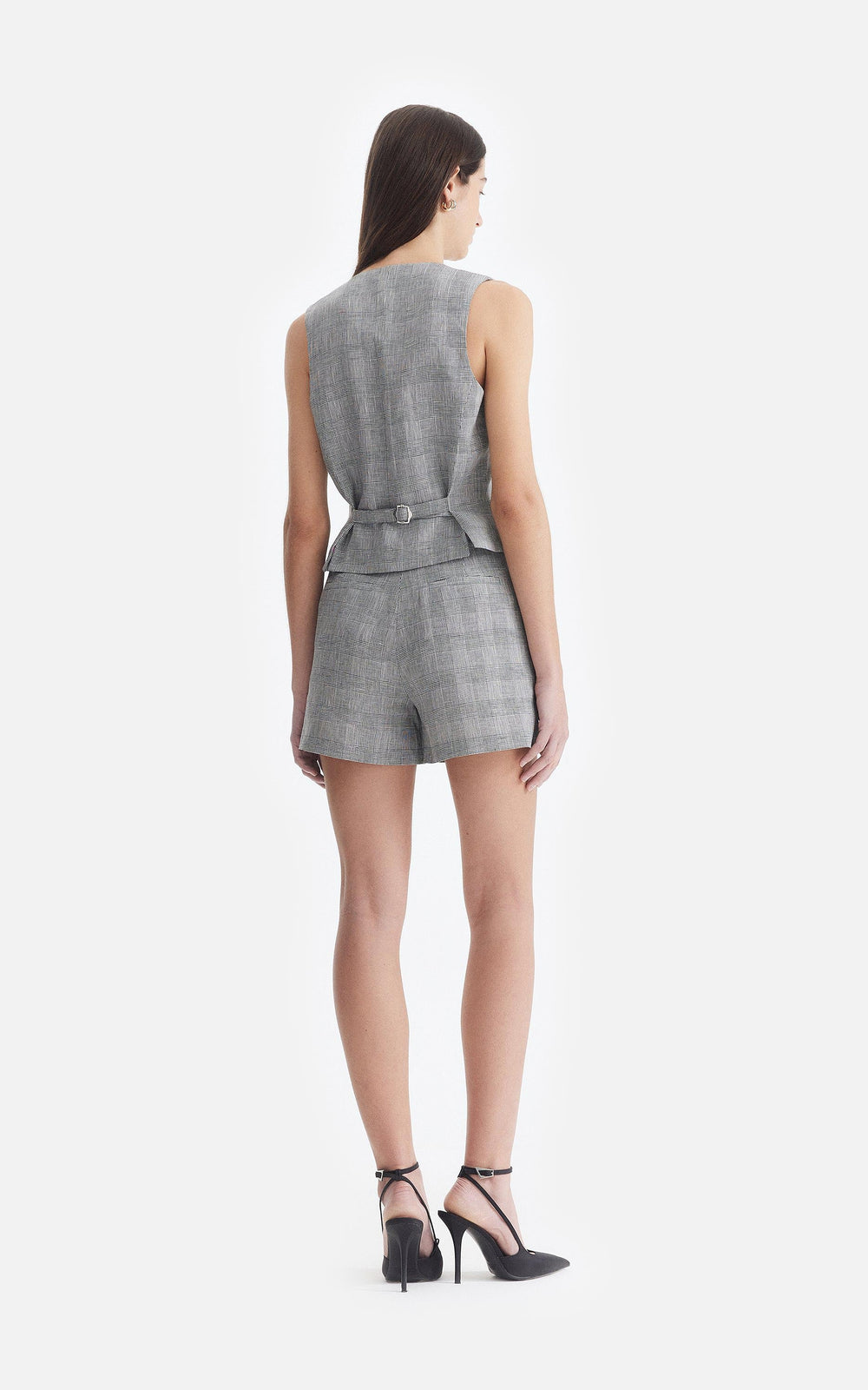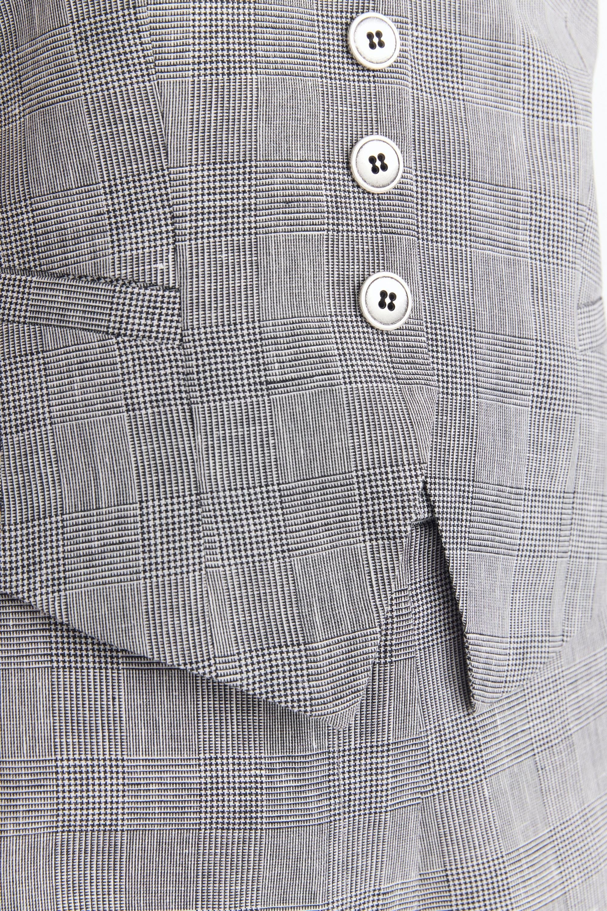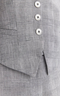 • Chaleco sastrero confeccionado en lino príncipe de gales forrado en satén frambuesa con hebilla metálica regulable en la espalda.