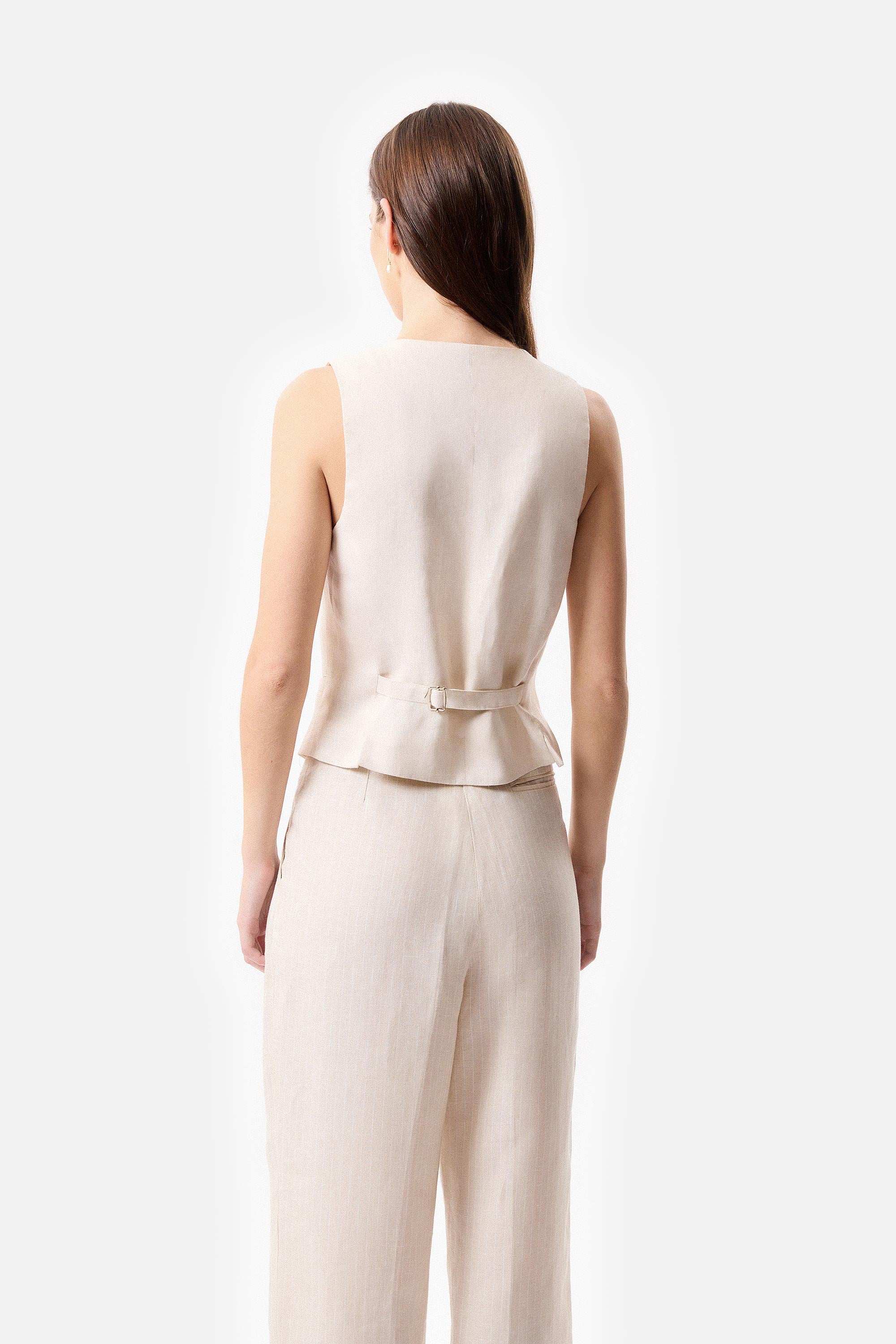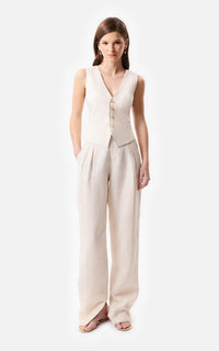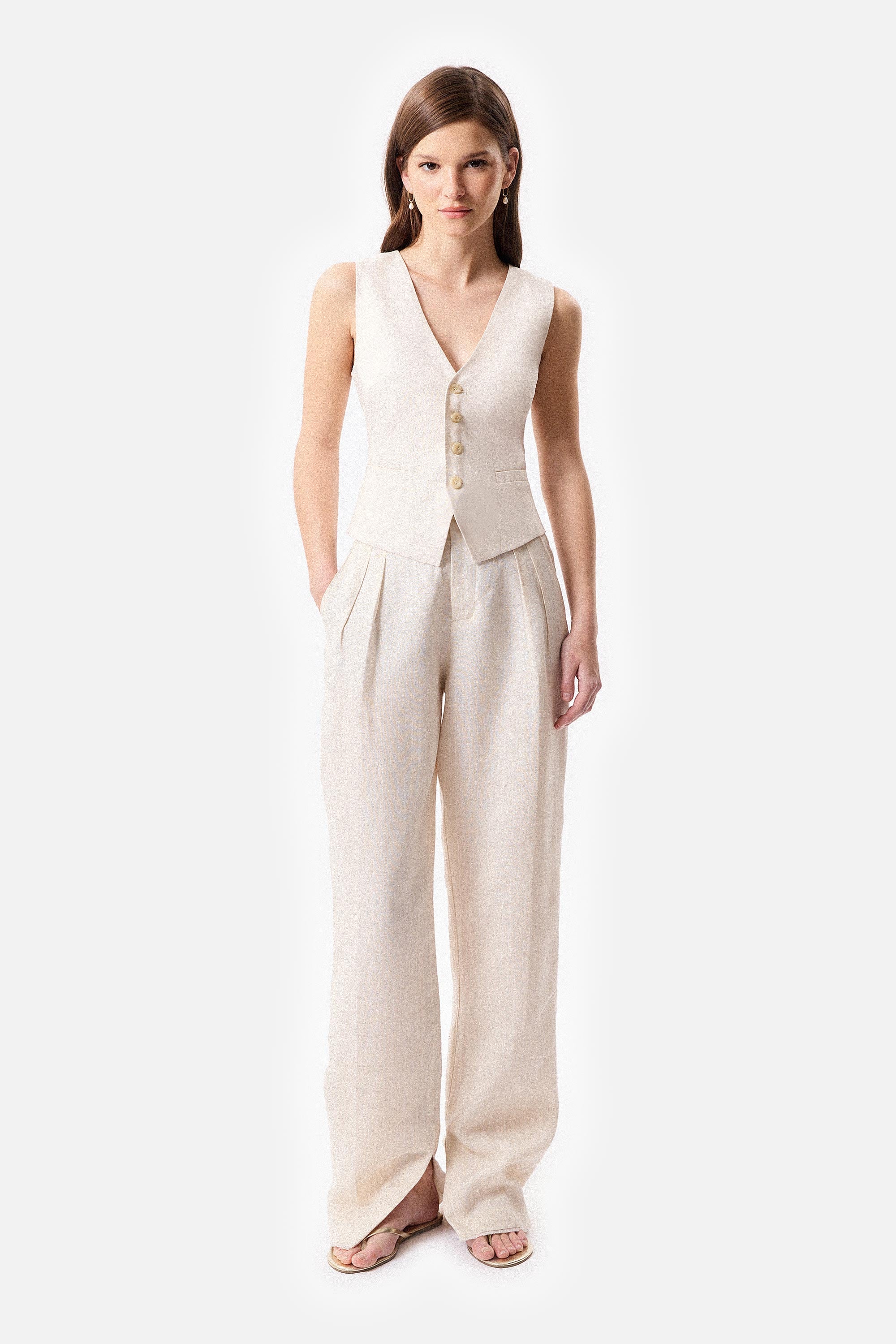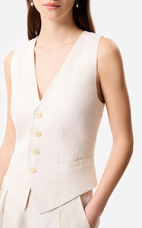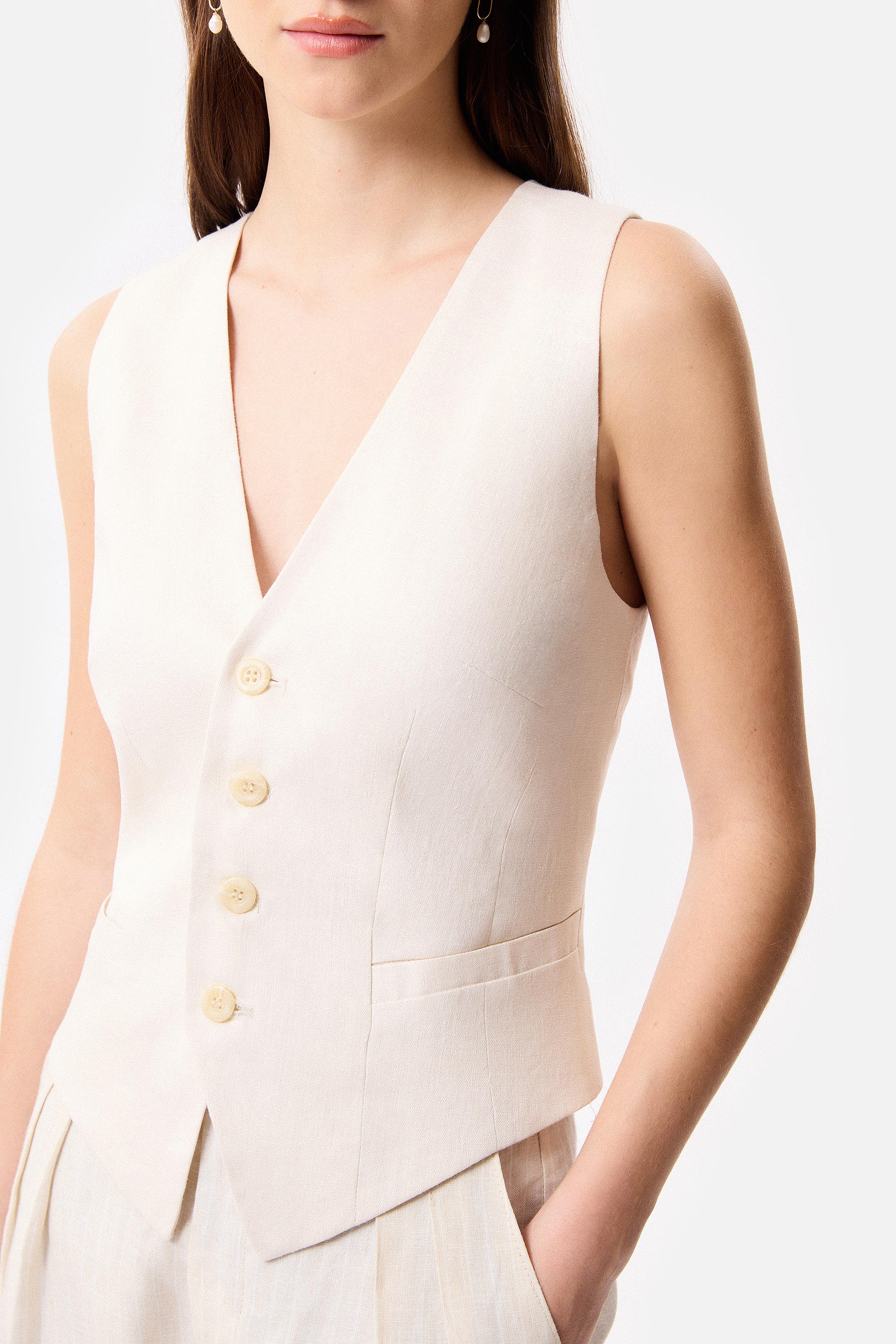 • Chaleco sastrero de lino marfil con las terminaciones frontales desflecadas y 4 botones a tono.