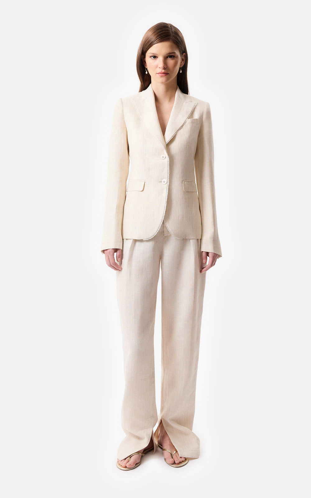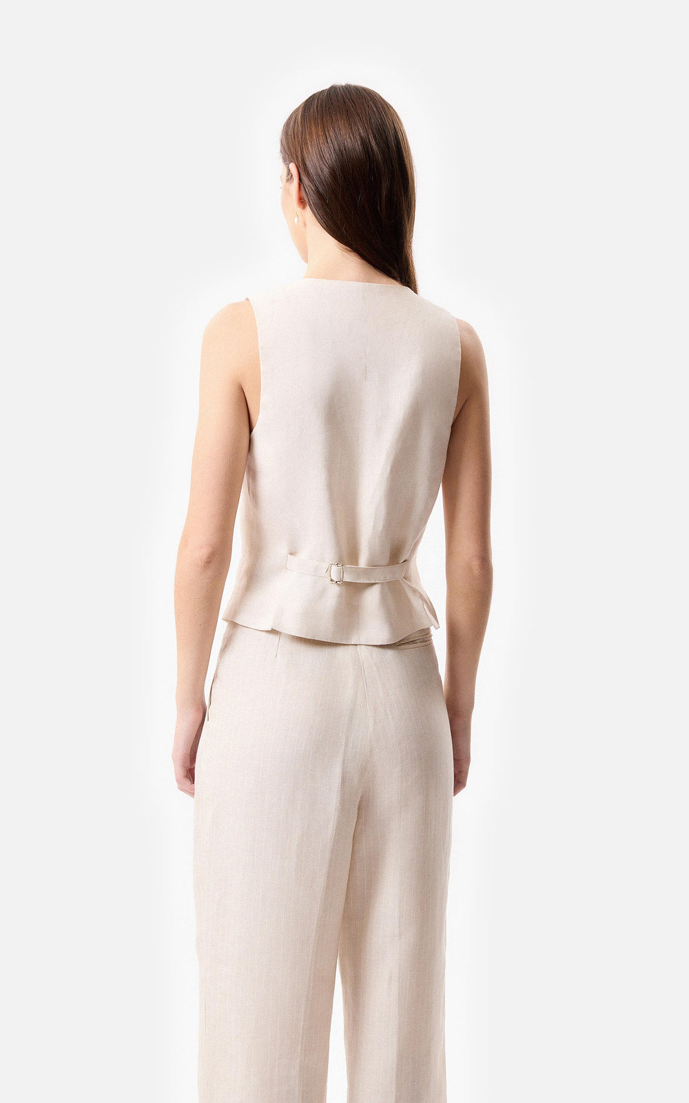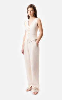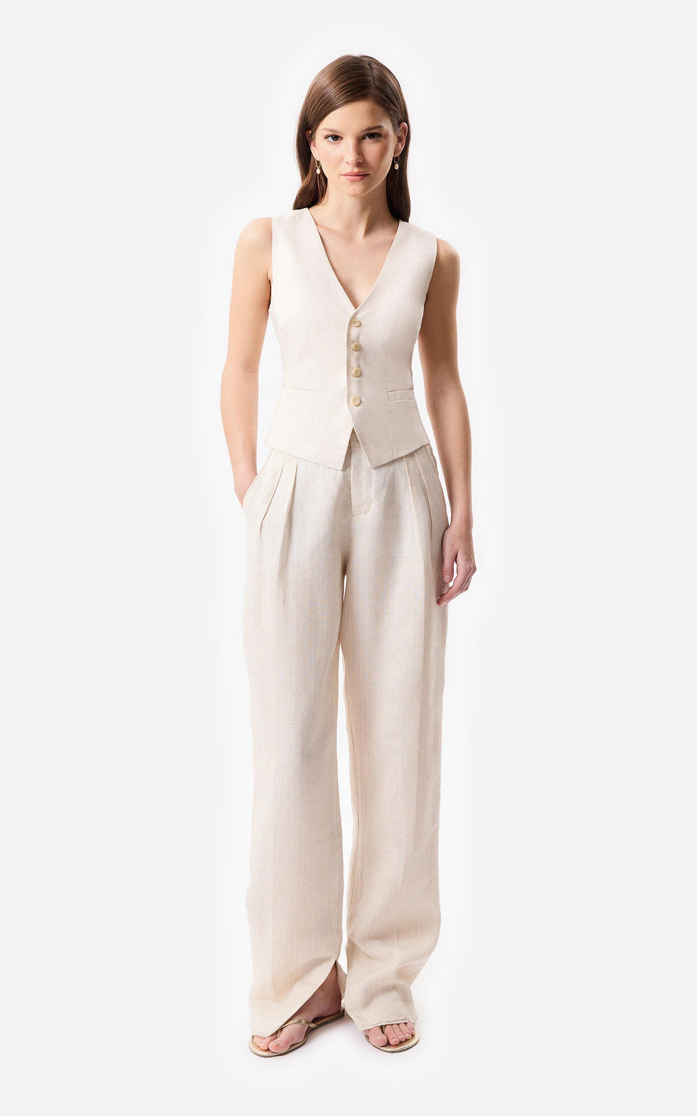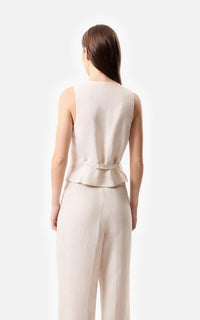 • Chaleco sastrero de lino marfil con las terminaciones frontales desflecadas y 4 botones a tono.
