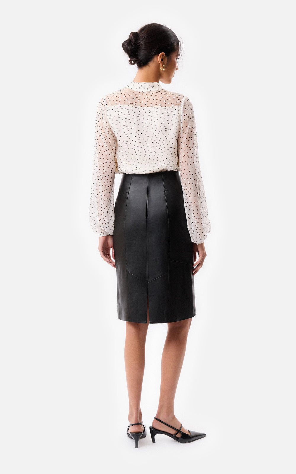 • Su estructura de recortes esculpe la silueta con precisión y define una línea limpia que cae justo por debajo de la rodilla.