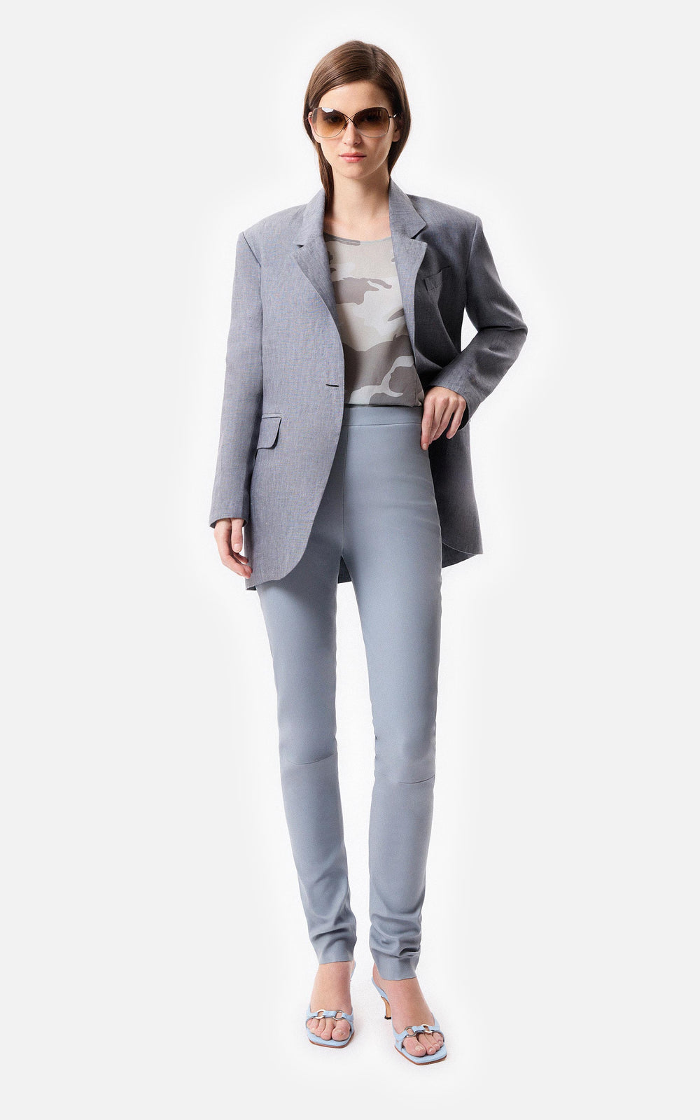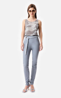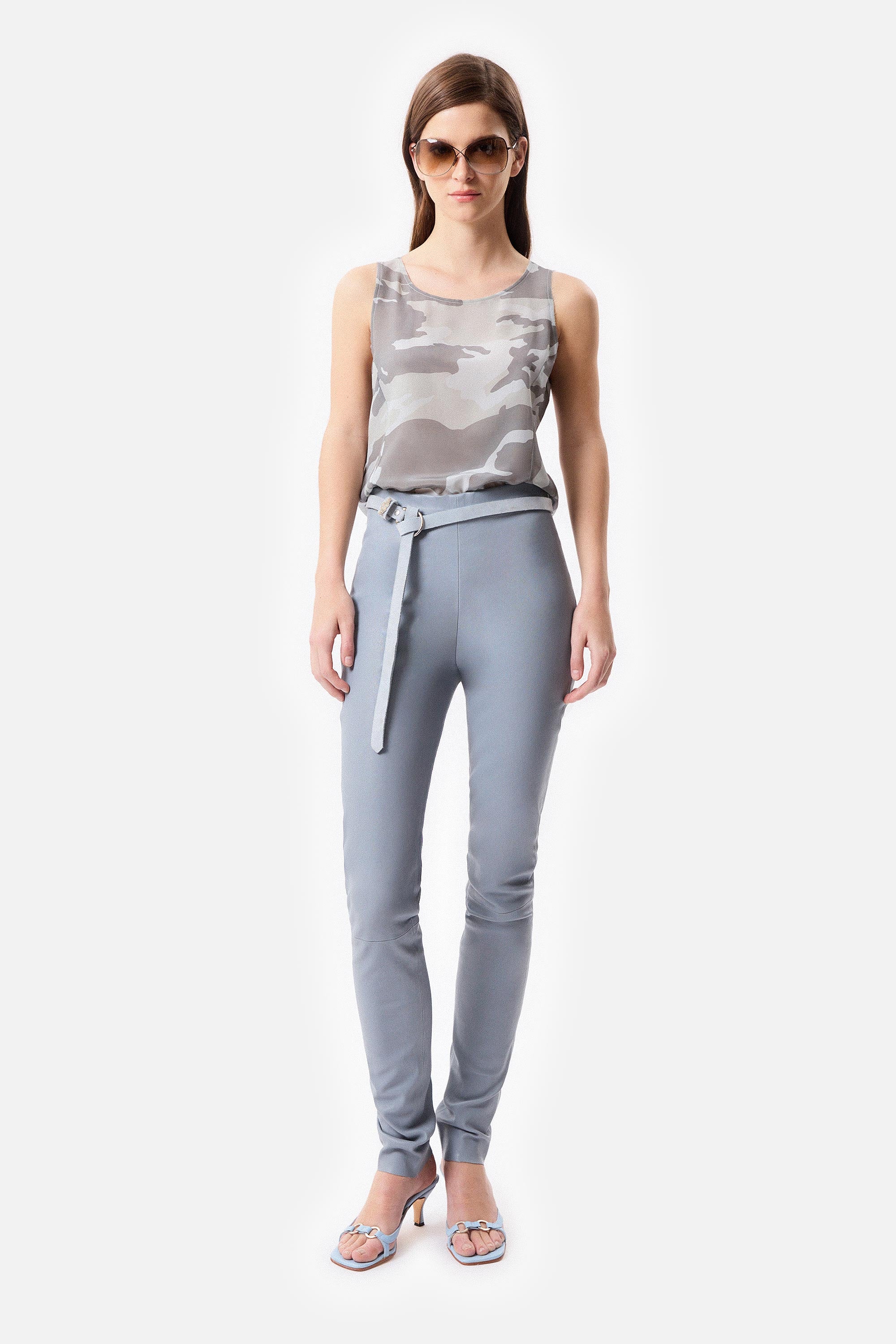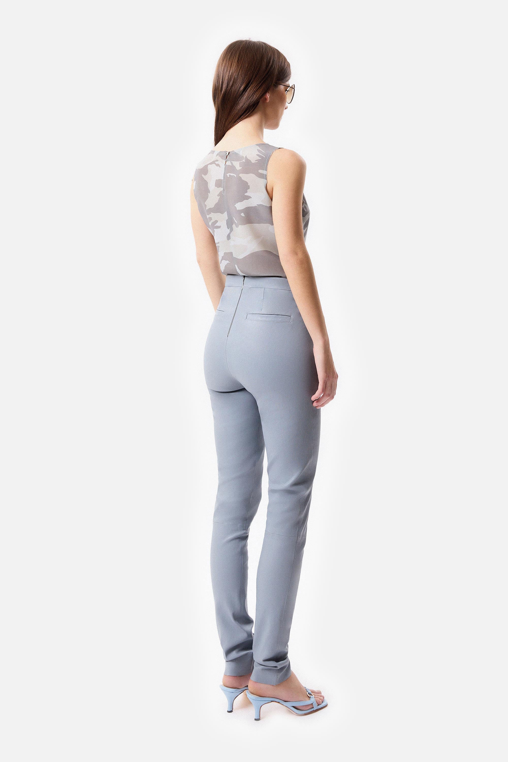 • Legging de cuero celeste de napa de oveja con recortes y cierre invisible.