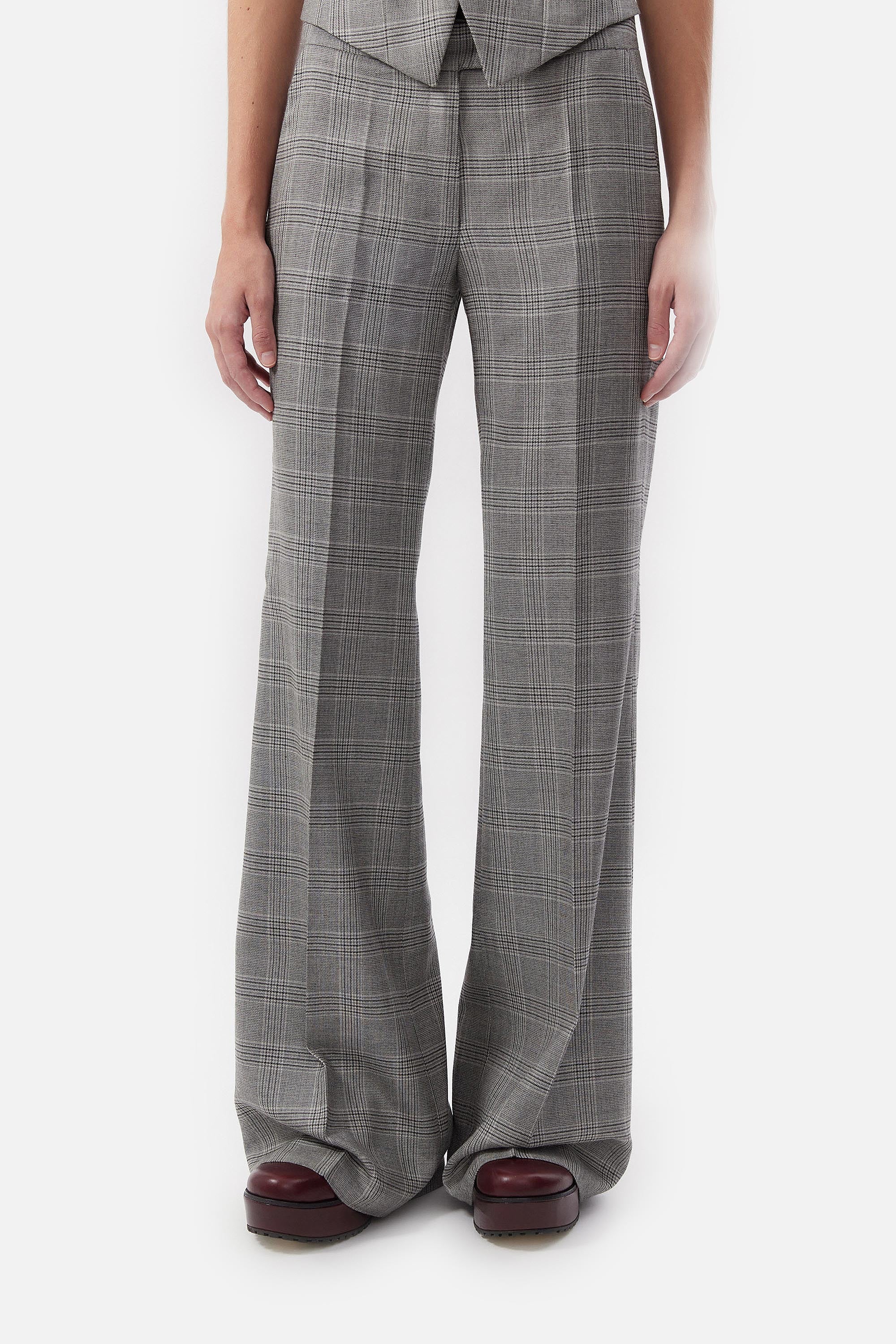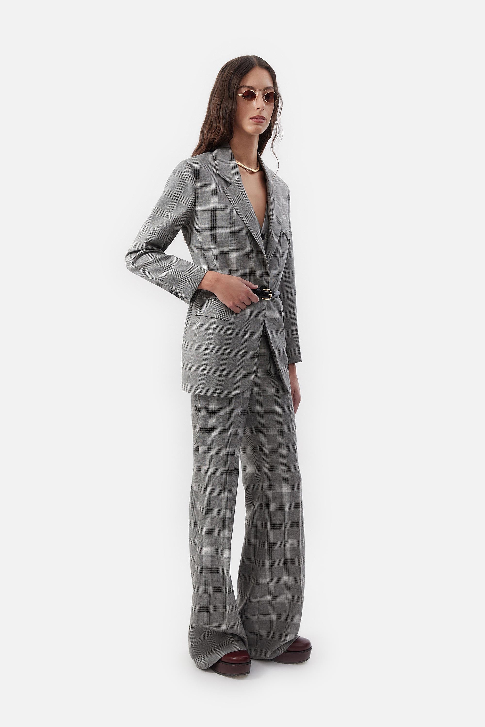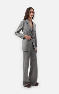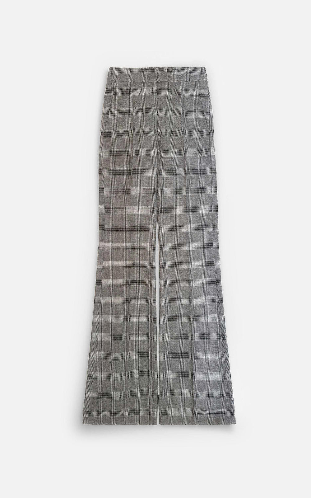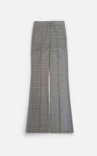 • Pantalon oxford confeccionado en pura lana príncipe de gales con cierre delantero y gancho pantalonero.