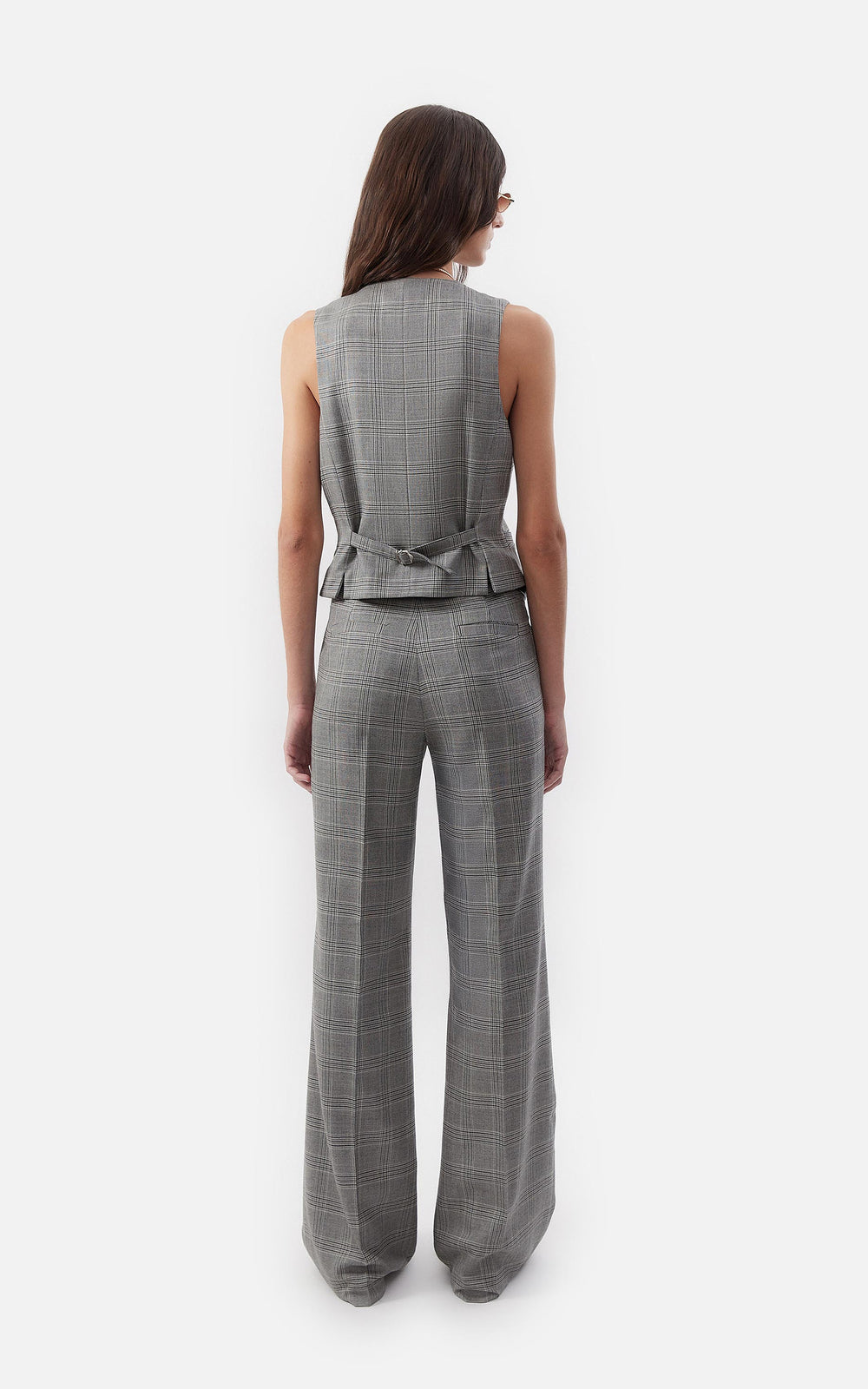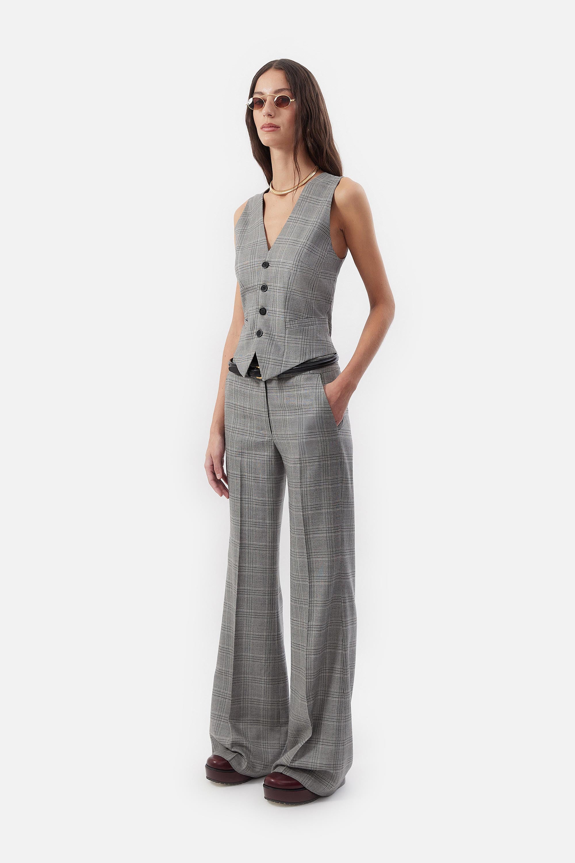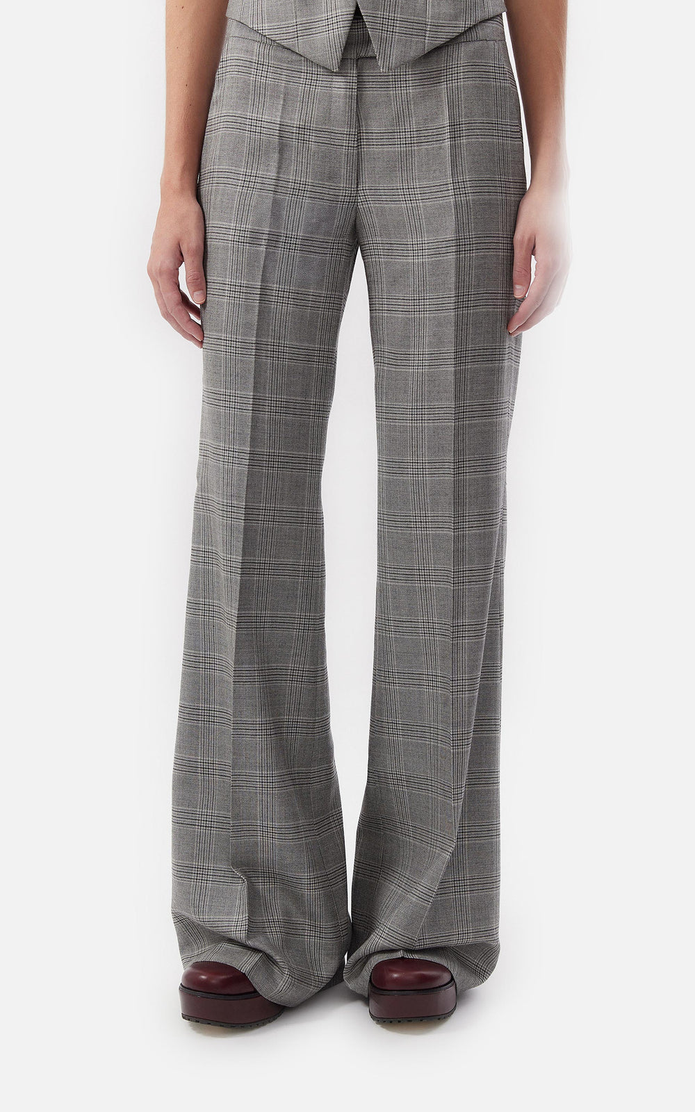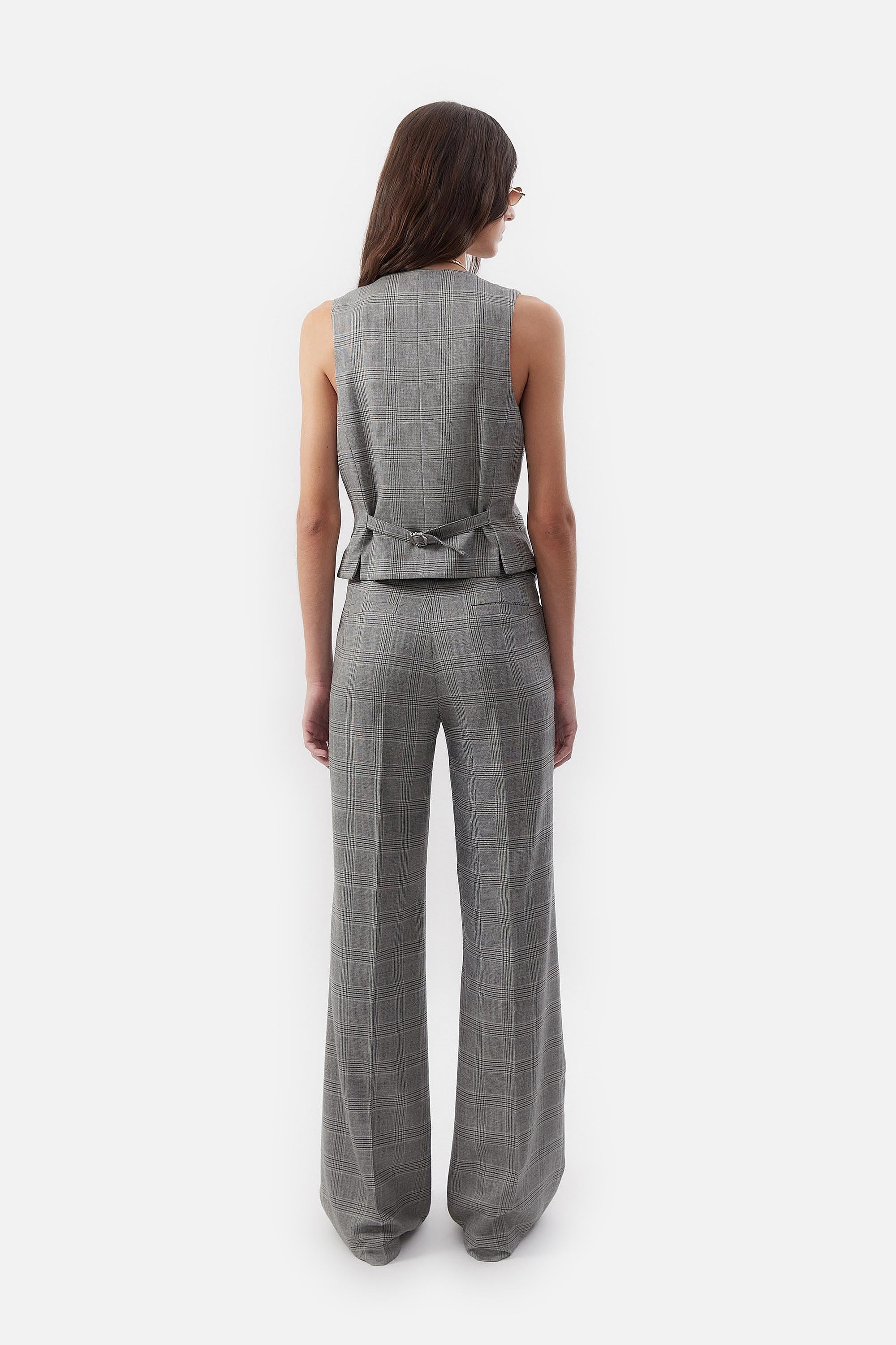 • Pantalon oxford confeccionado en pura lana príncipe de gales con cierre delantero y gancho pantalonero.