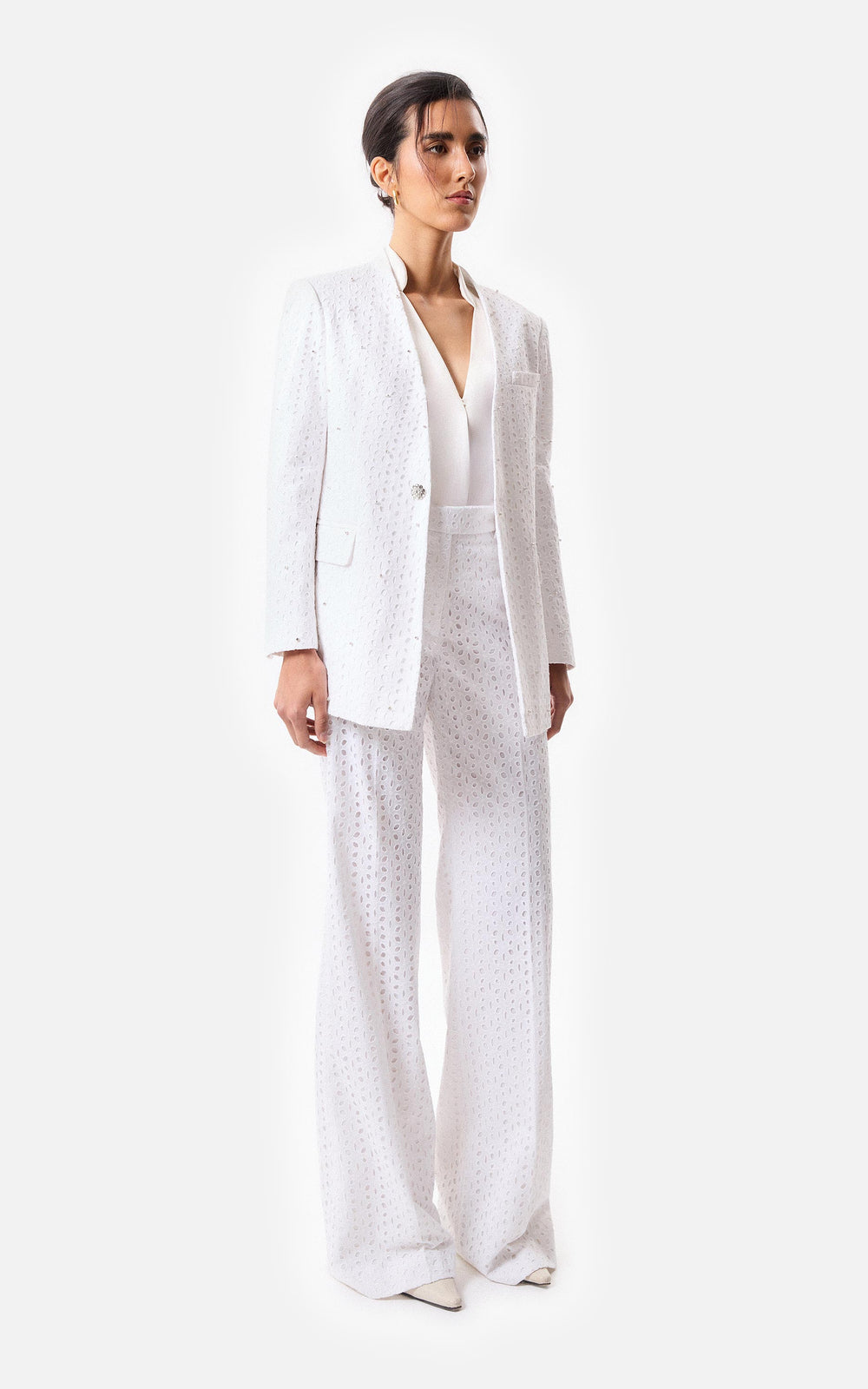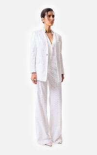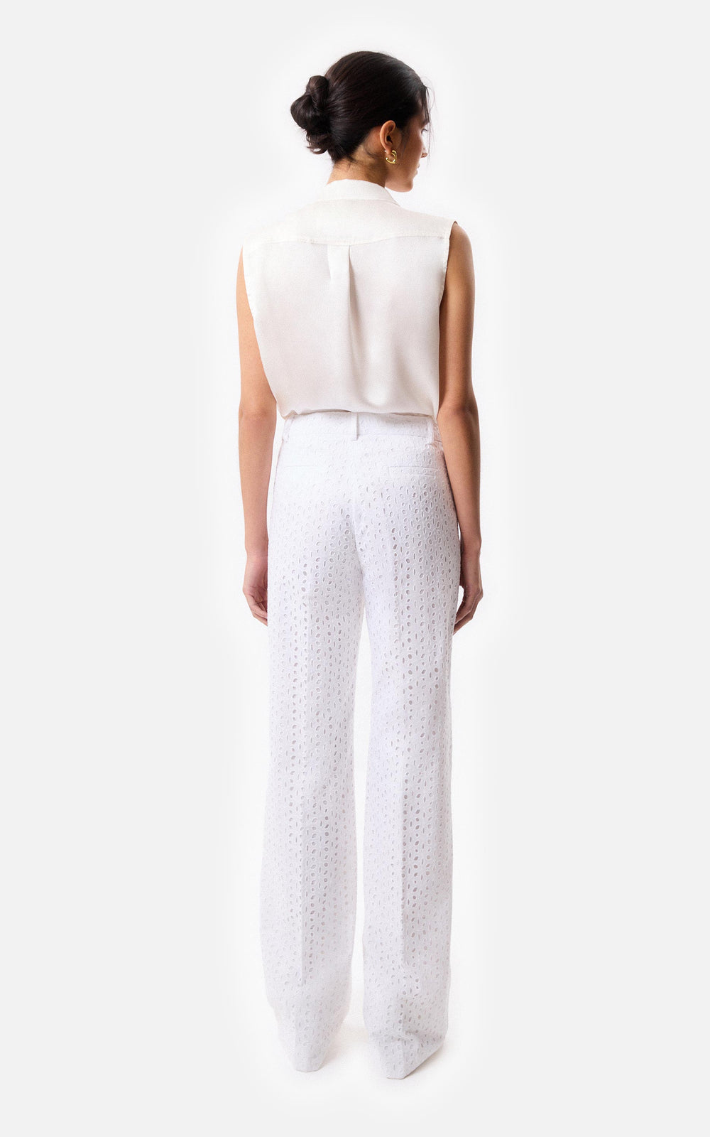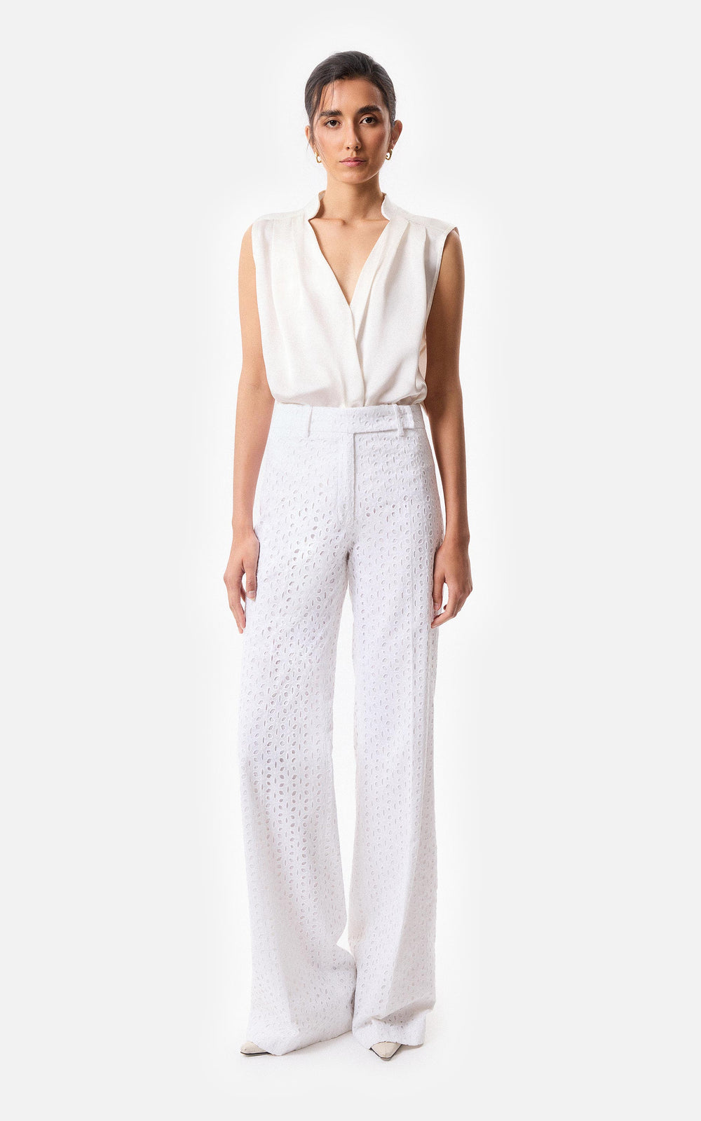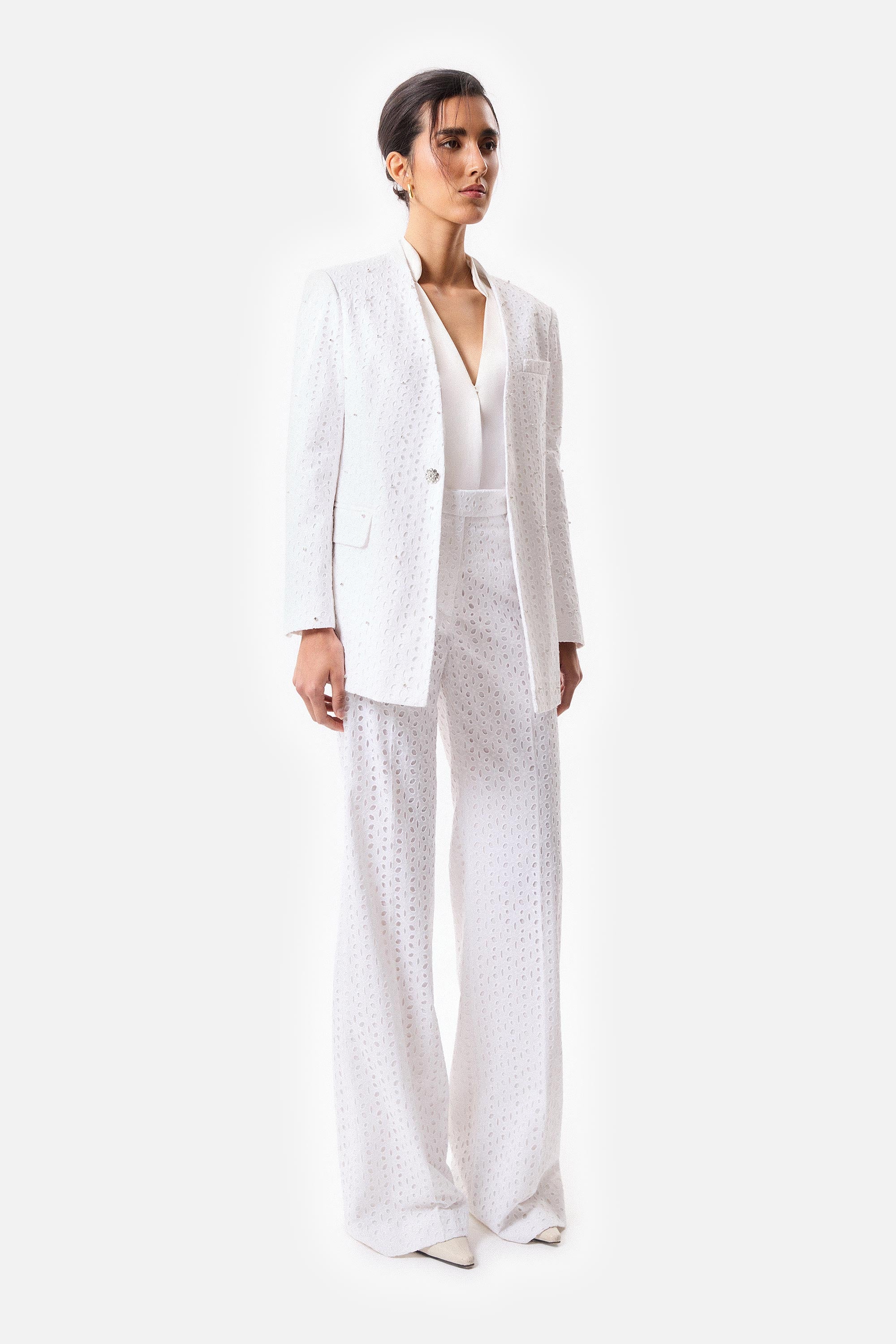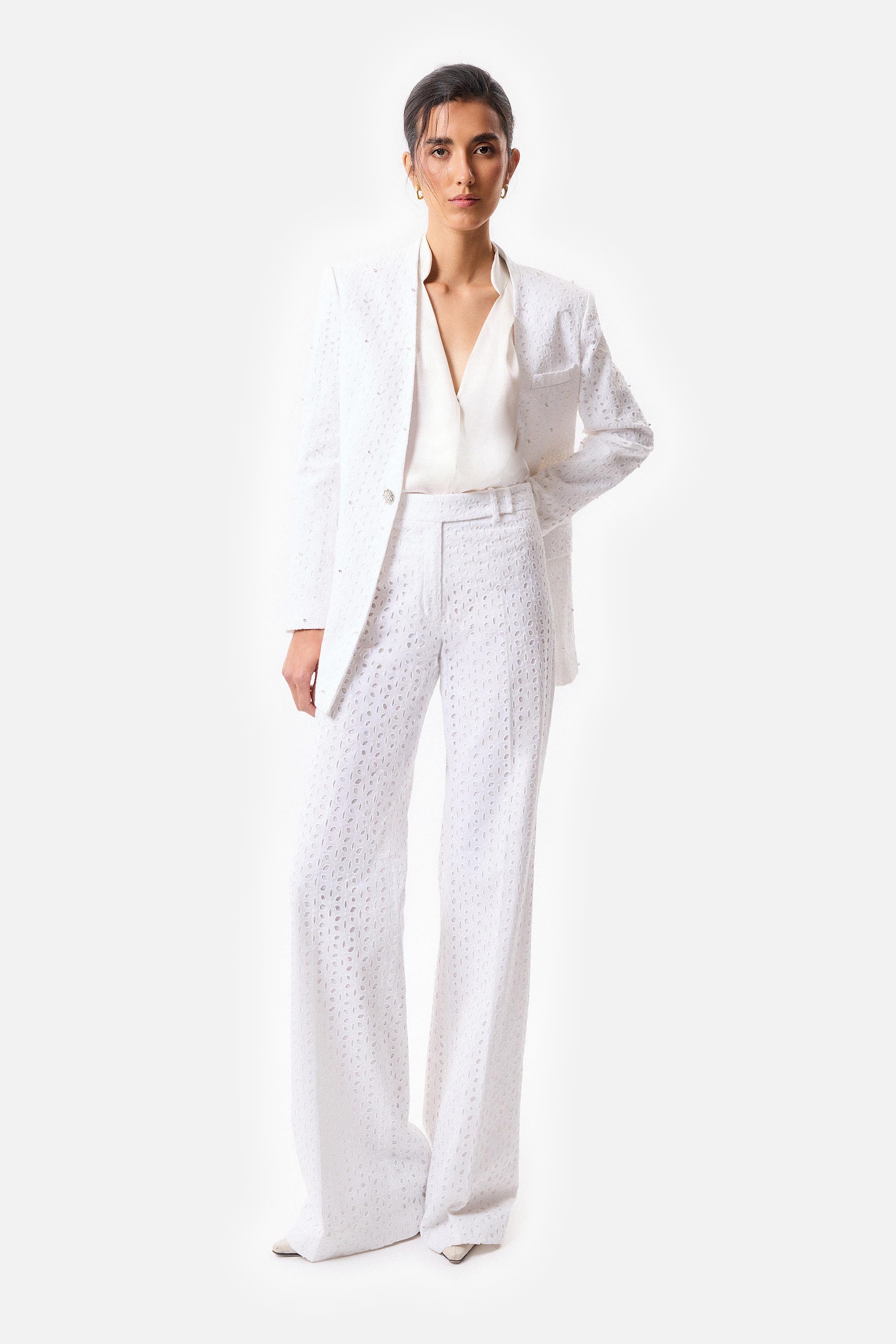 • Pantalón recto de broderie con cierre y gancho pantalonero, forrado en voile.
