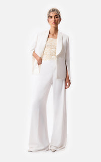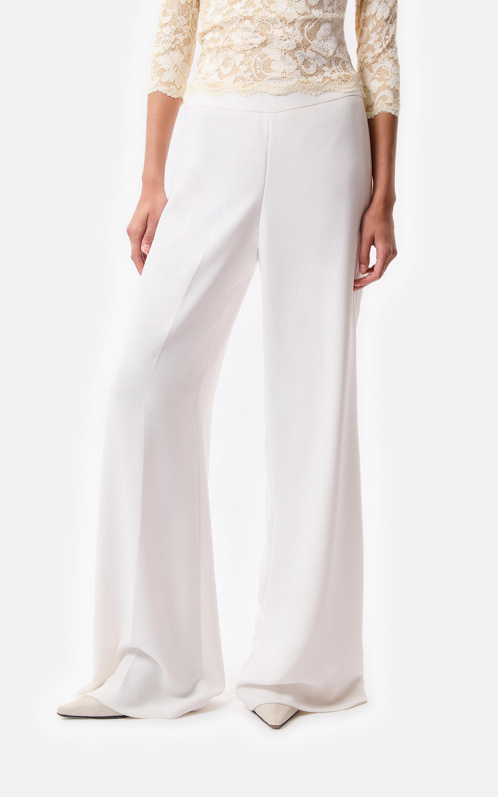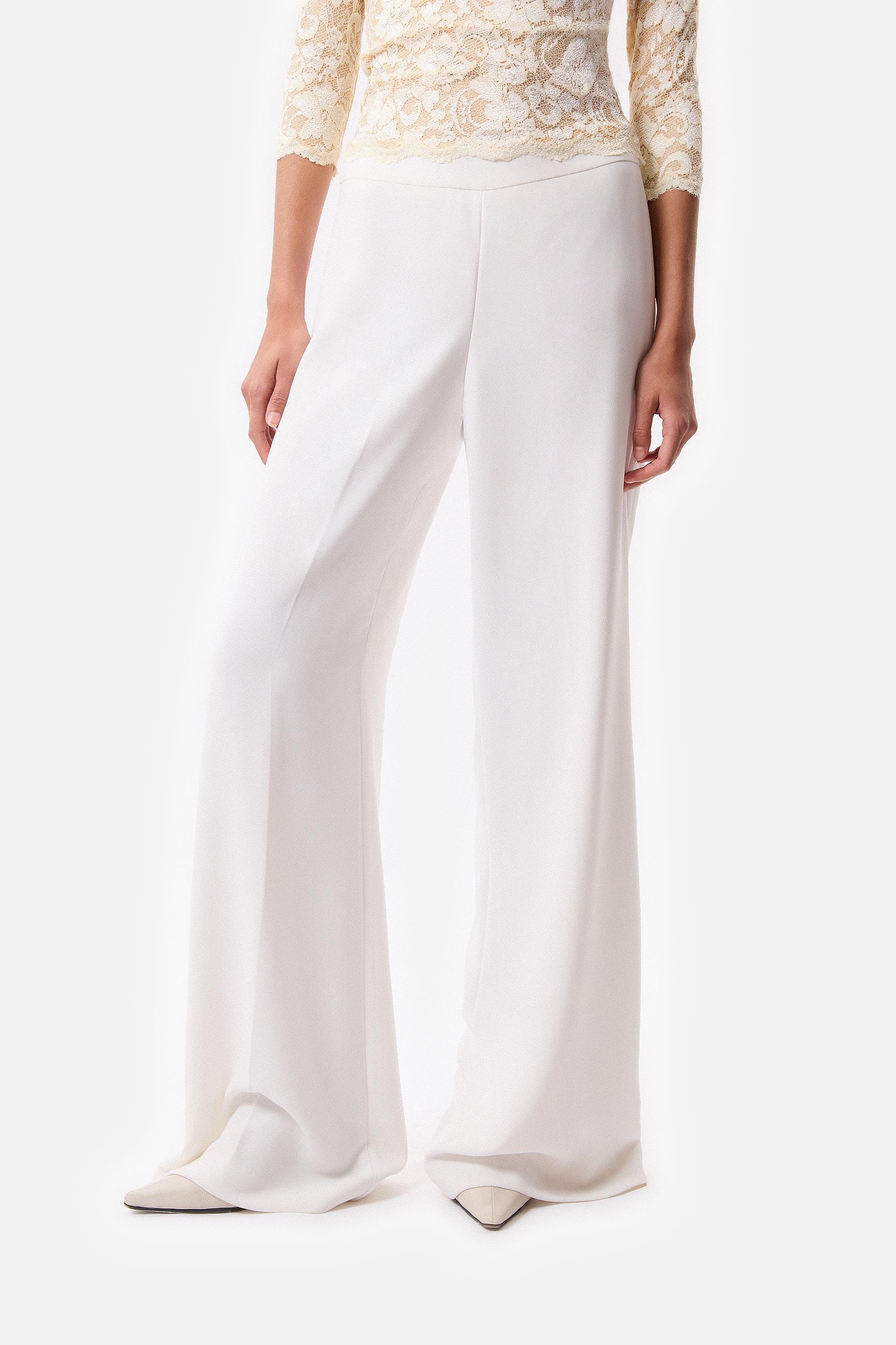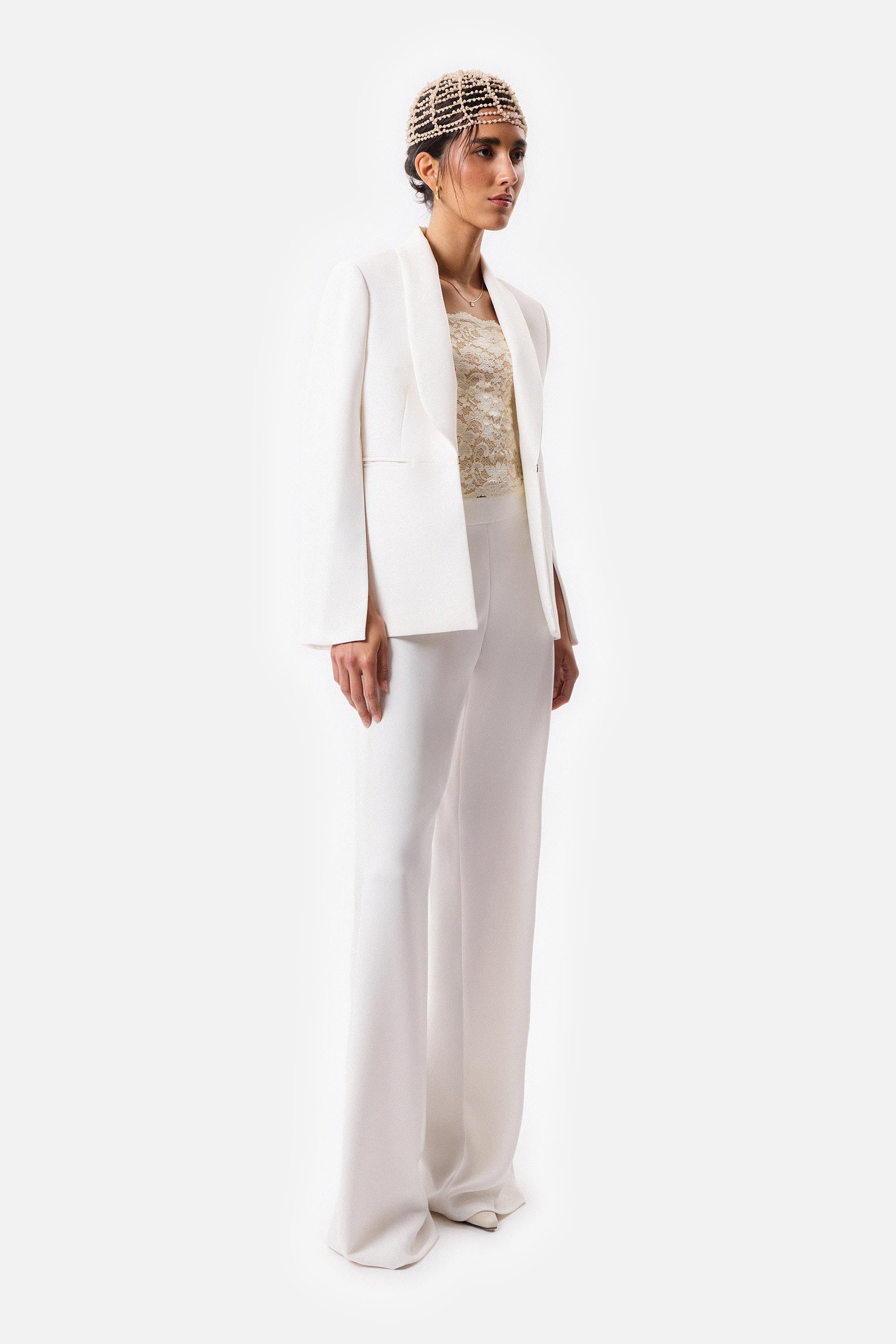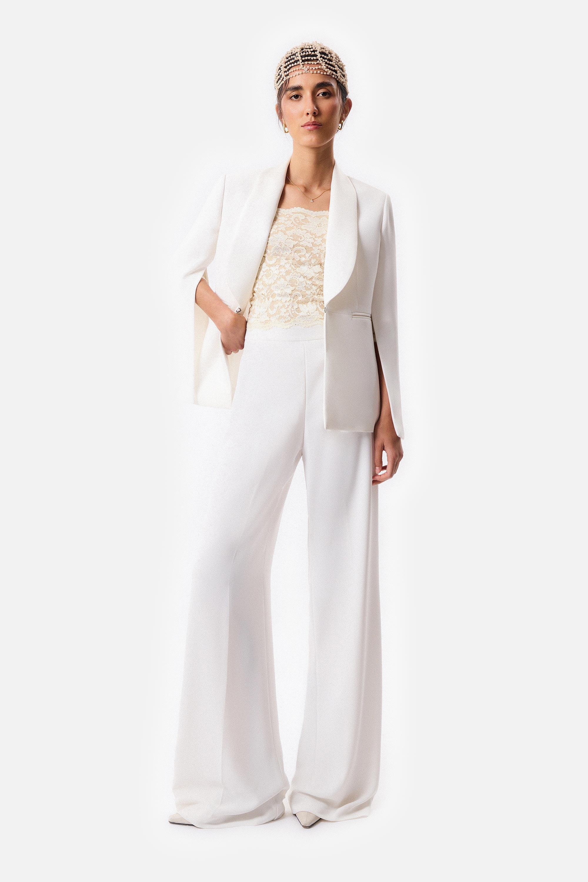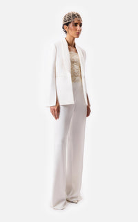 • Pantalón smoking con banda lateral de raso duchesse off white, sin bolsillos y con cierre invisible.