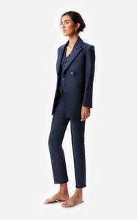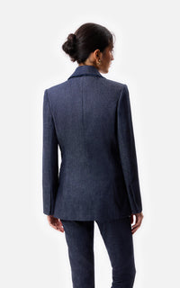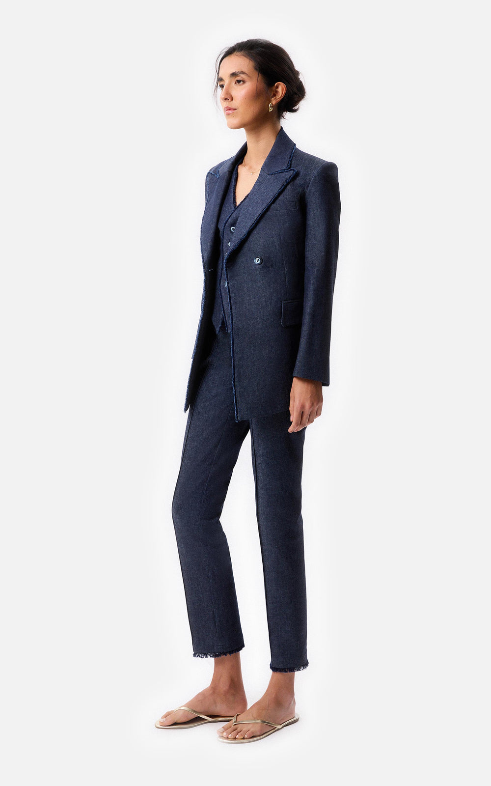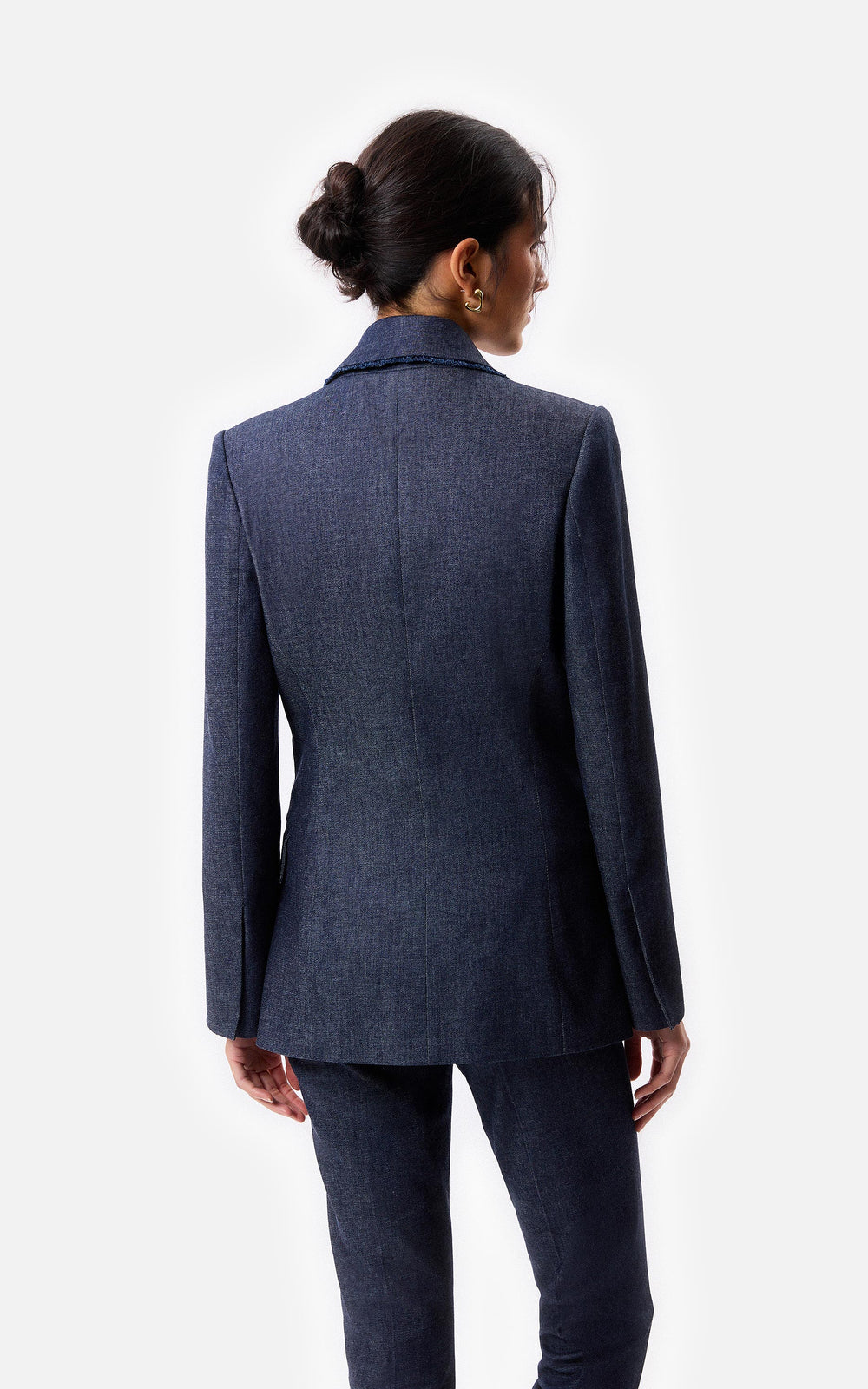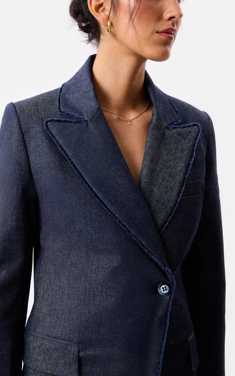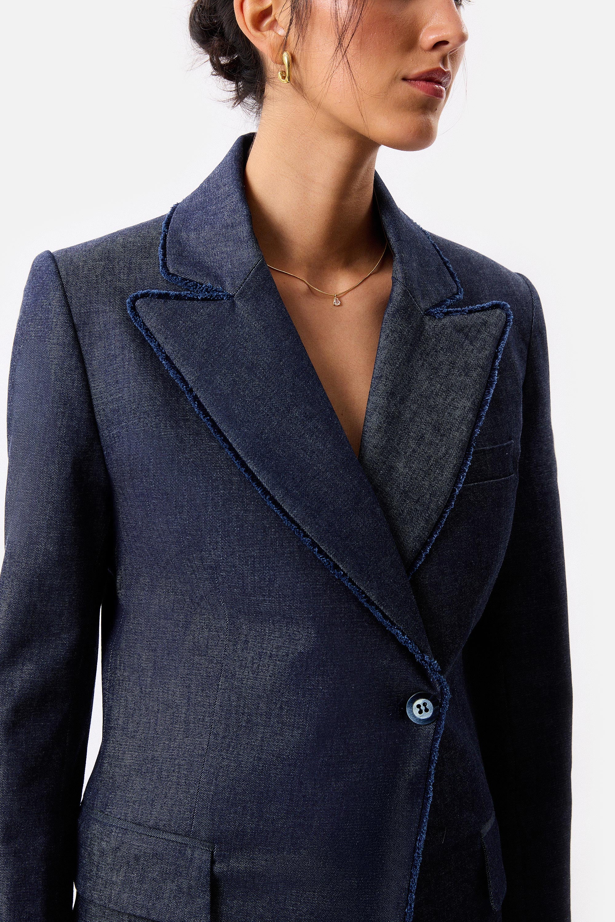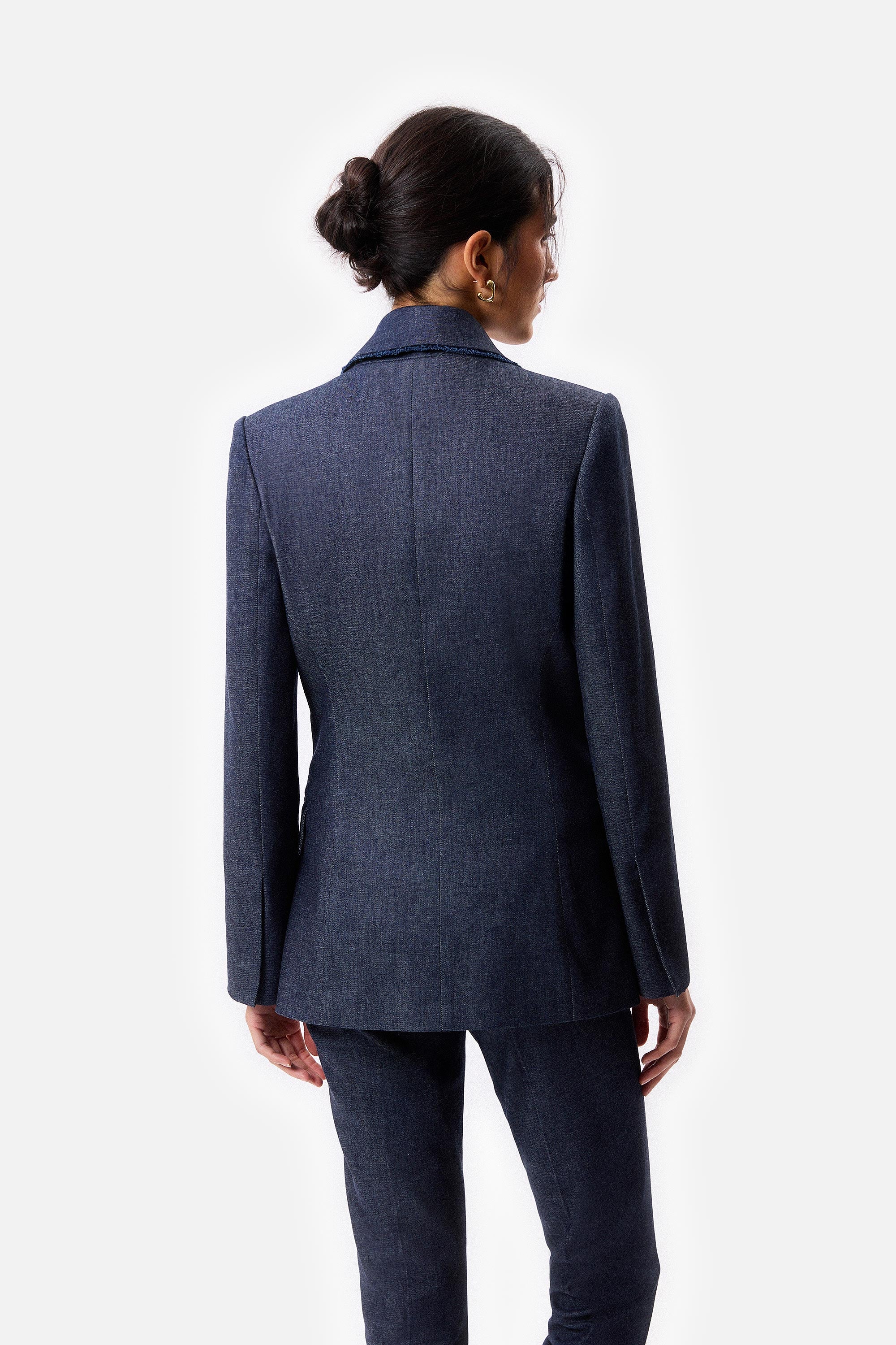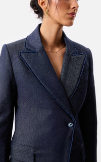 • Saco cruzado de mezclilla con sus terminaciones desflecadas y botones de nácar.