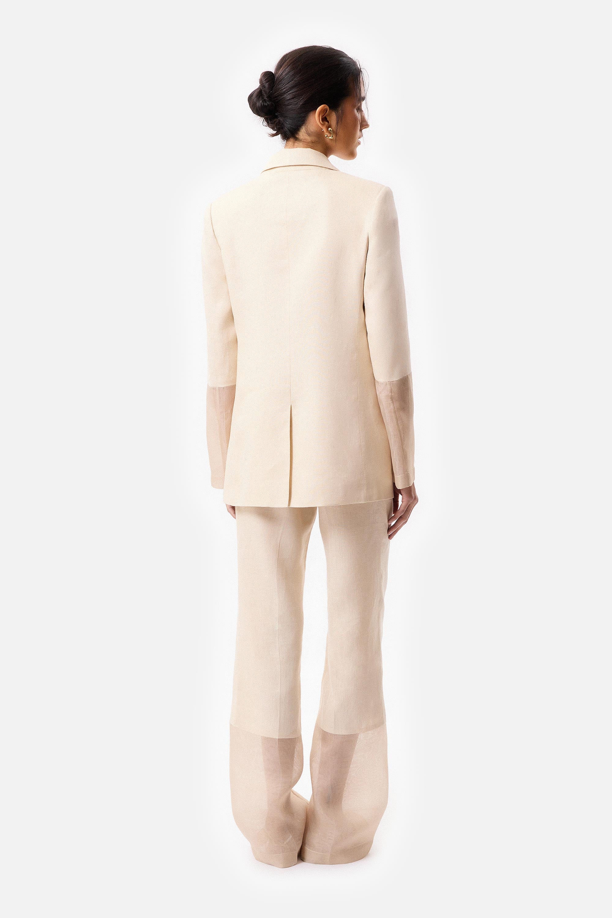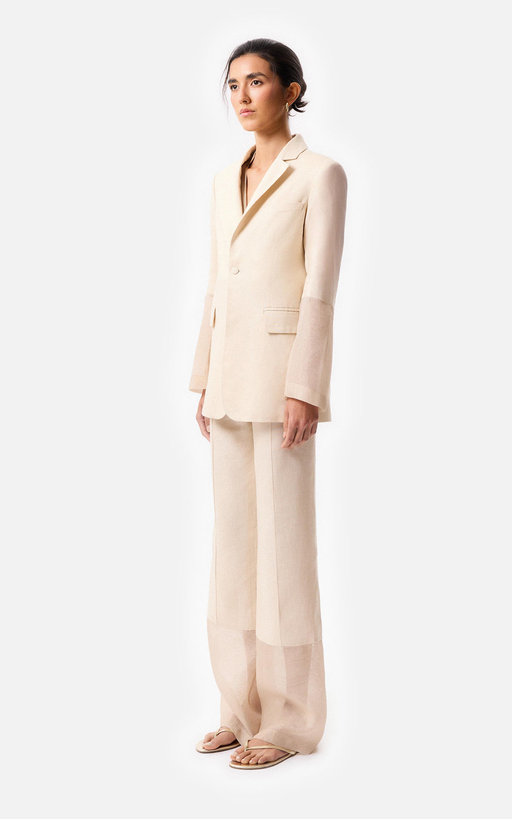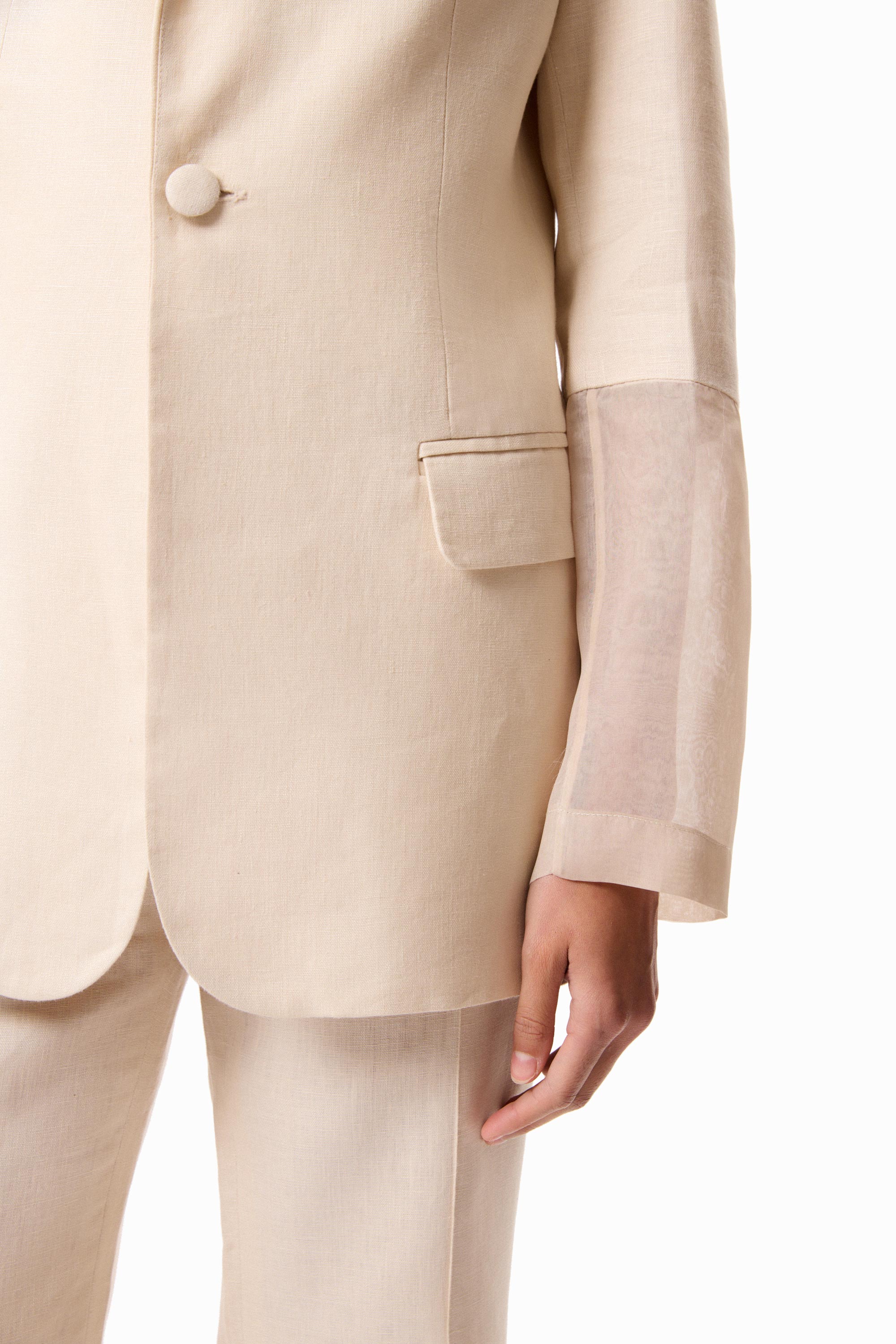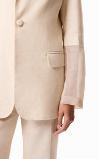 • Saco recto de lino con recorte de organza en la manga. La apertura frontal es con un botón forrado.