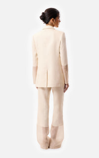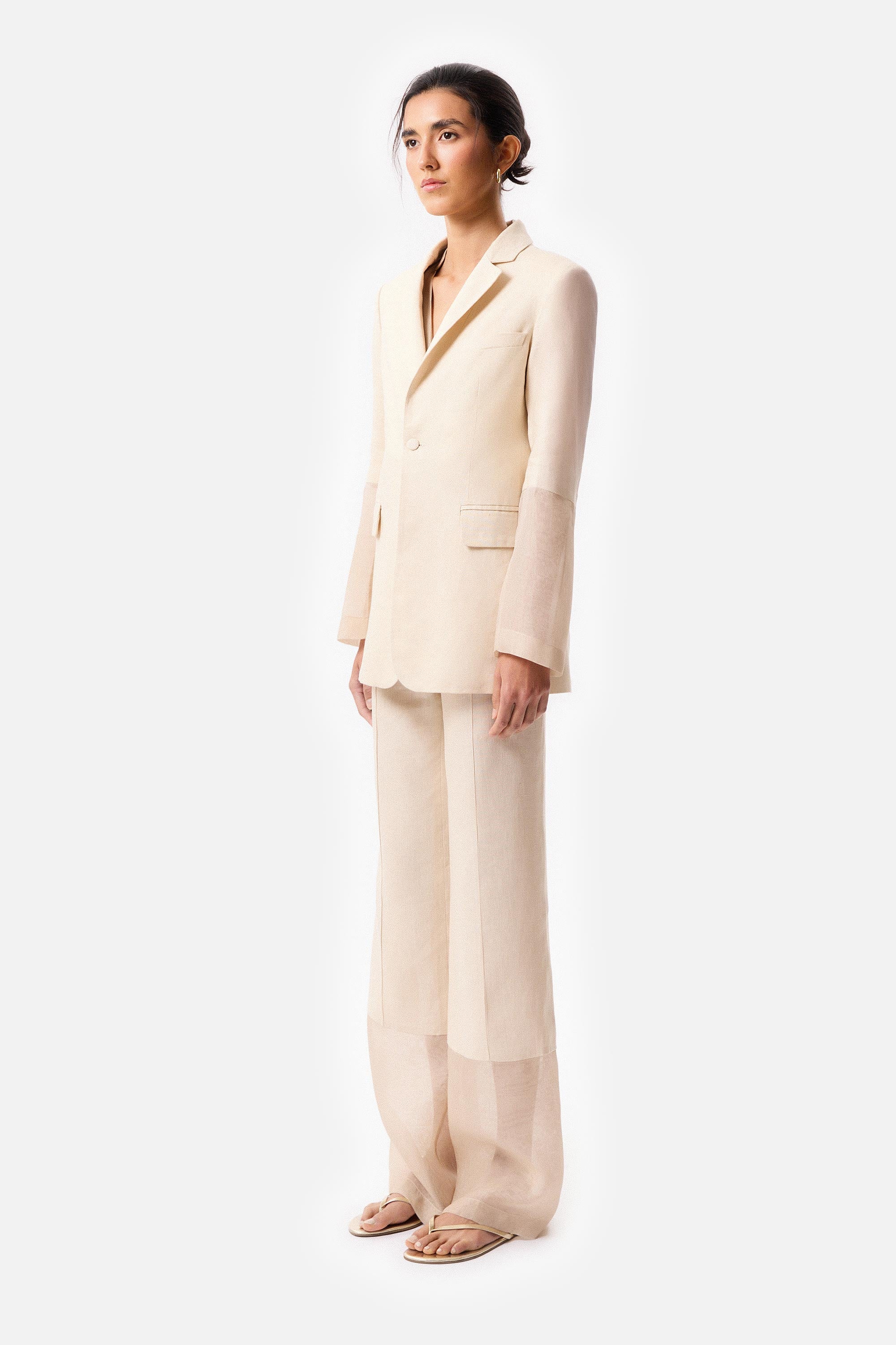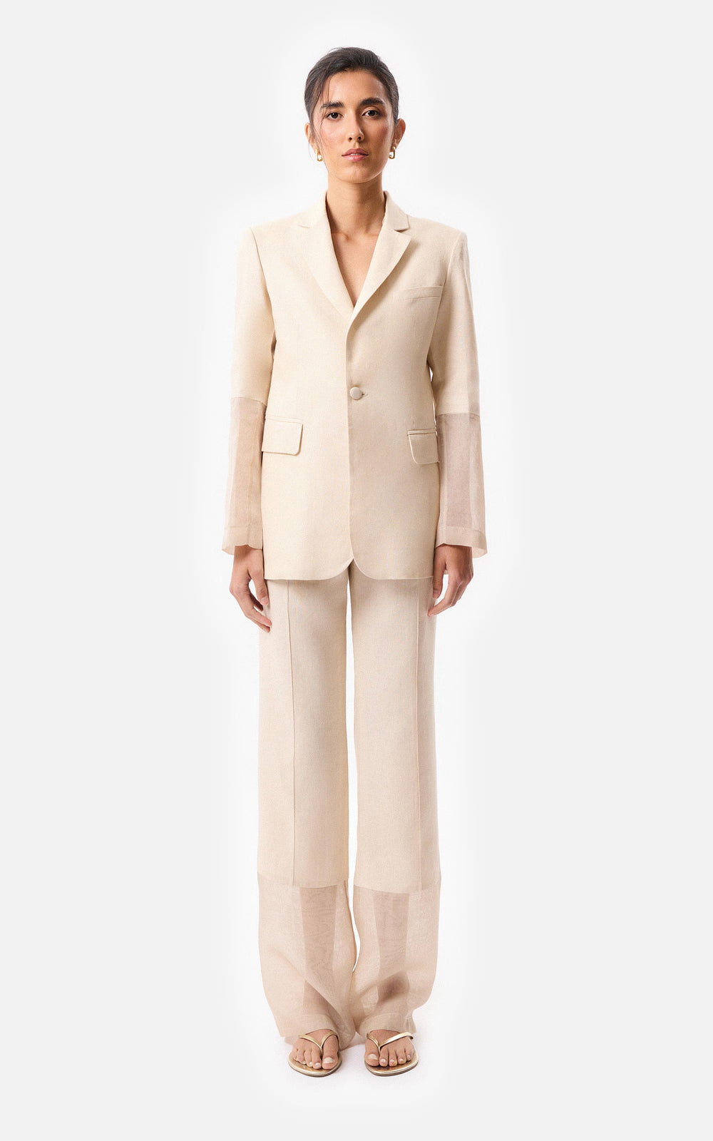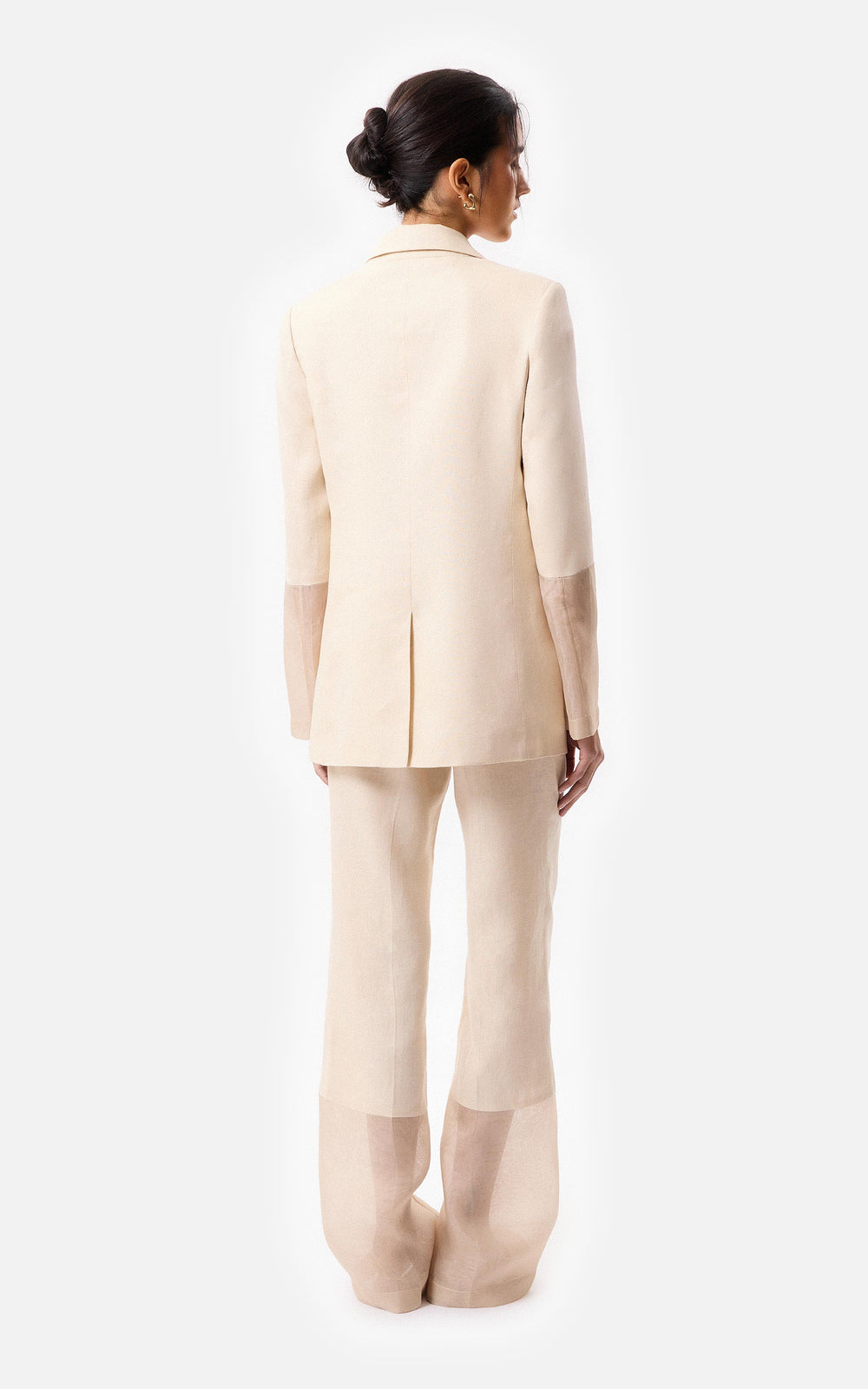 • Saco recto de lino con recorte de organza en la manga. La apertura frontal es con un botón forrado.