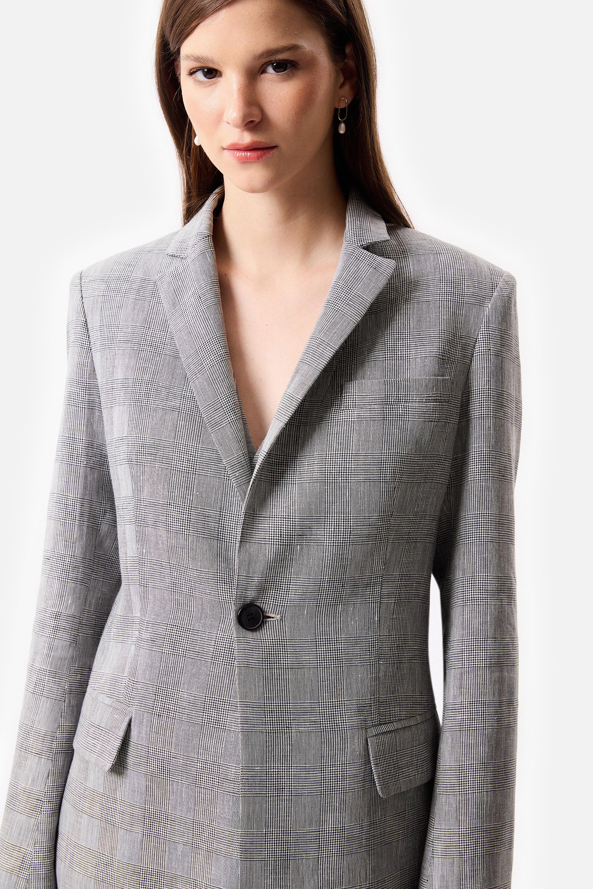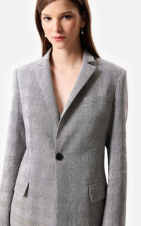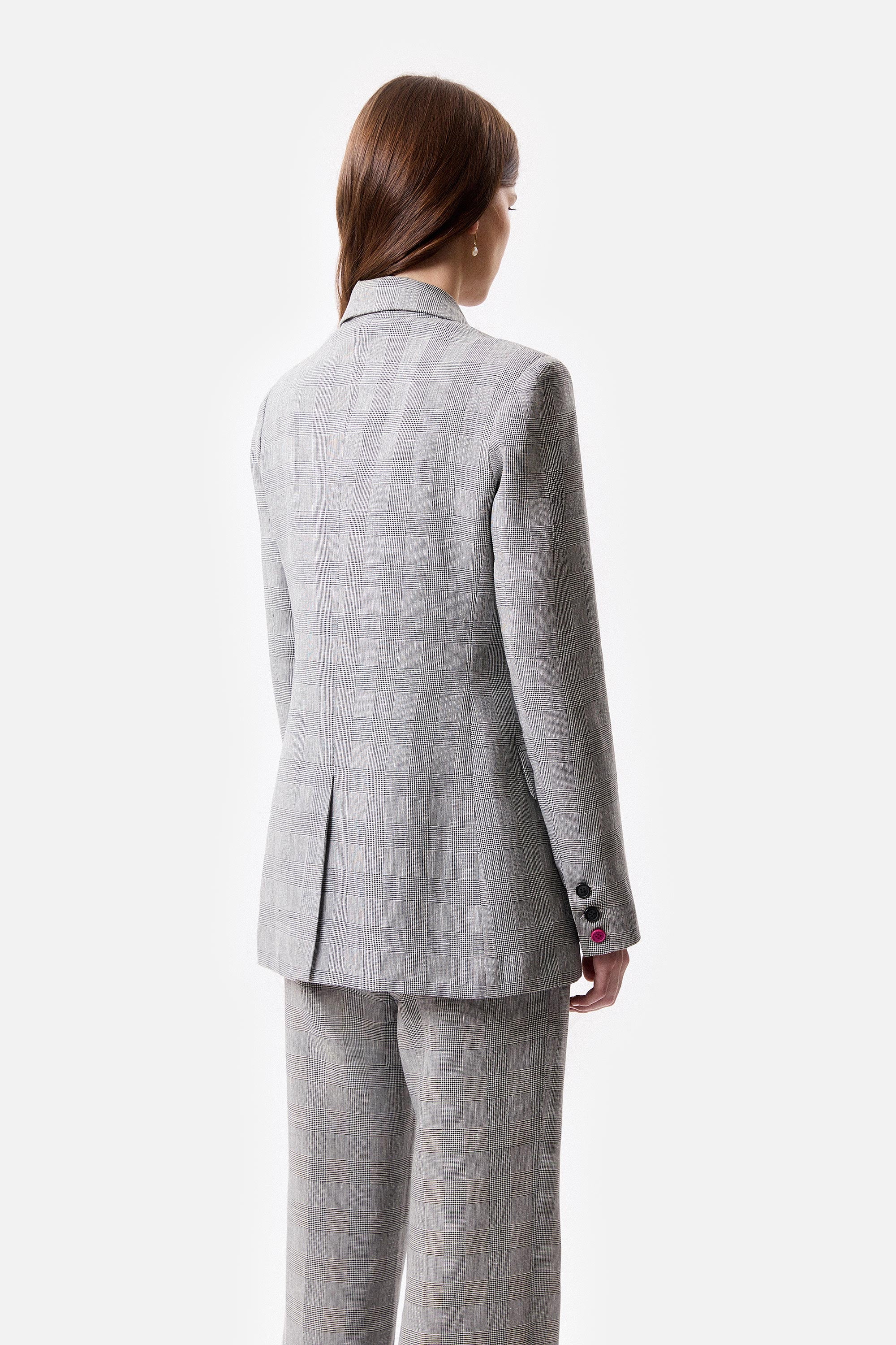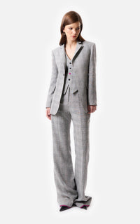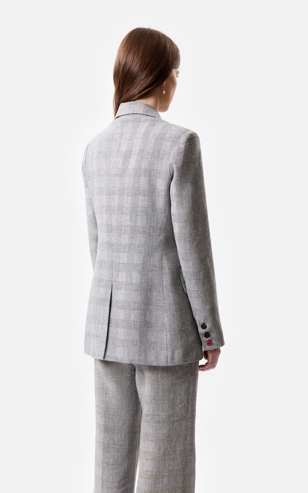 • Saco recto príncipe de Gales. Forrado en satén, color frambuesa.