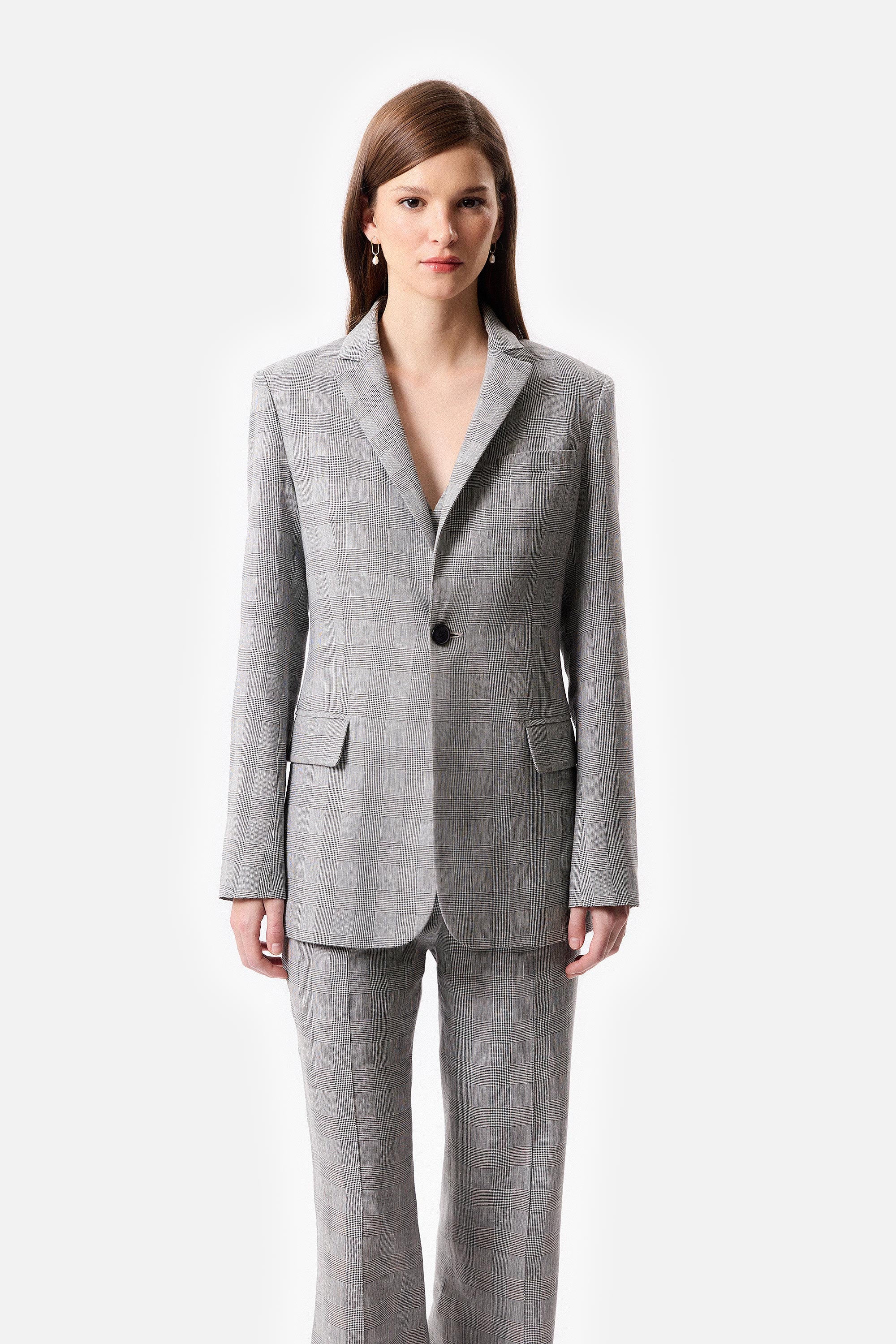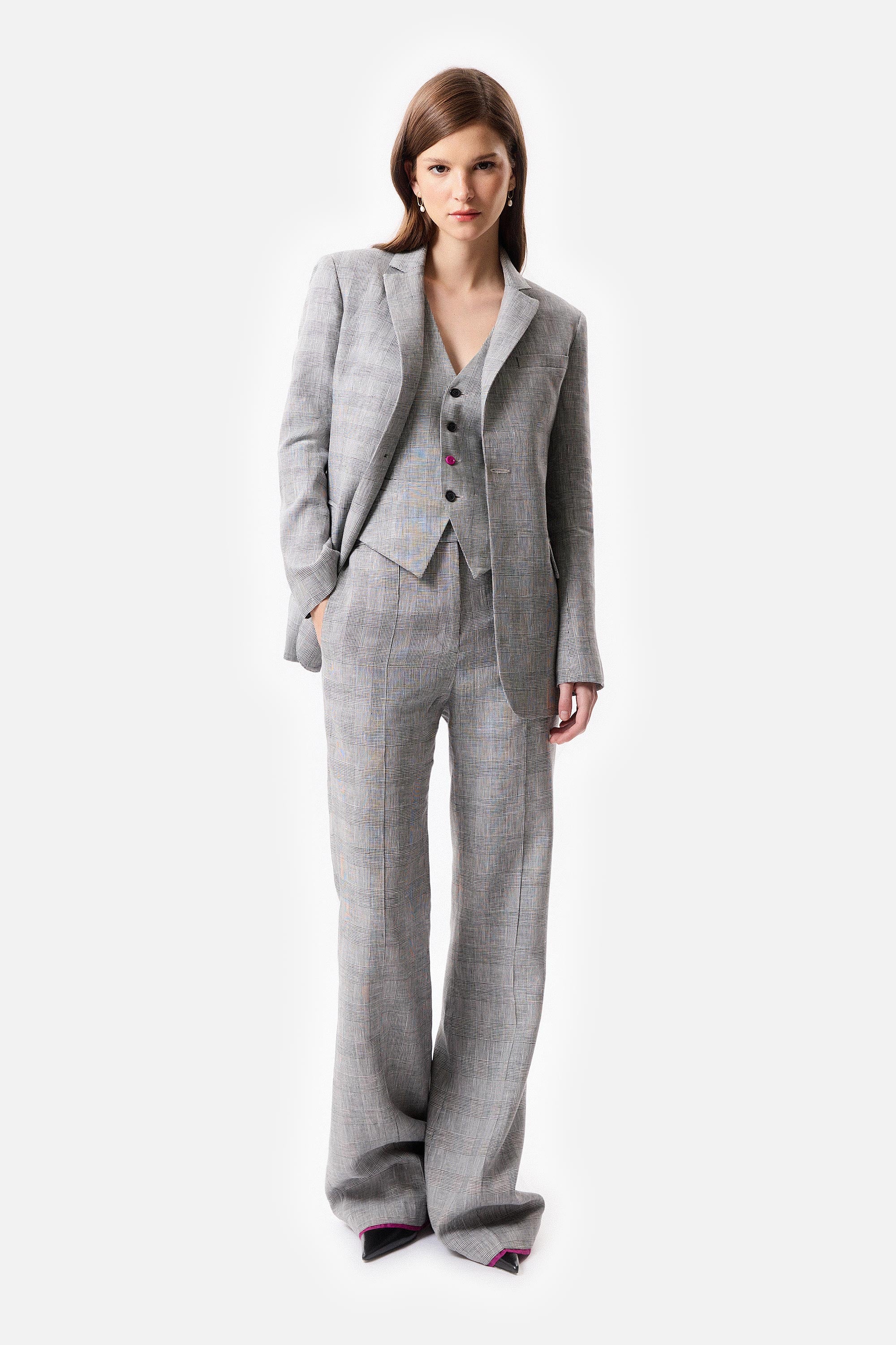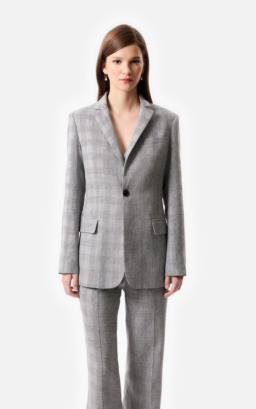• Saco recto príncipe de Gales. Forrado en satén, color frambuesa.