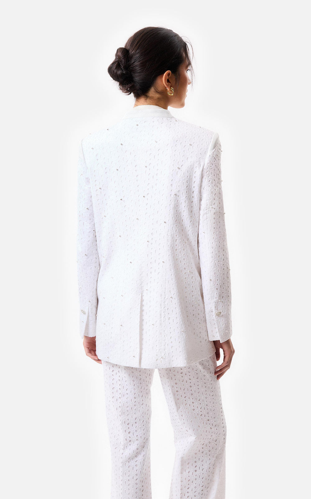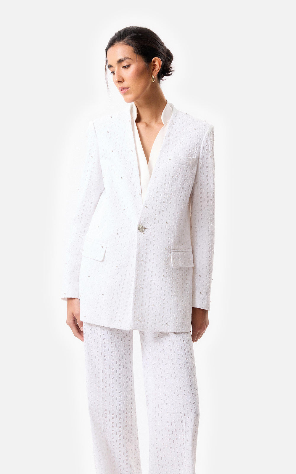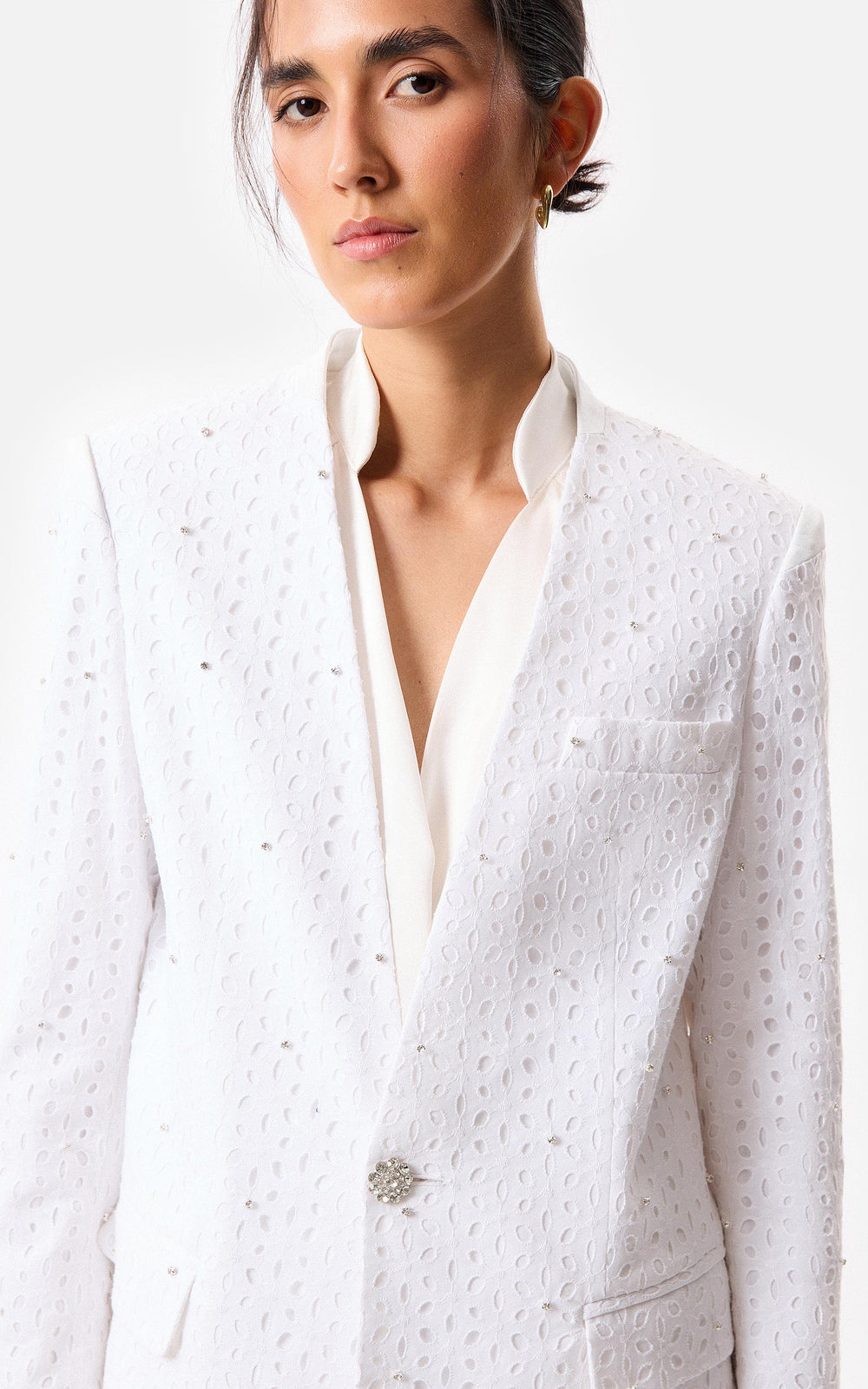 • Saco recto sin solapa de broderie y cuero, con bordado de strass y botones joya.