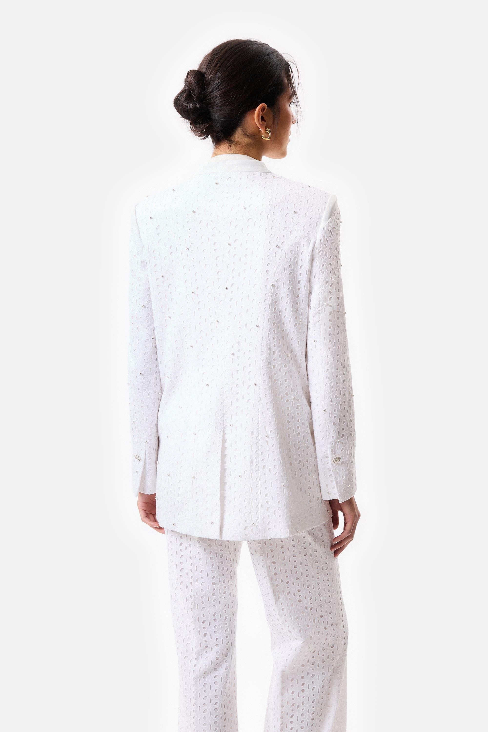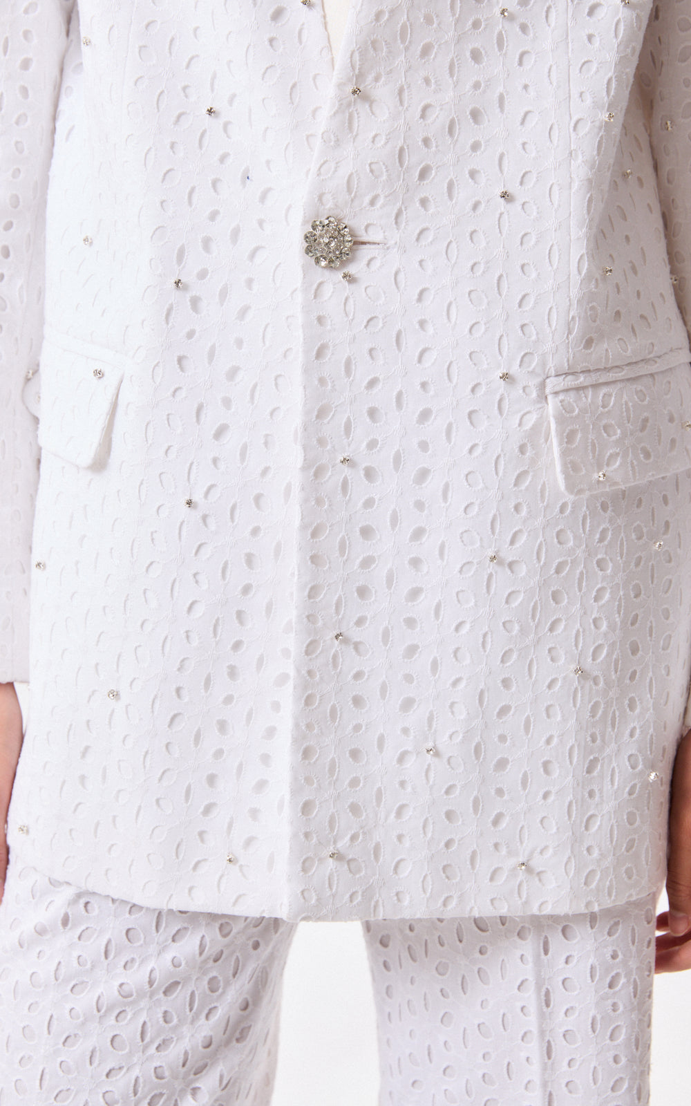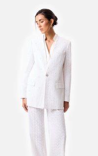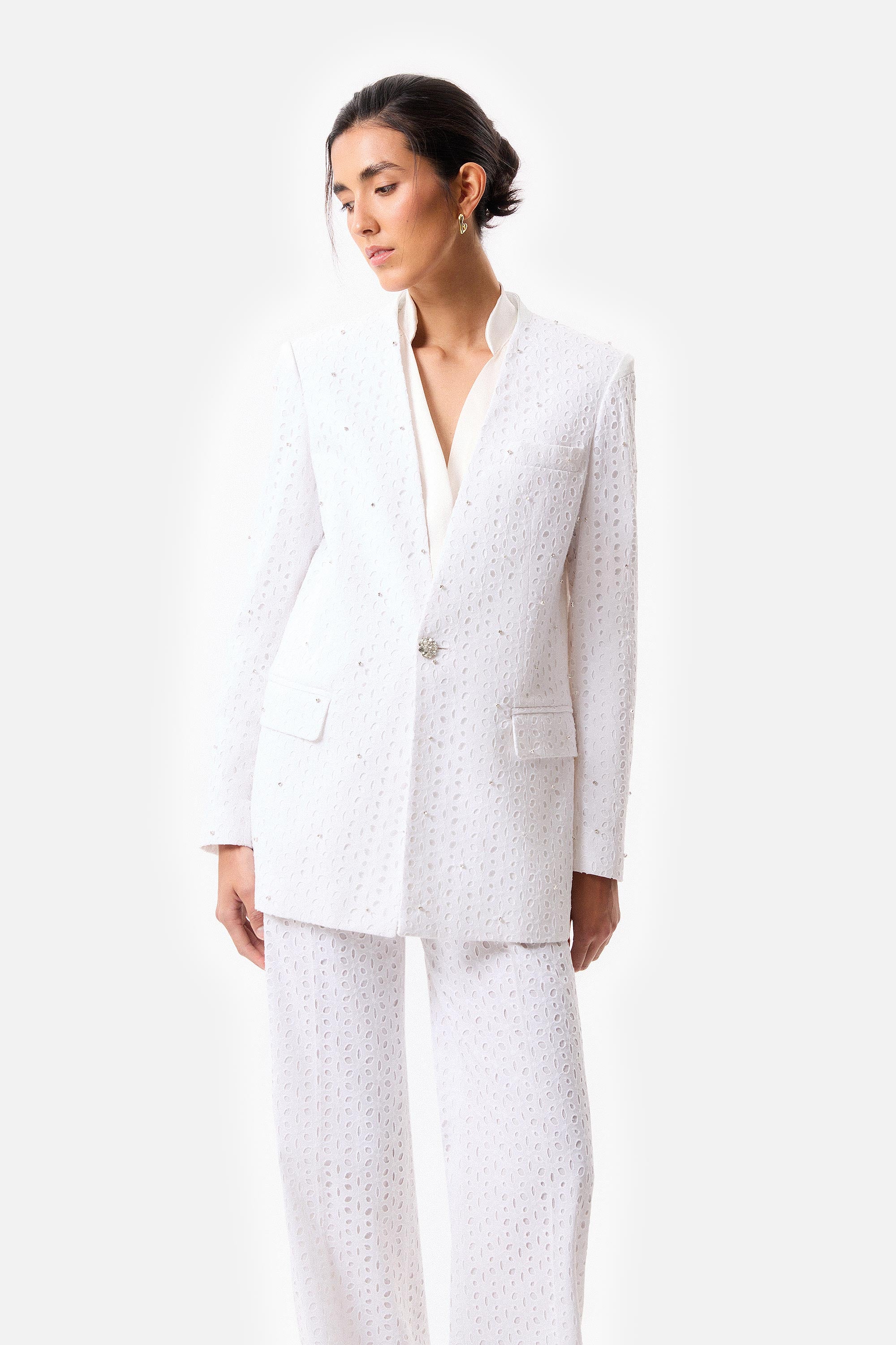 • Saco recto sin solapa de broderie y cuero, con bordado de strass y botones joya.