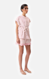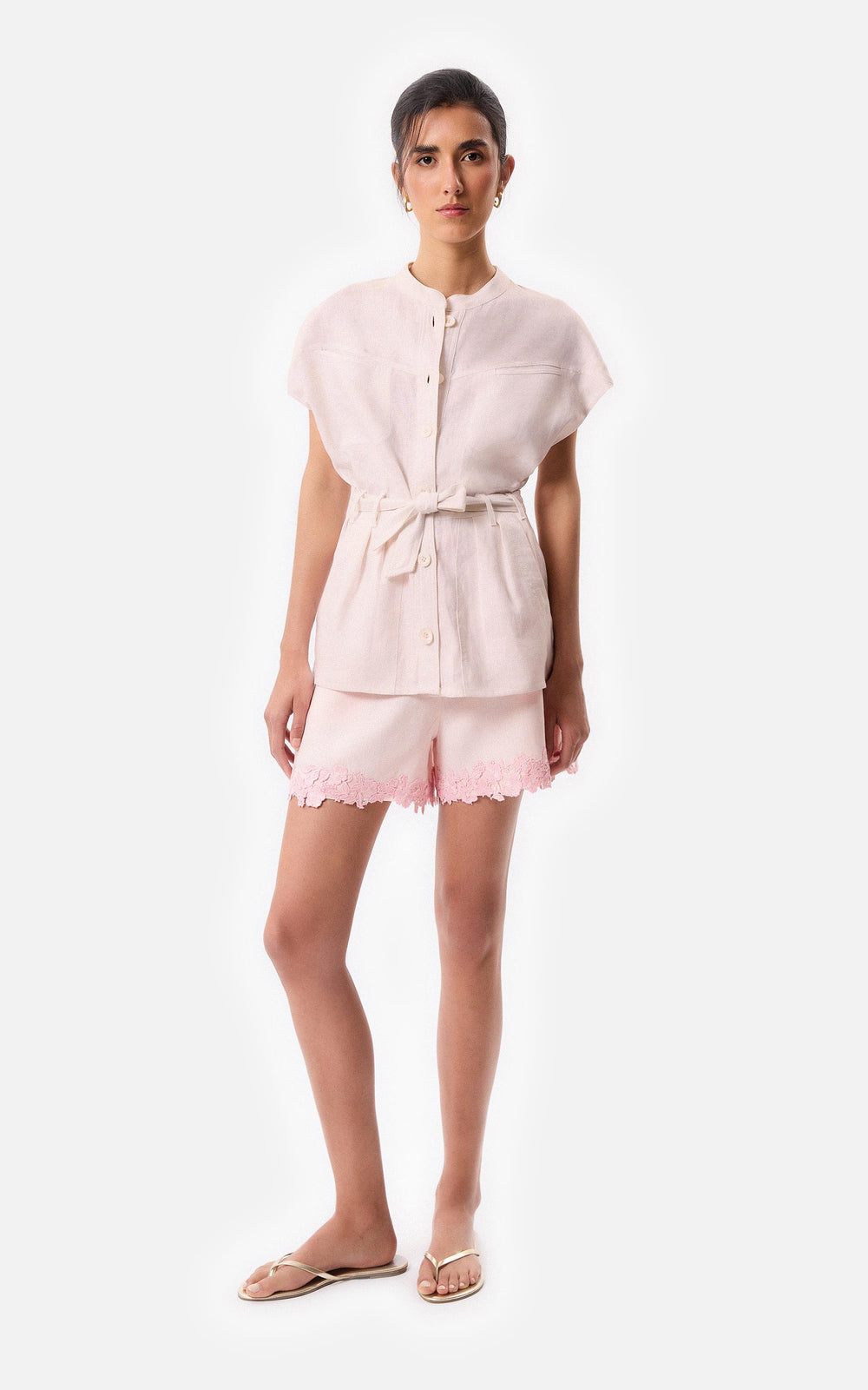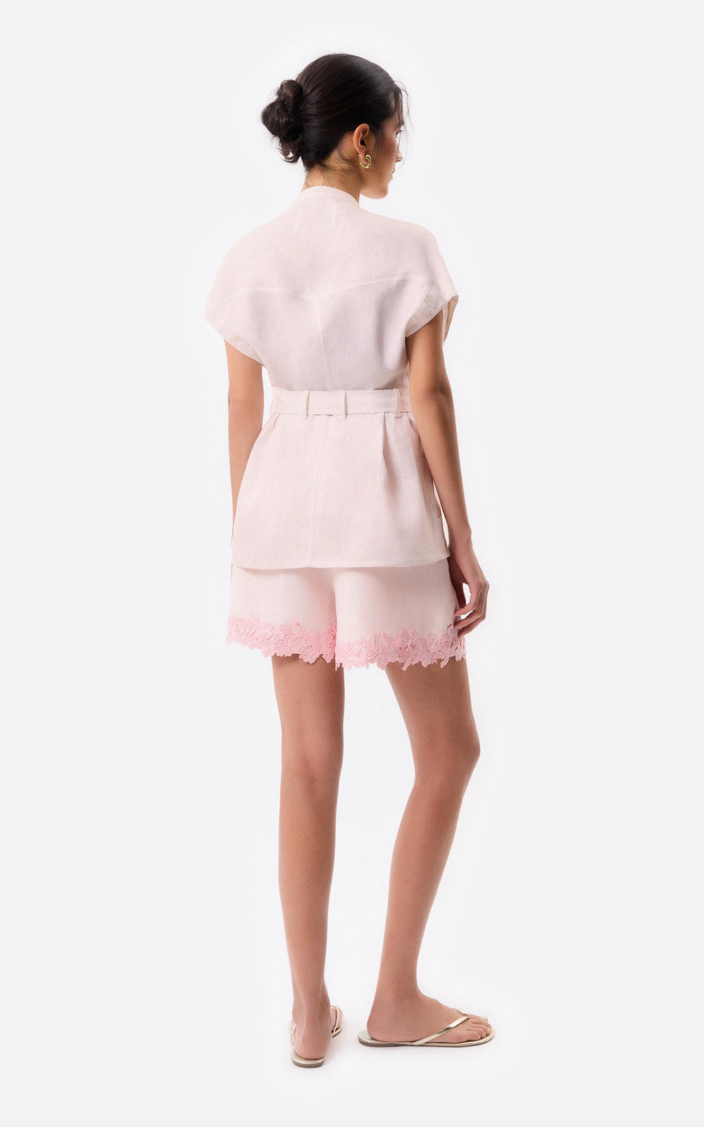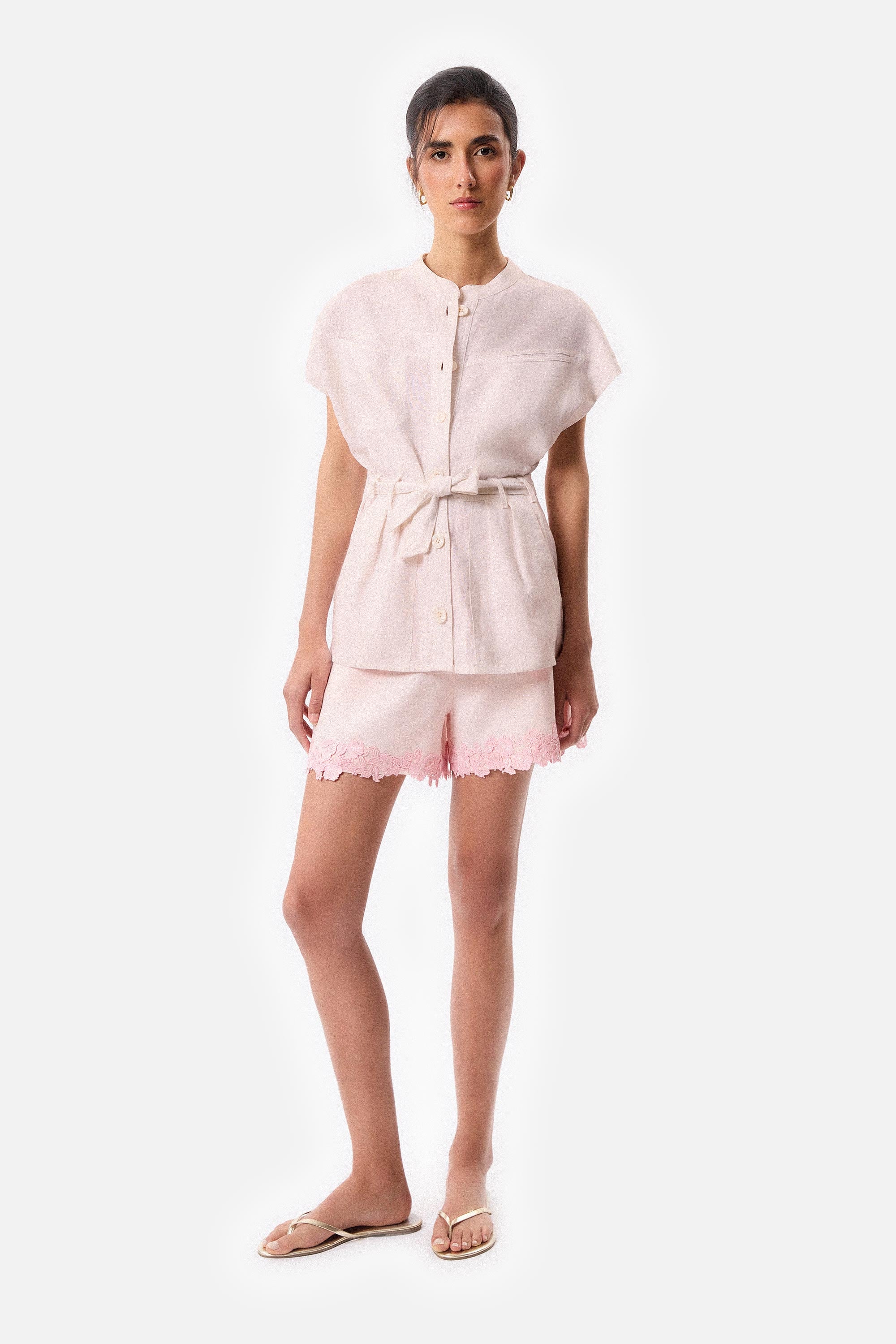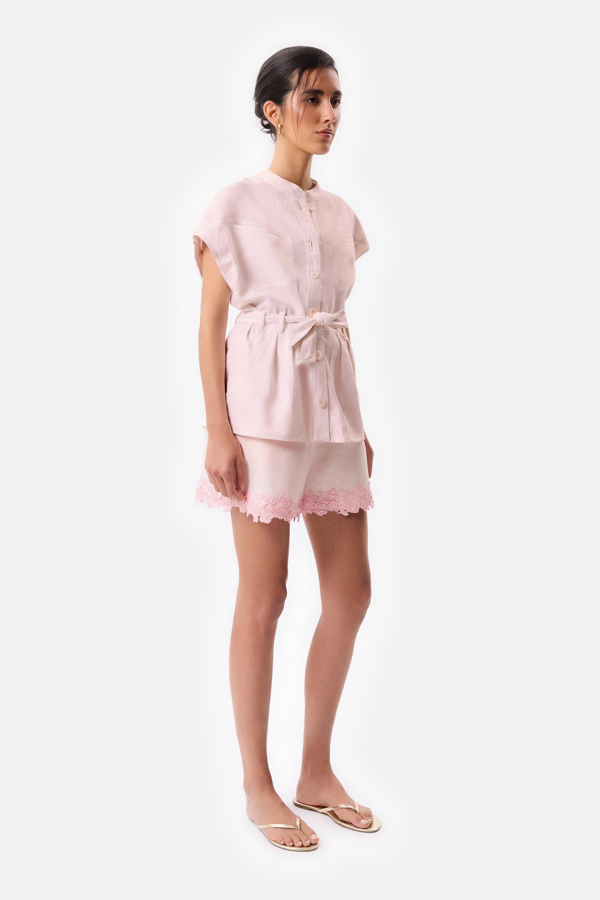 • Short de lino color rosa con aplique de guipure en la botamanga.