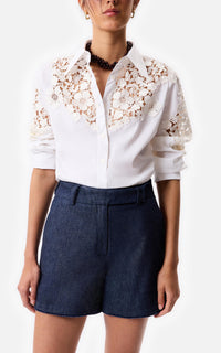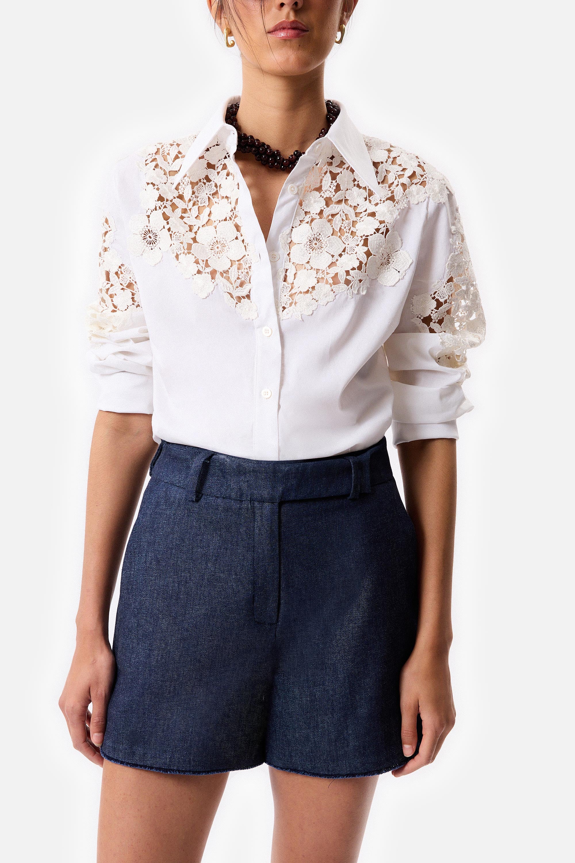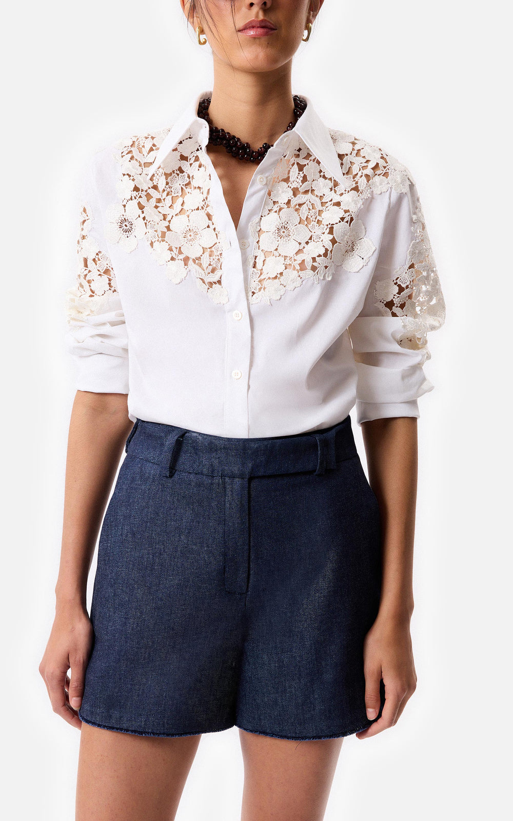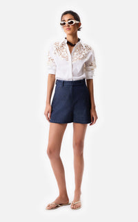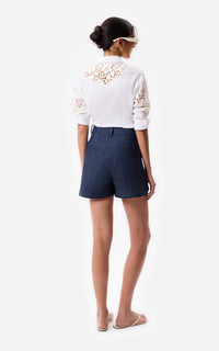 • Chaleco sastrero de denim elastizado azul con las terminaciones frontales desflecadas y 4 botones a tono.