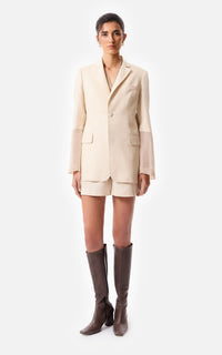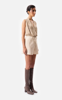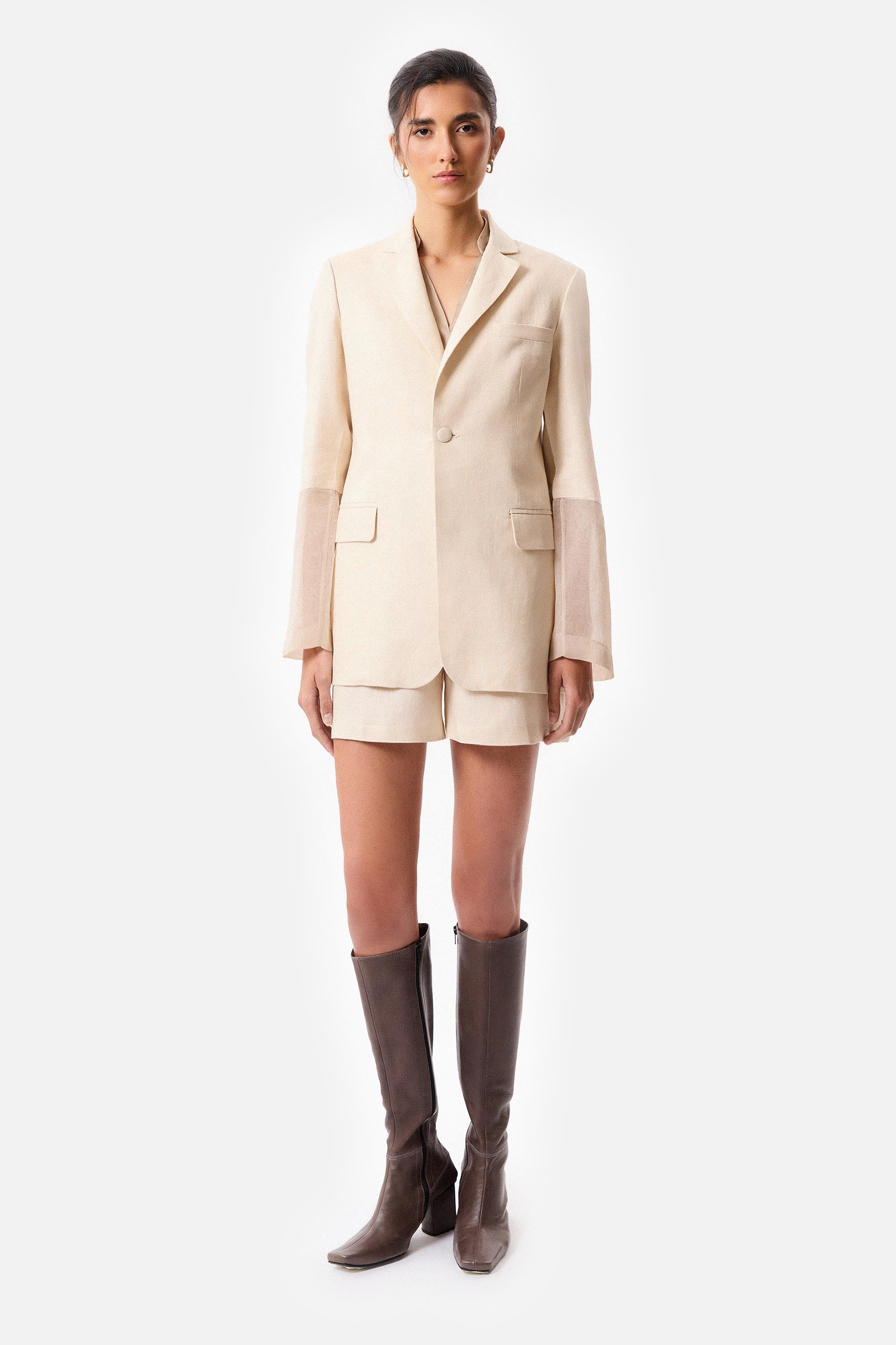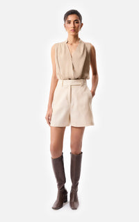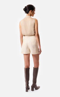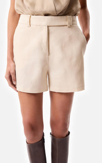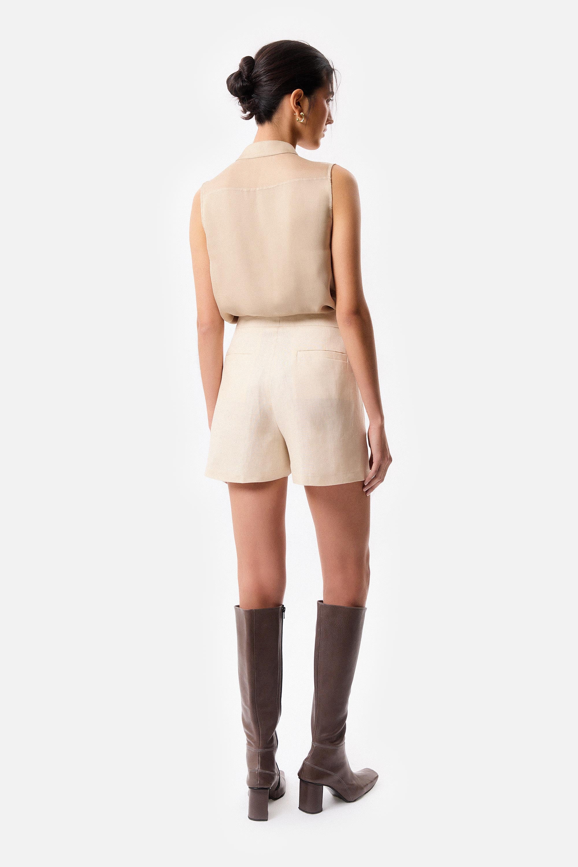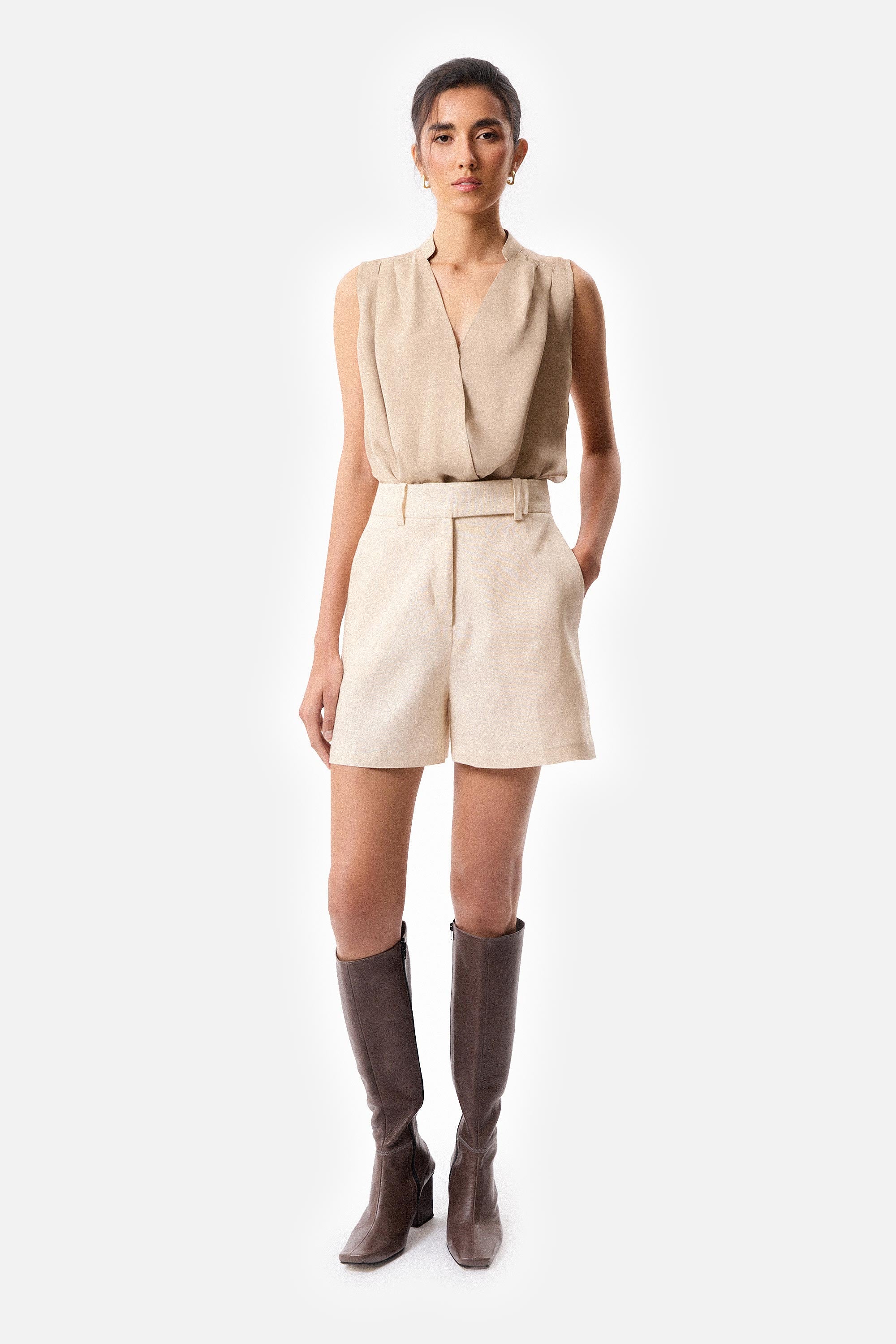 • Short de lino color arena con cierre delantero y gancho pantalonero.