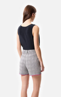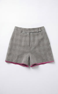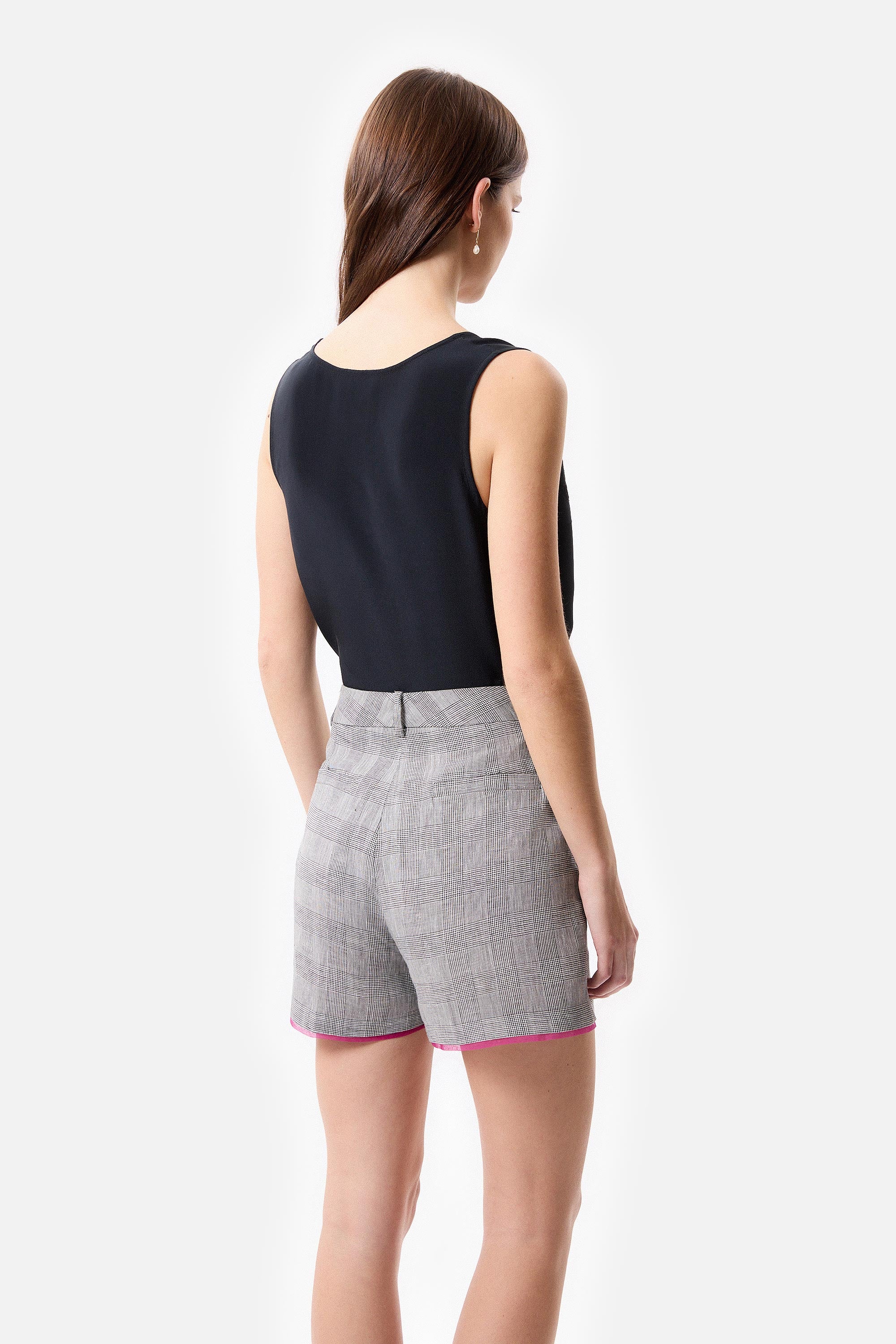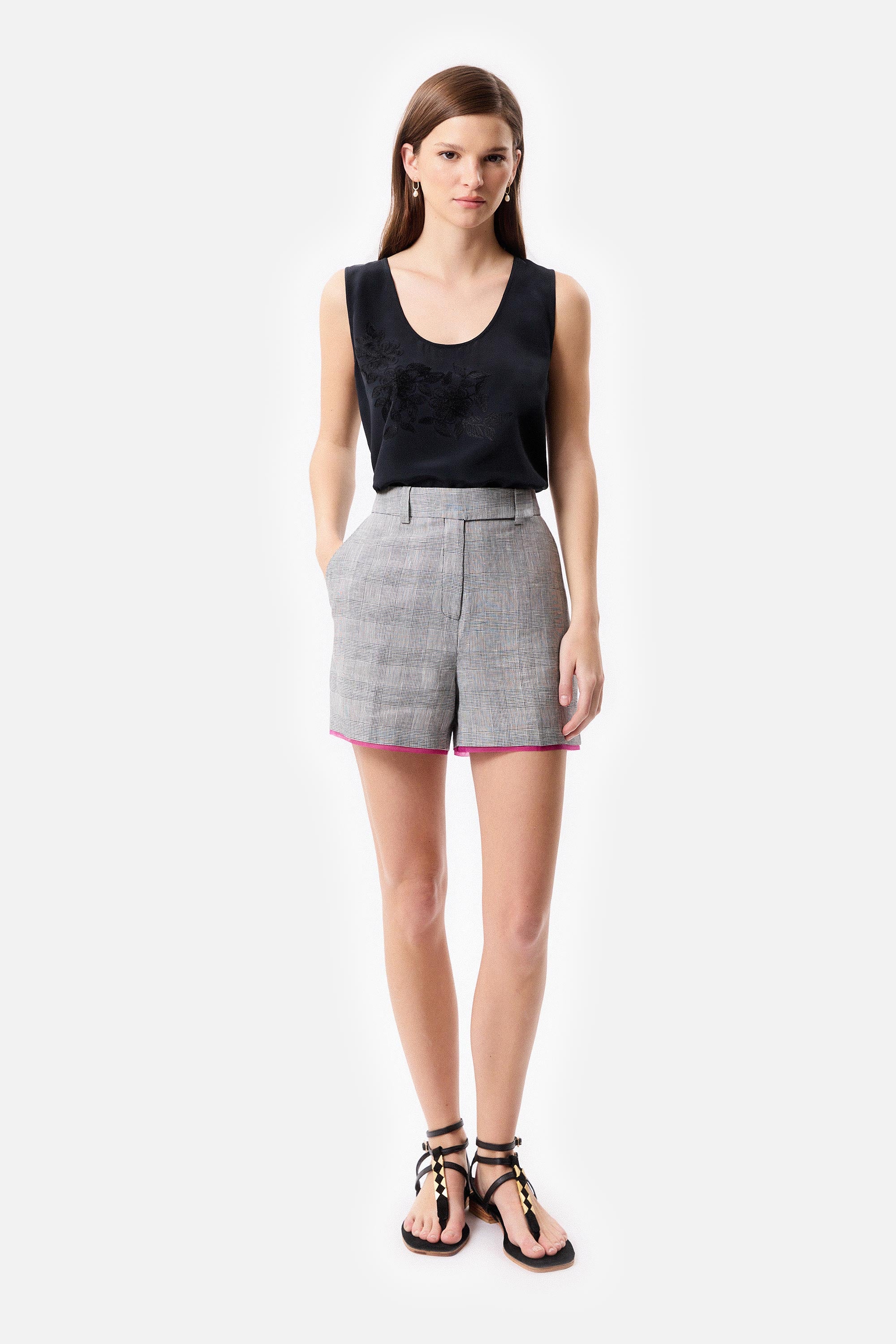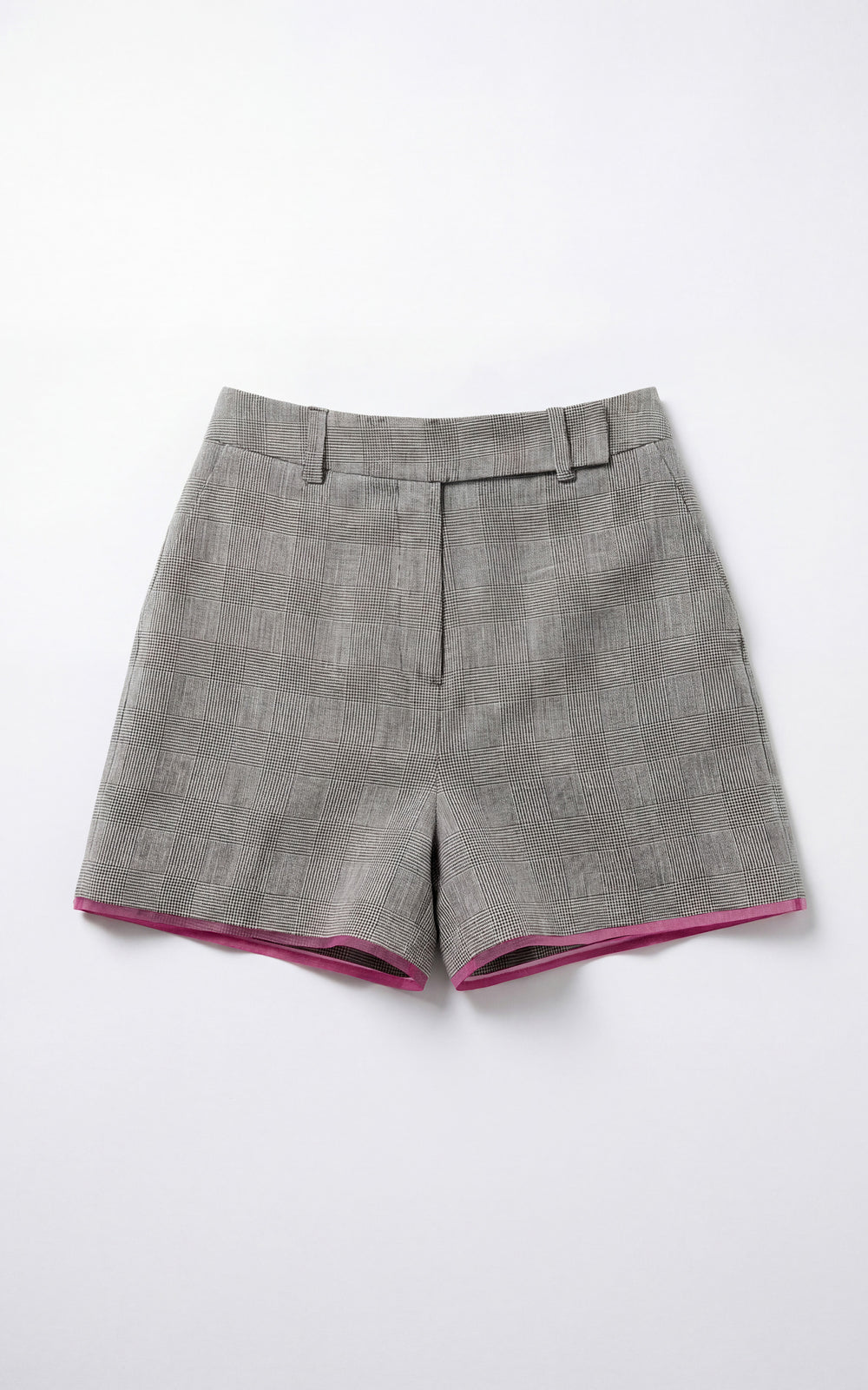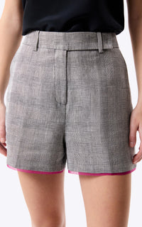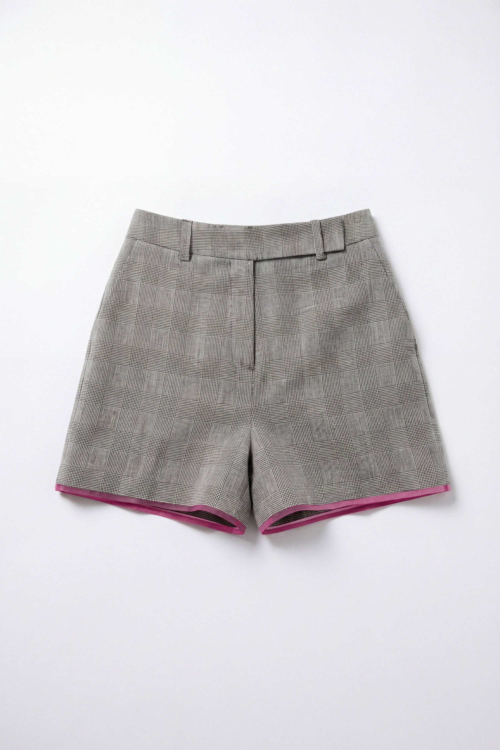 • Short de lino príncipe de gales con cierre delantero y gancho pantalonero.