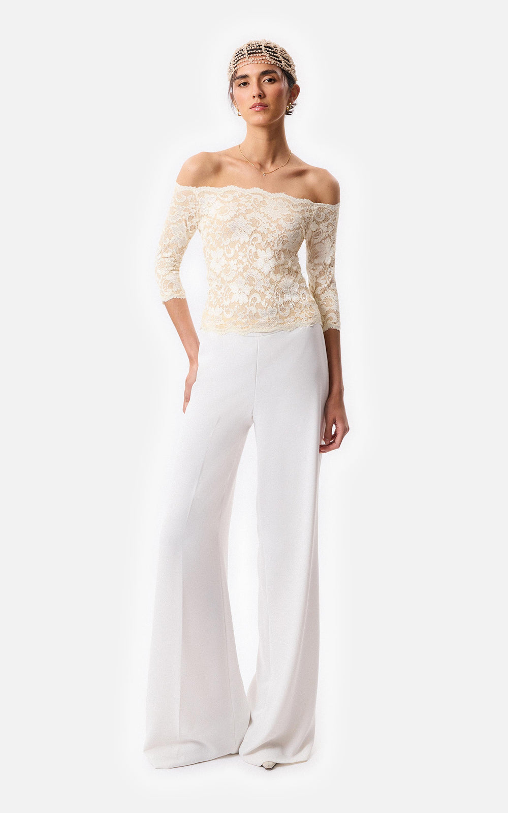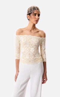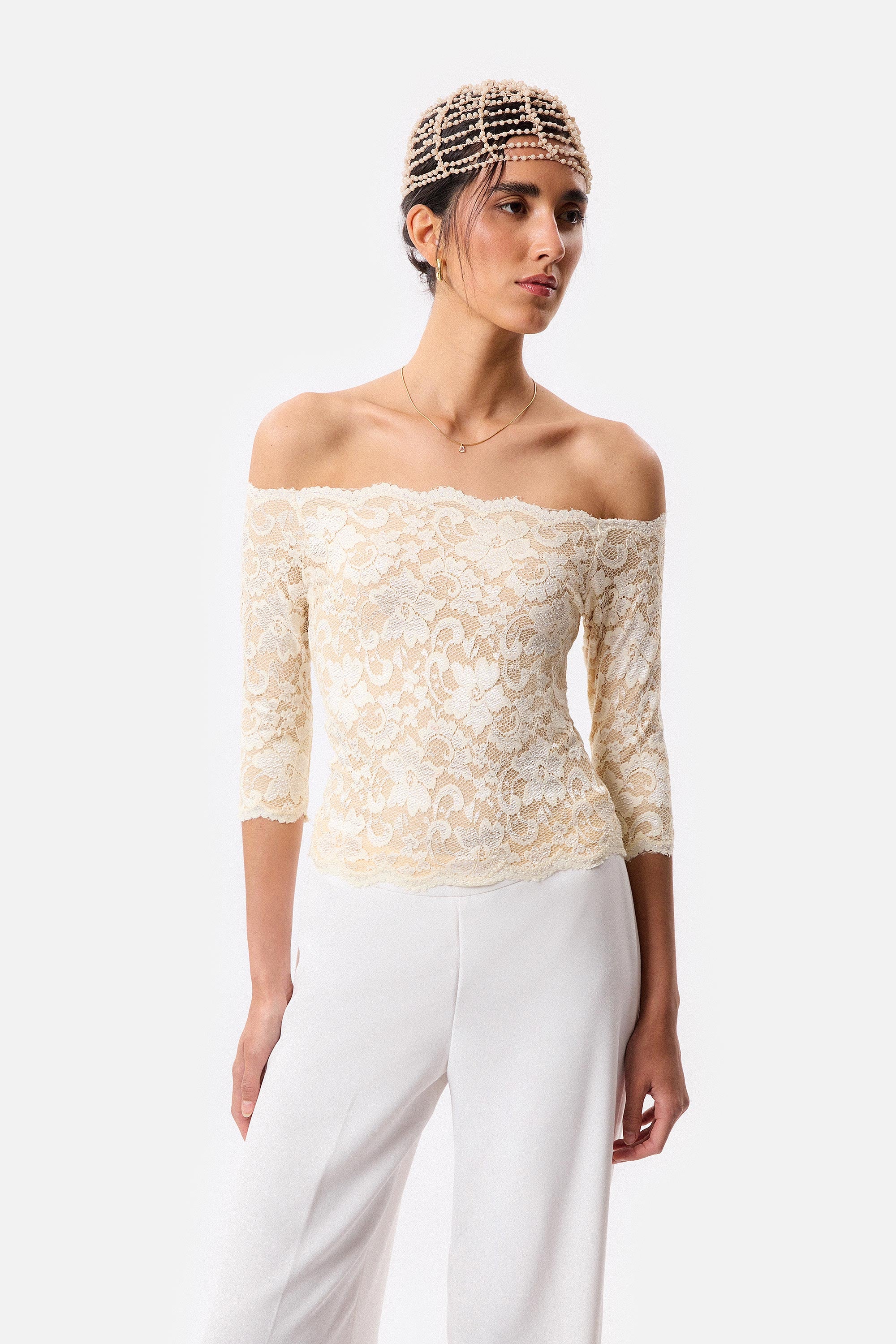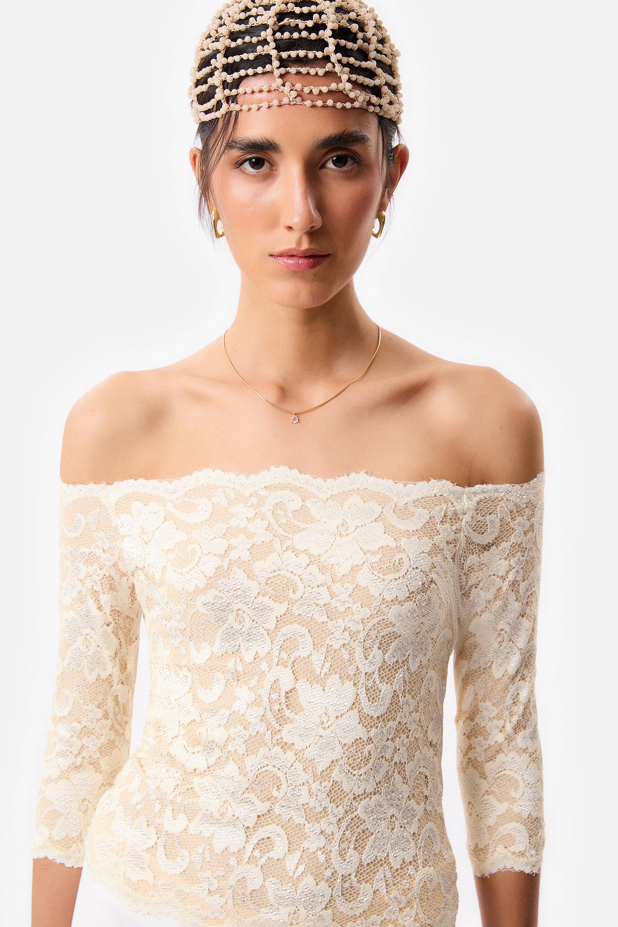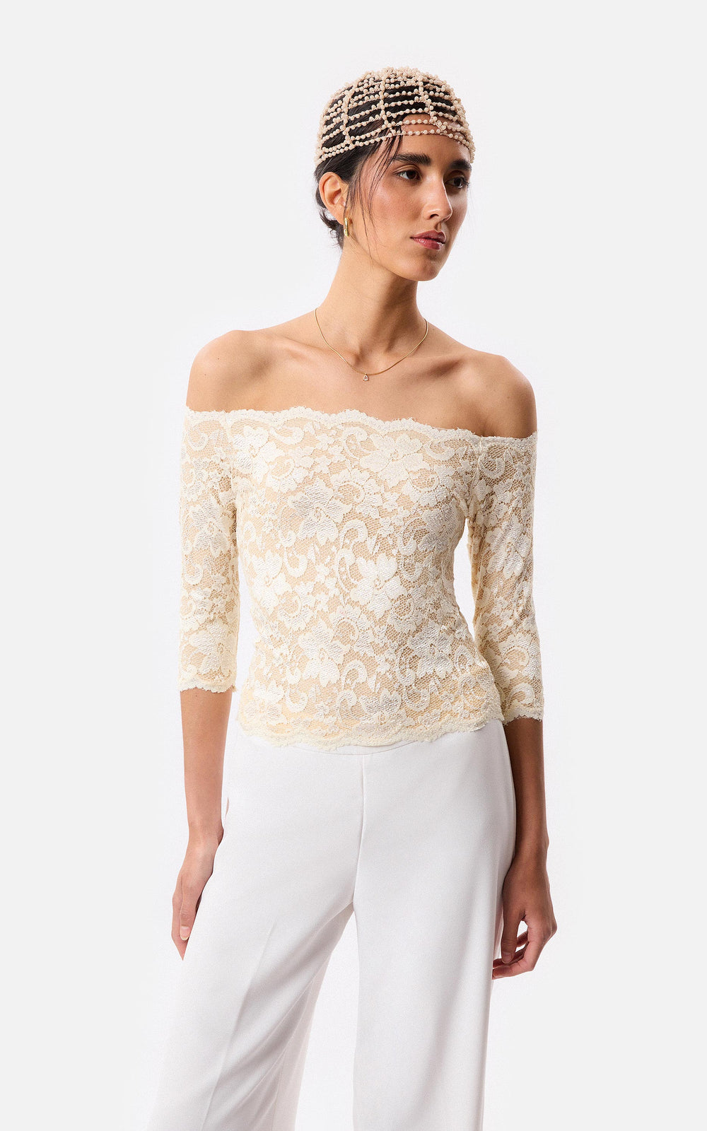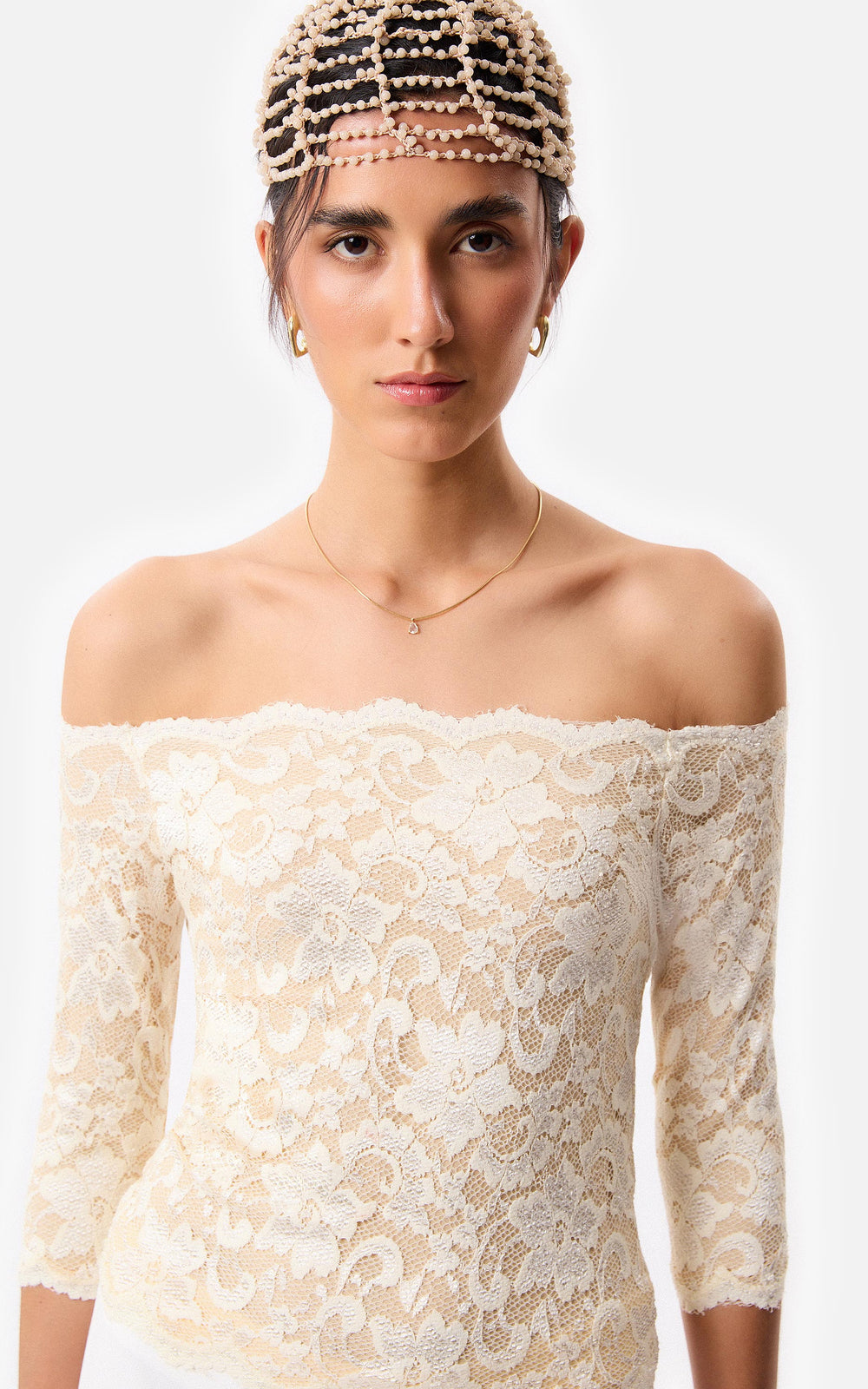 • Top off-shoulder de encaje stretch color off-white forrado en color piel.