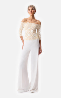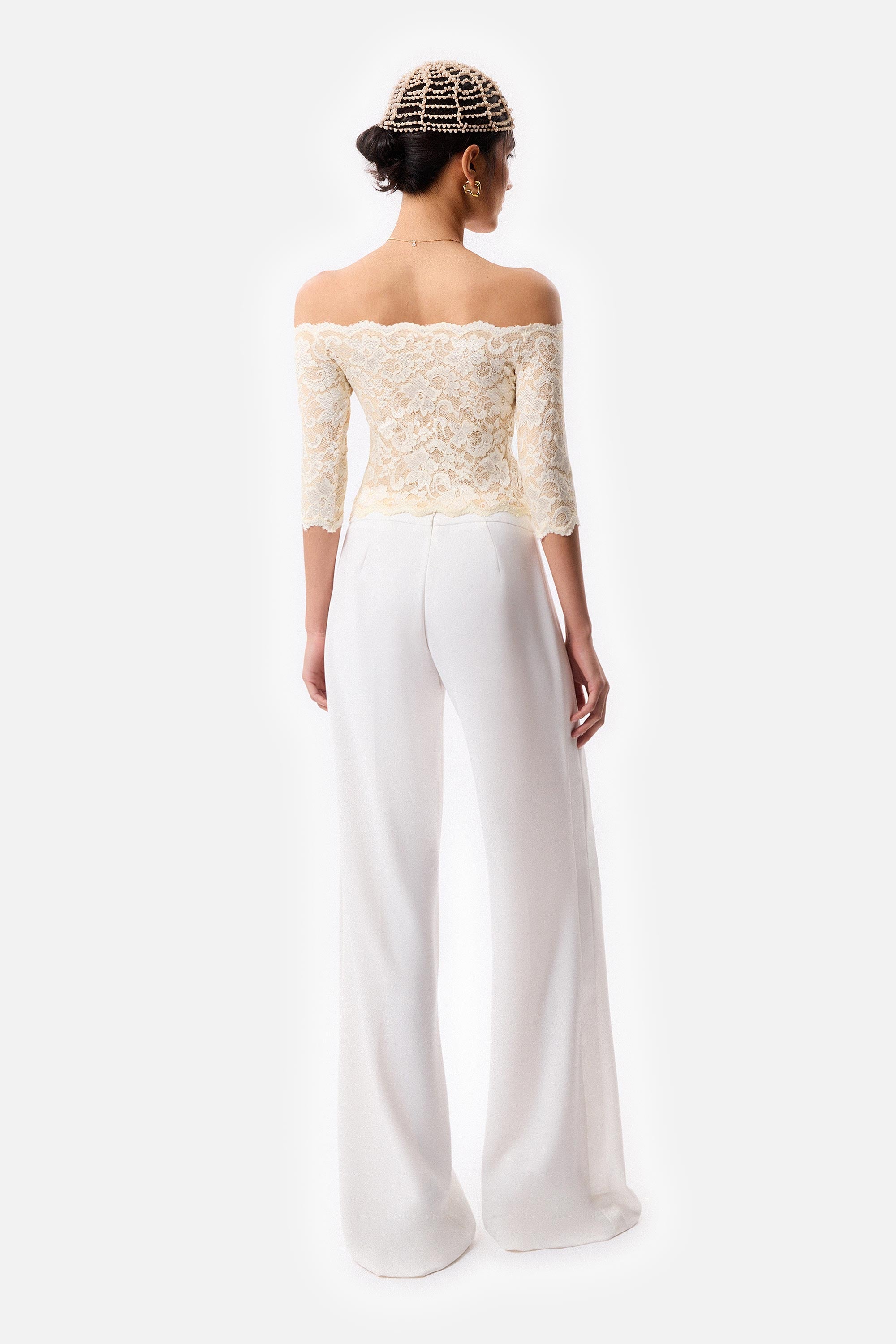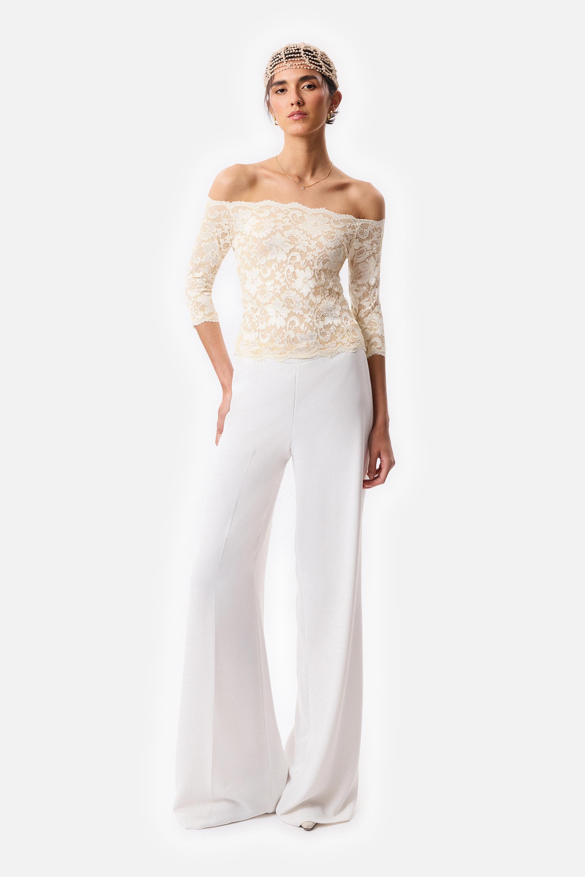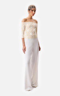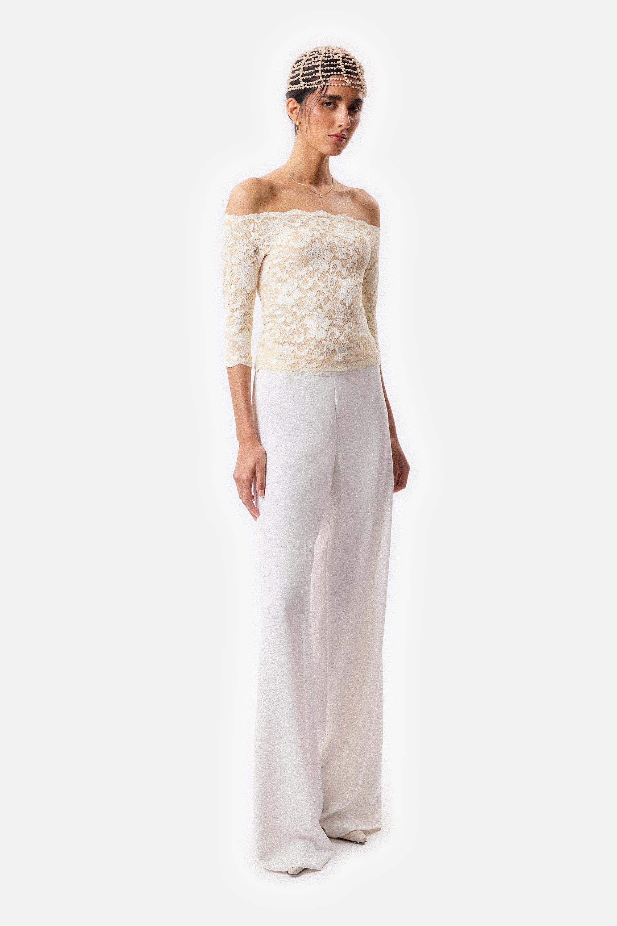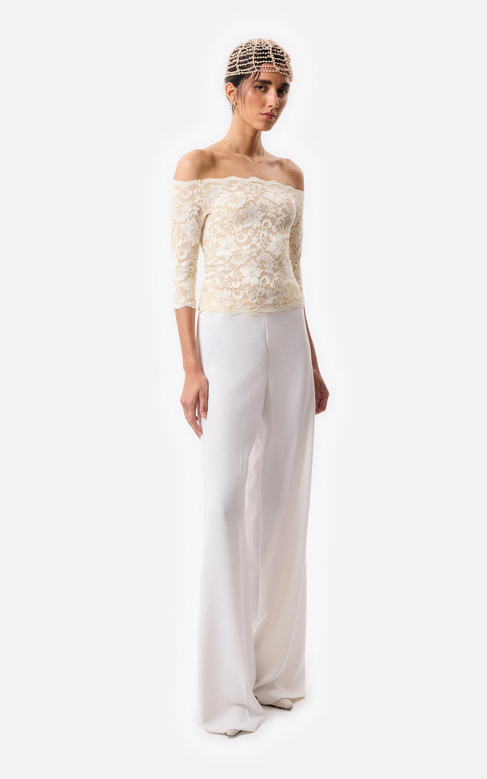 • Top off-shoulder de encaje stretch color off-white forrado en color piel.