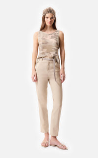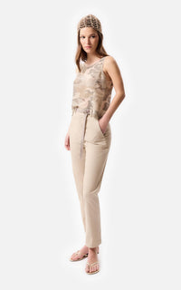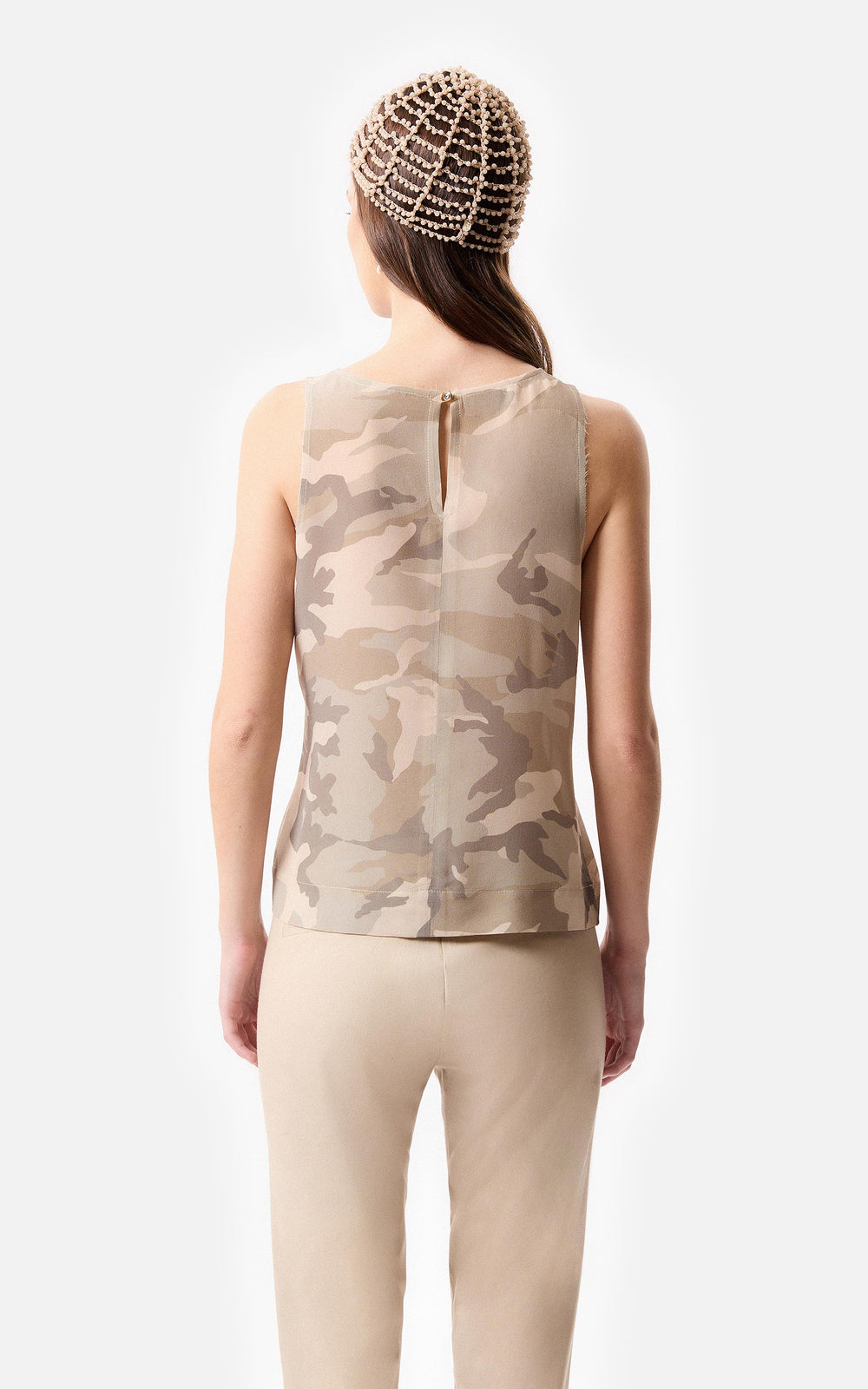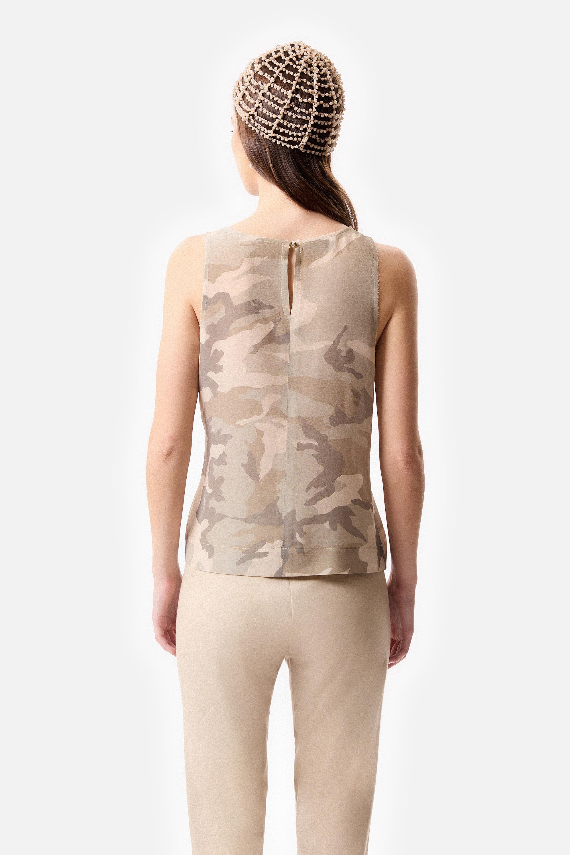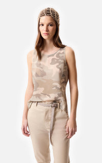 • Tank top de satén camouflage color beige con sus terminaciones de escote y sisa al corte.