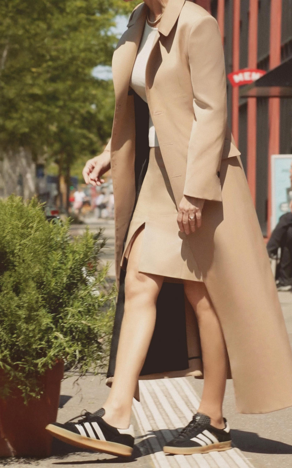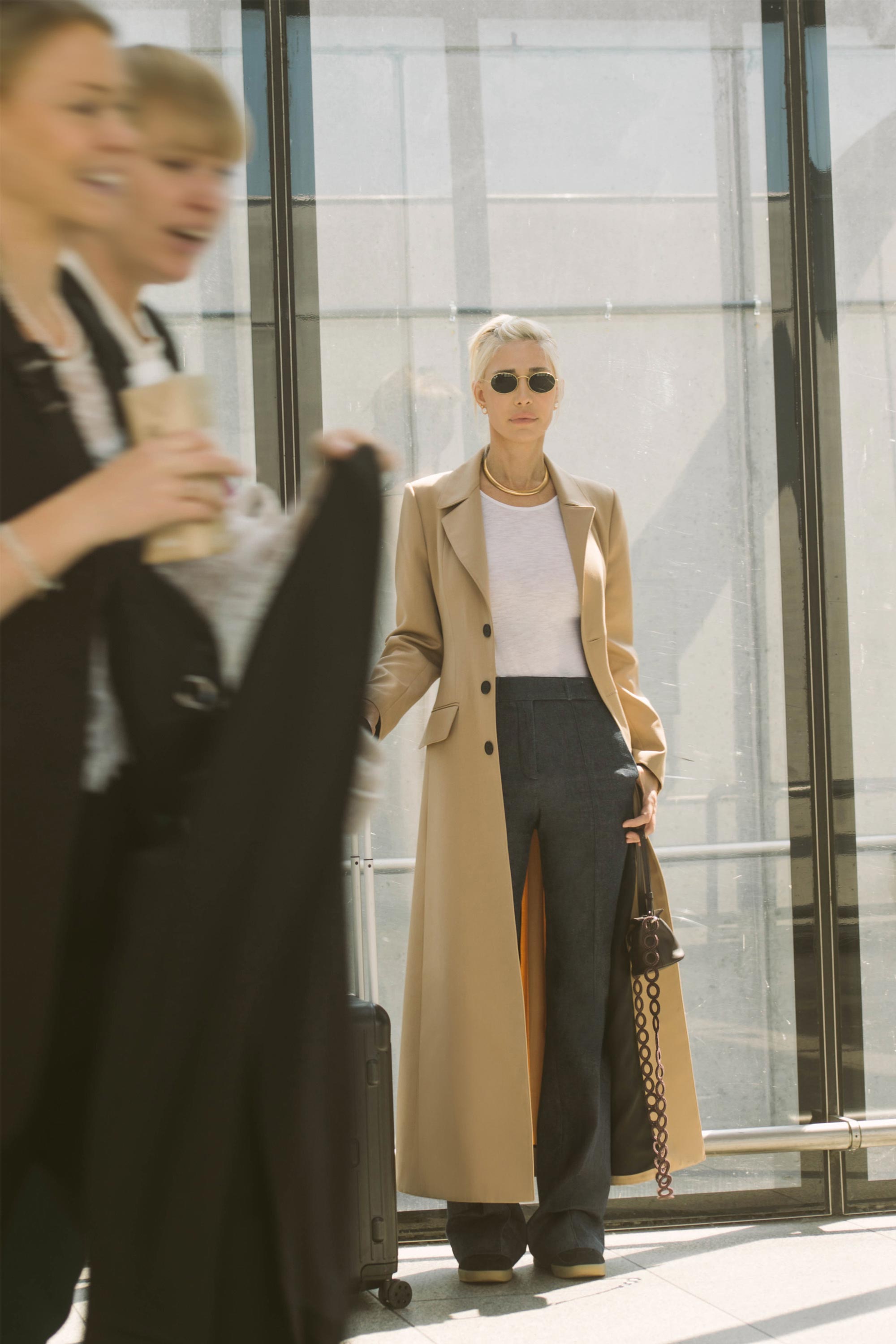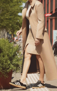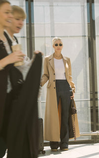 • Tapado confeccionado en gabardina impermeable beige forrado en alpaseda negra, con un tajo en la espalda.