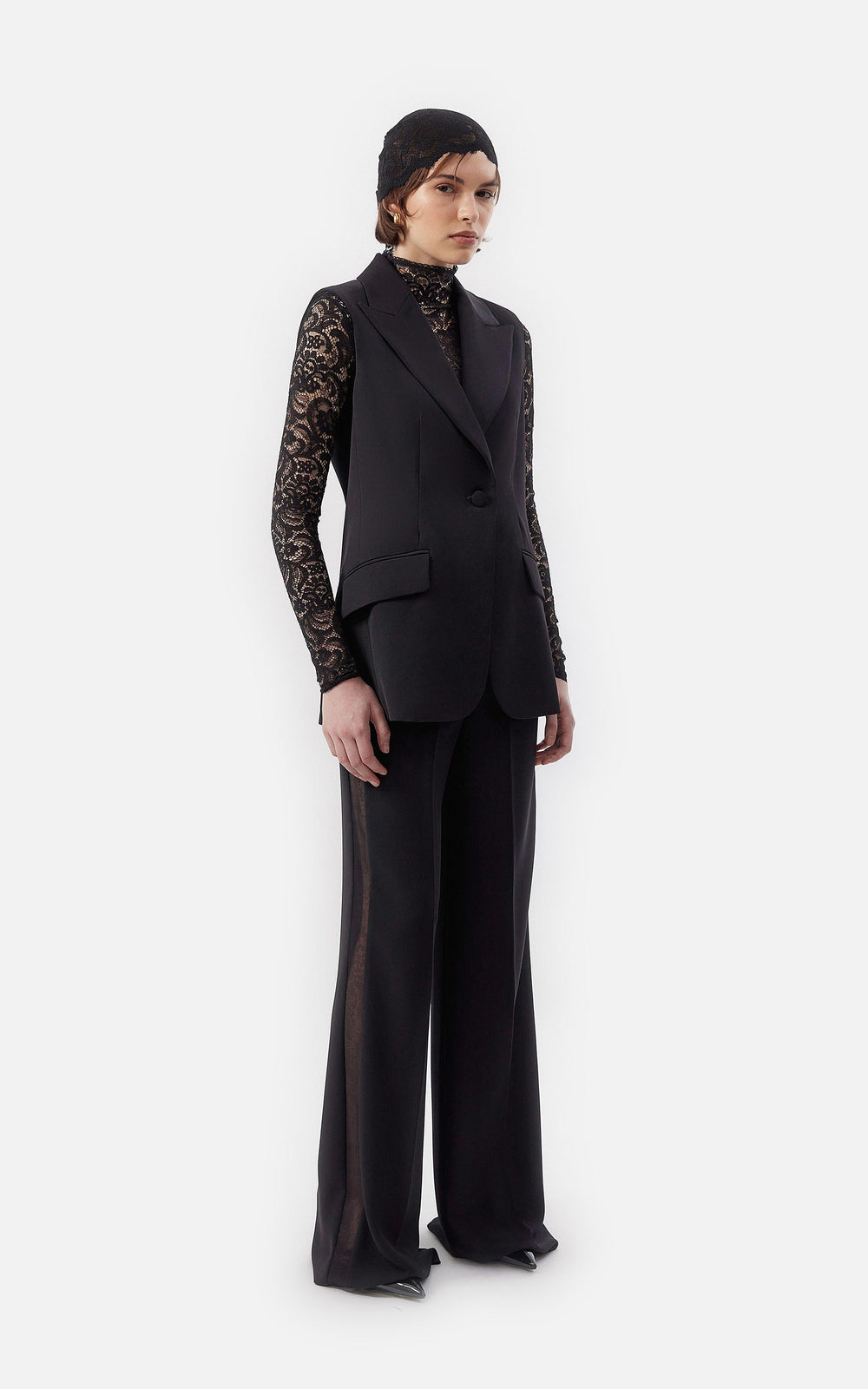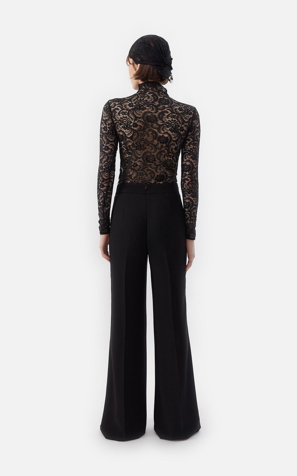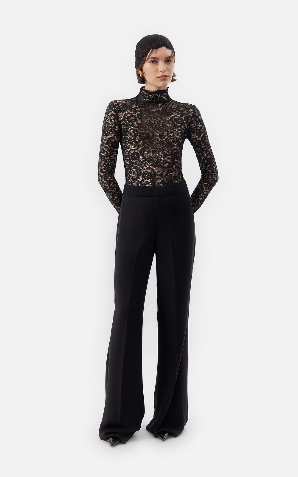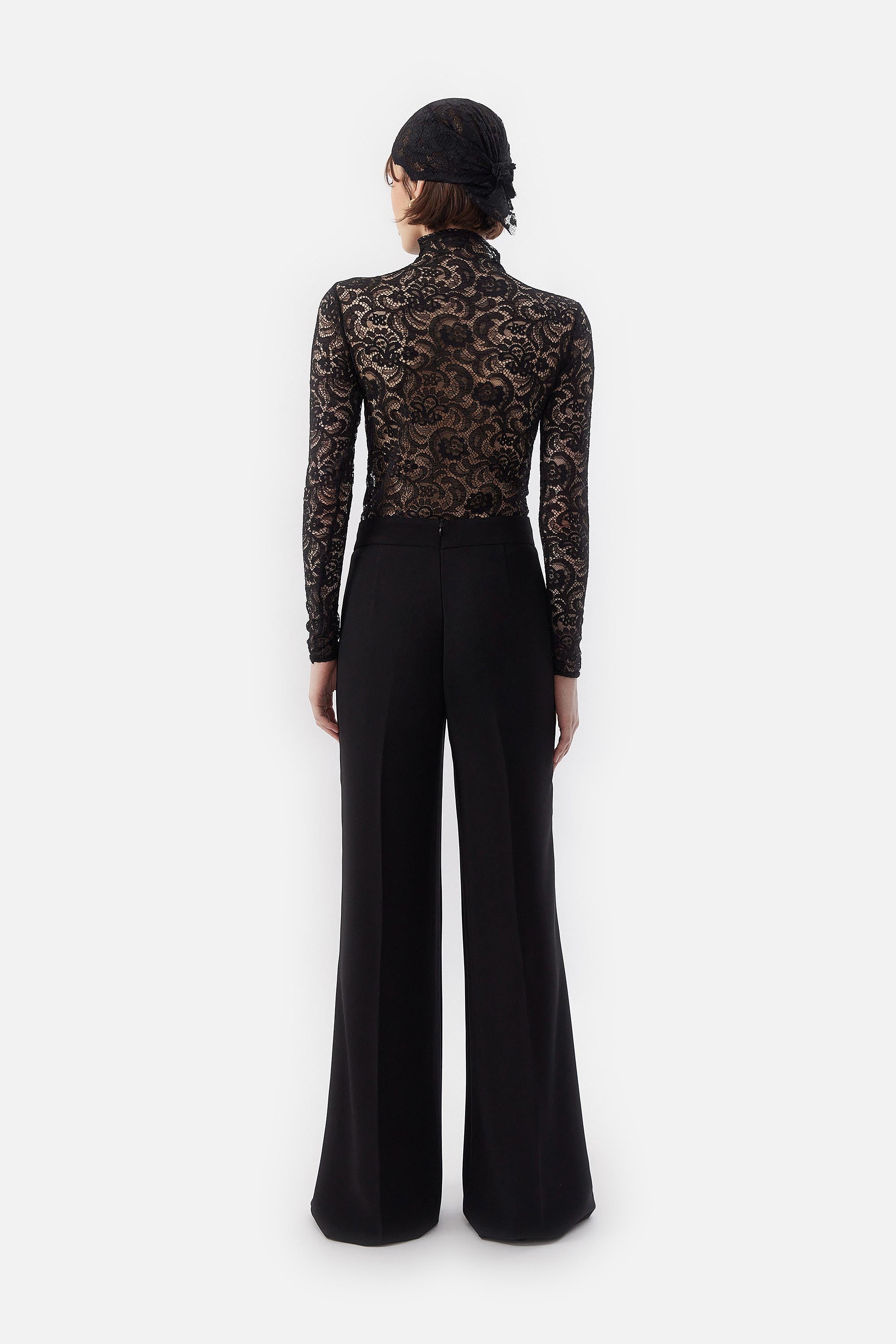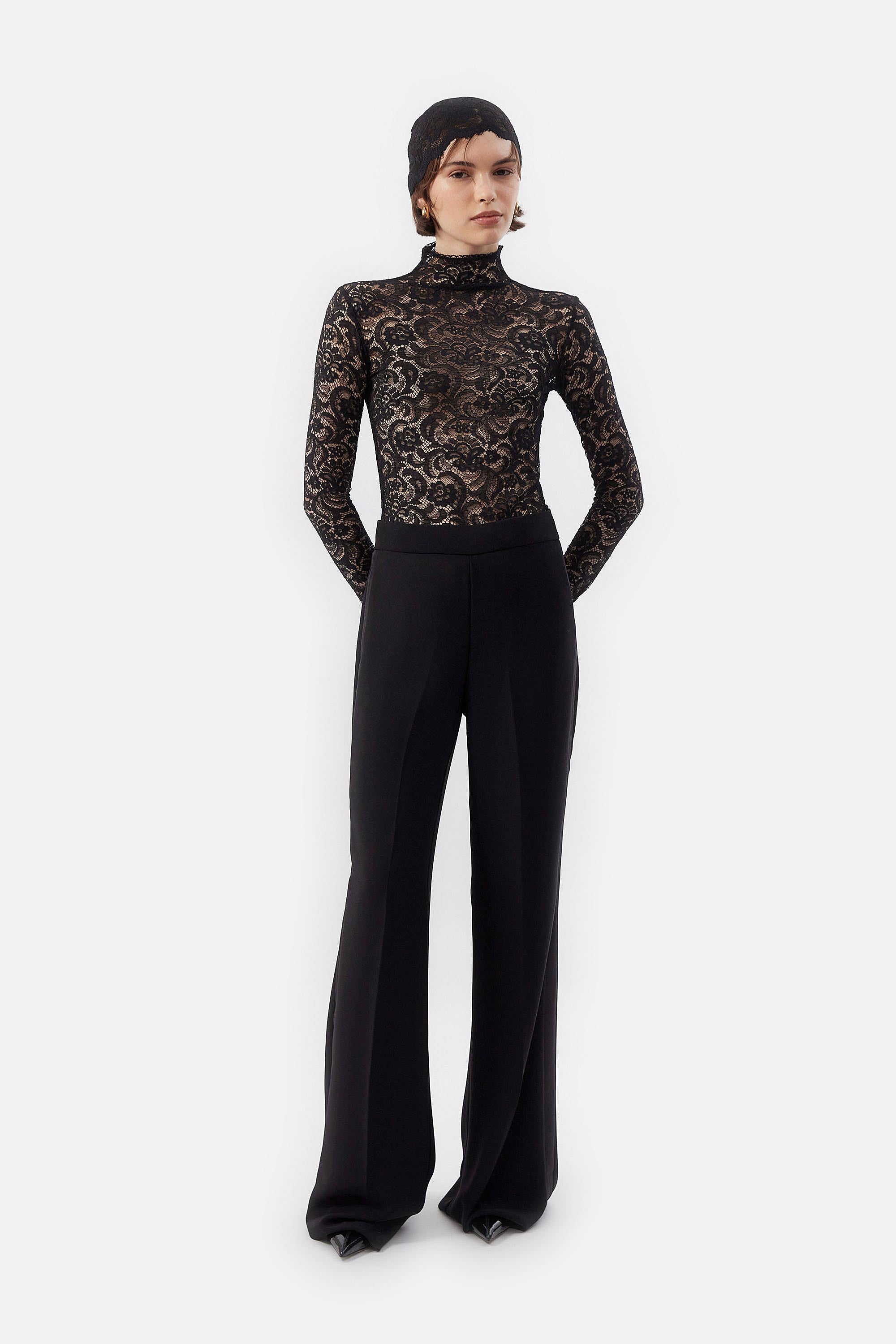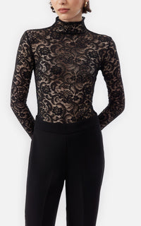 • Top de cuello alto y mangas largas en encaje stretch negro.