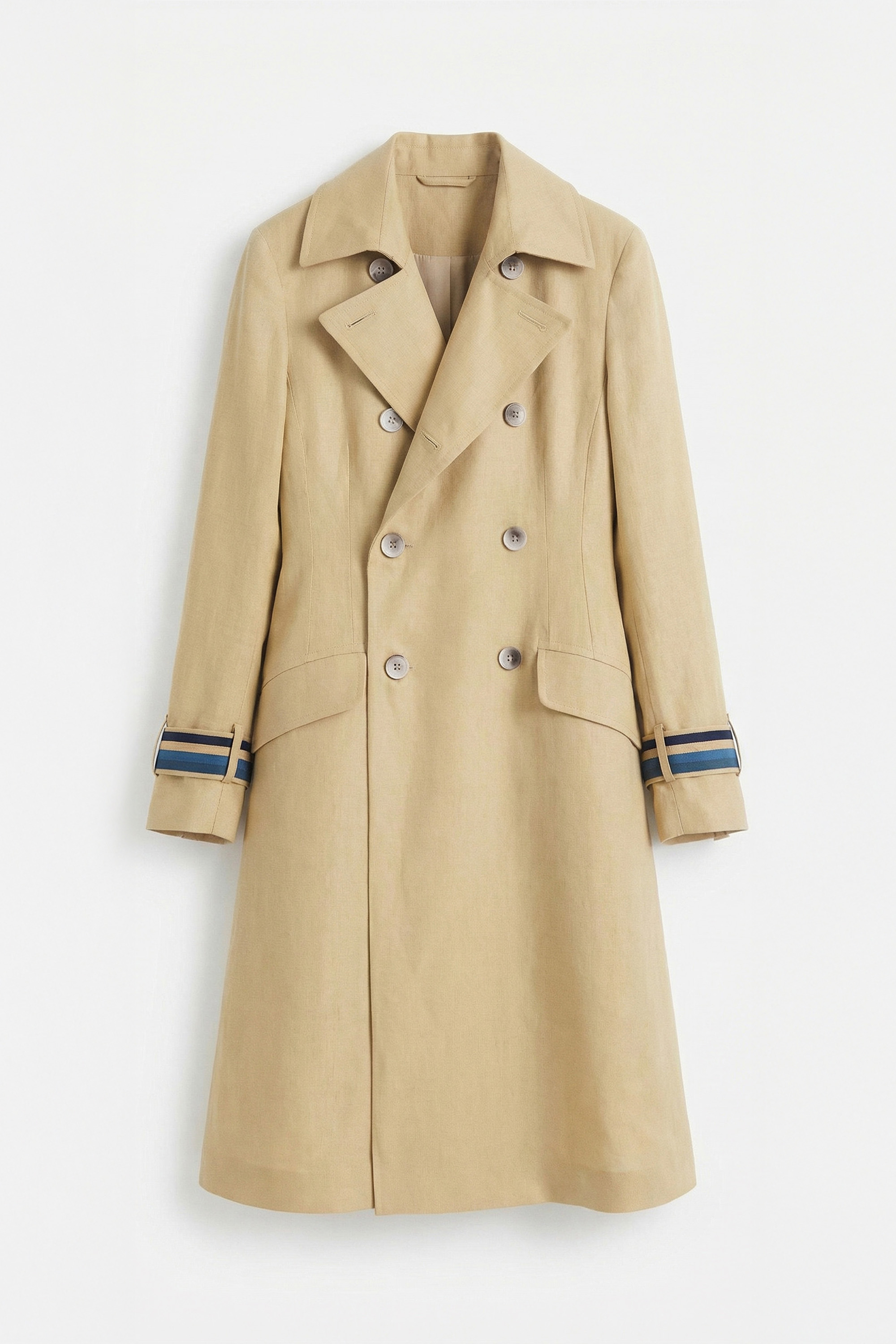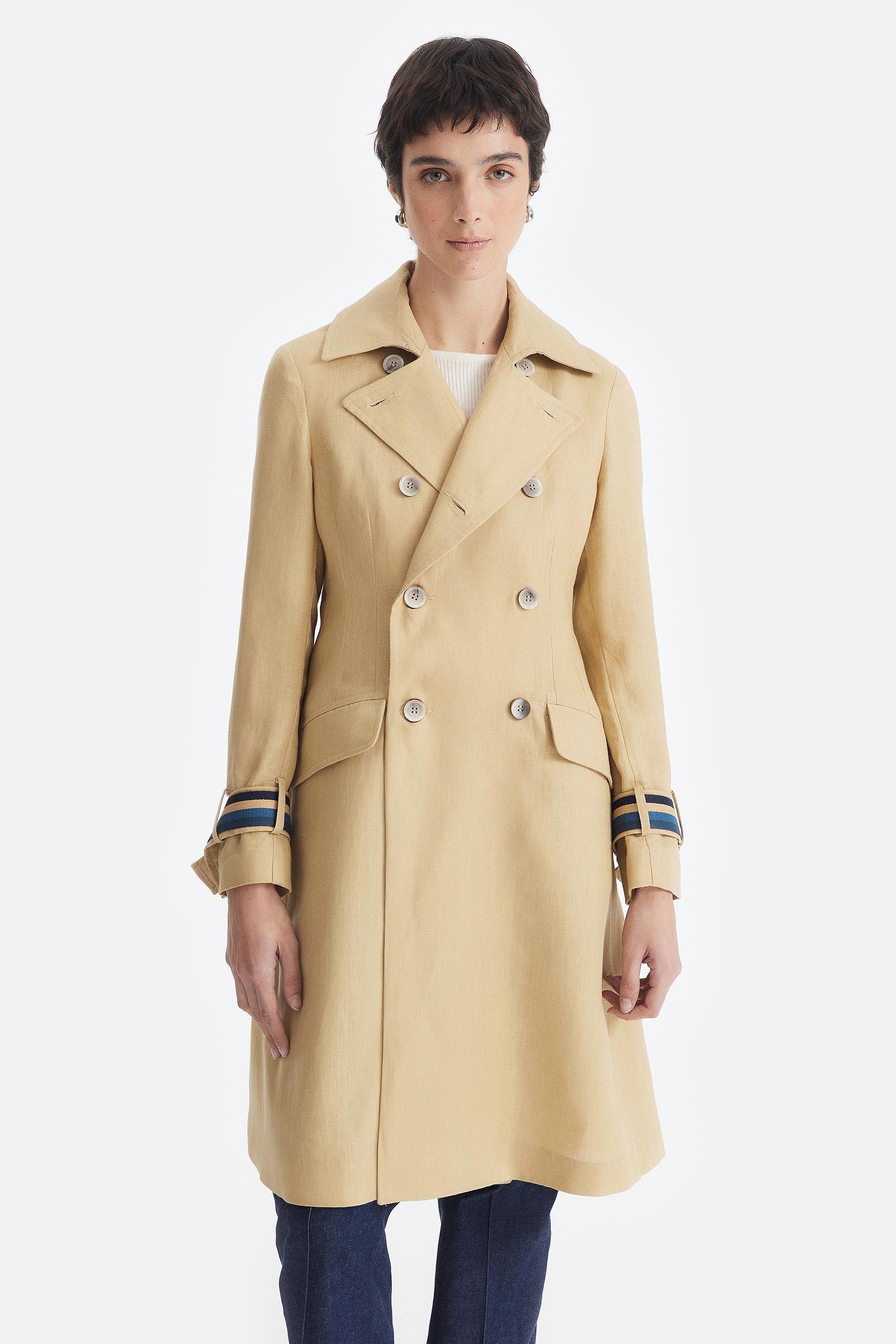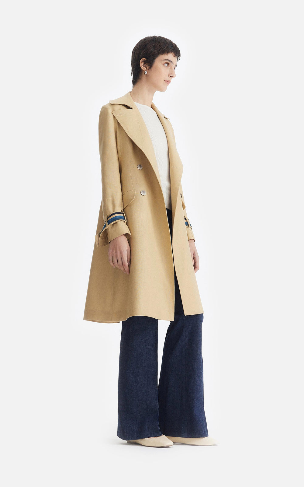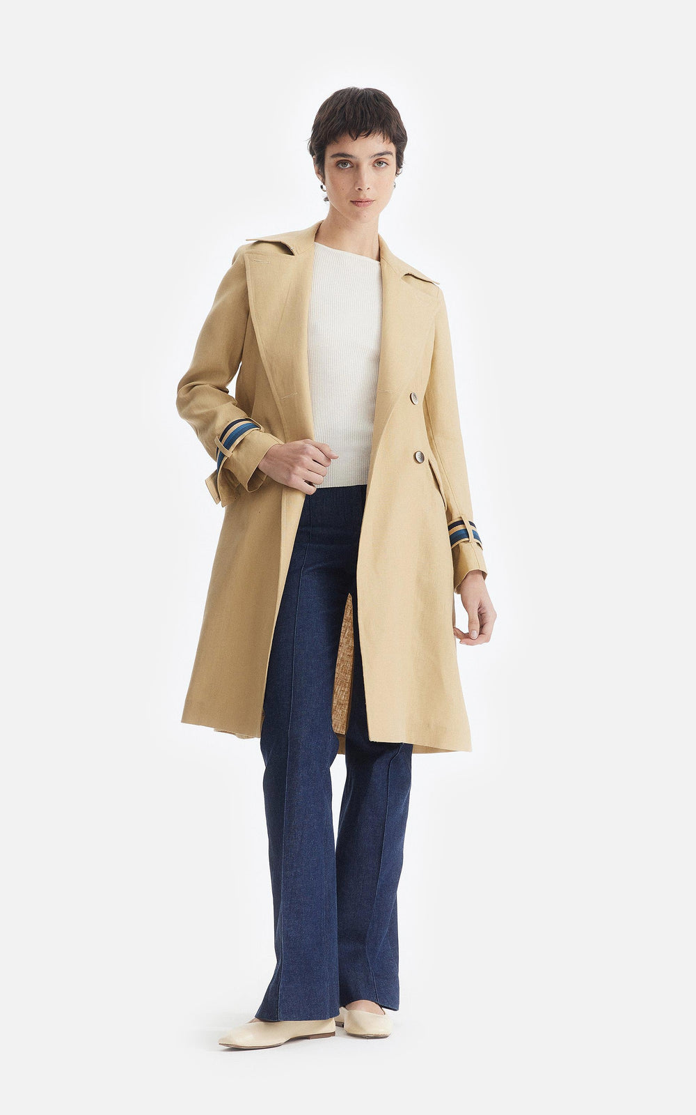 • Trench de lino sin forrería con sus terminaciones terminadas con vivos a tono y detalle en puños en el mismo lino.