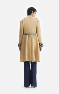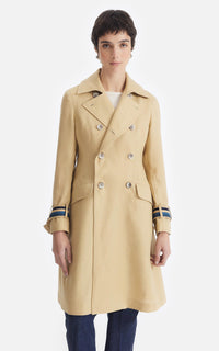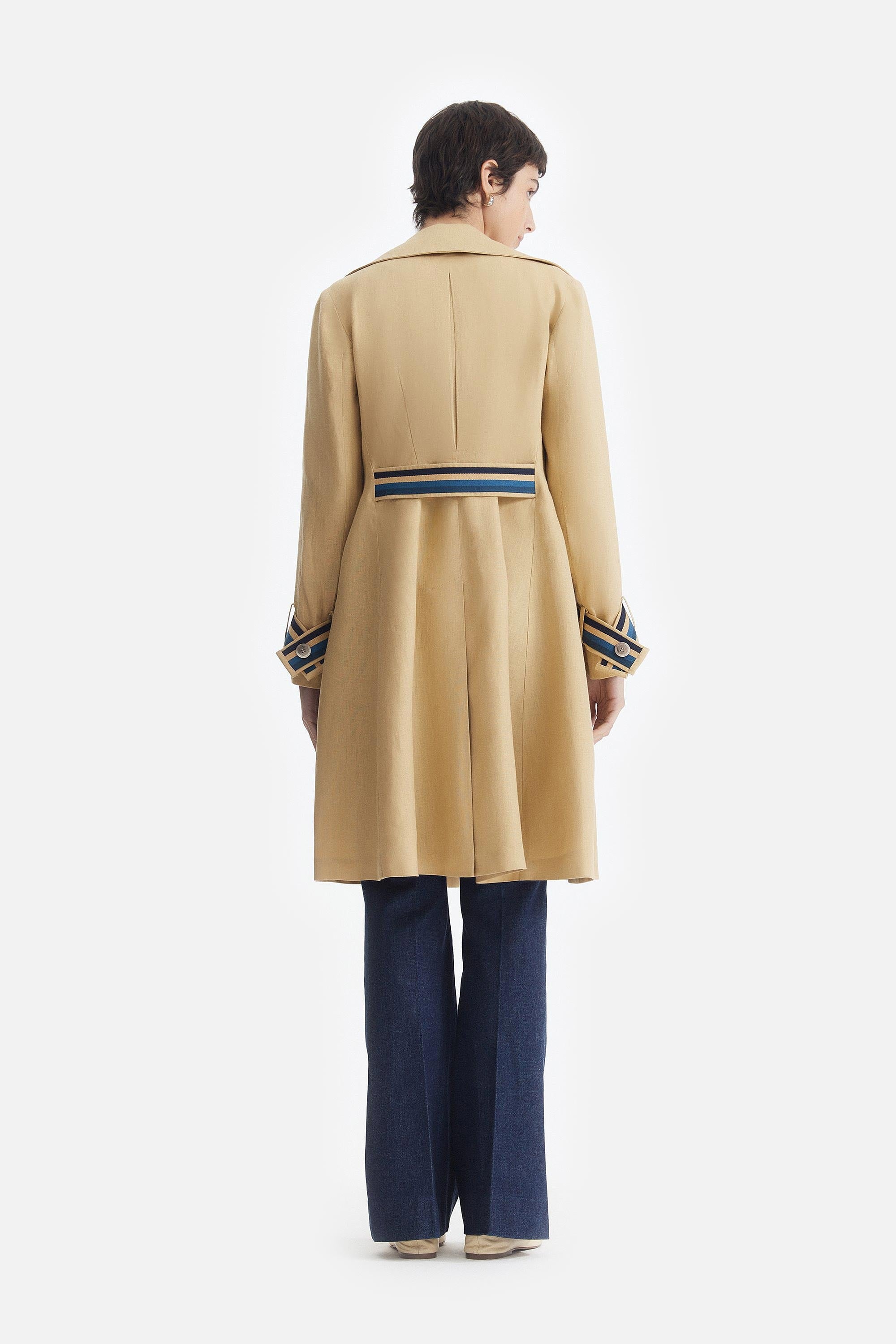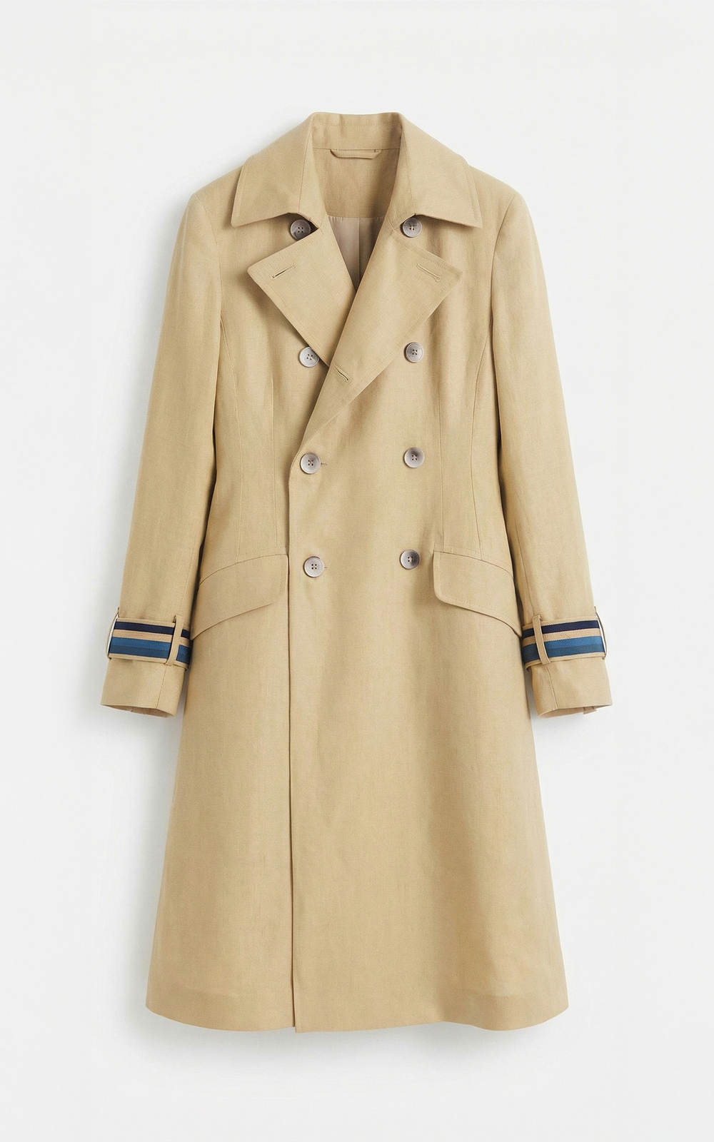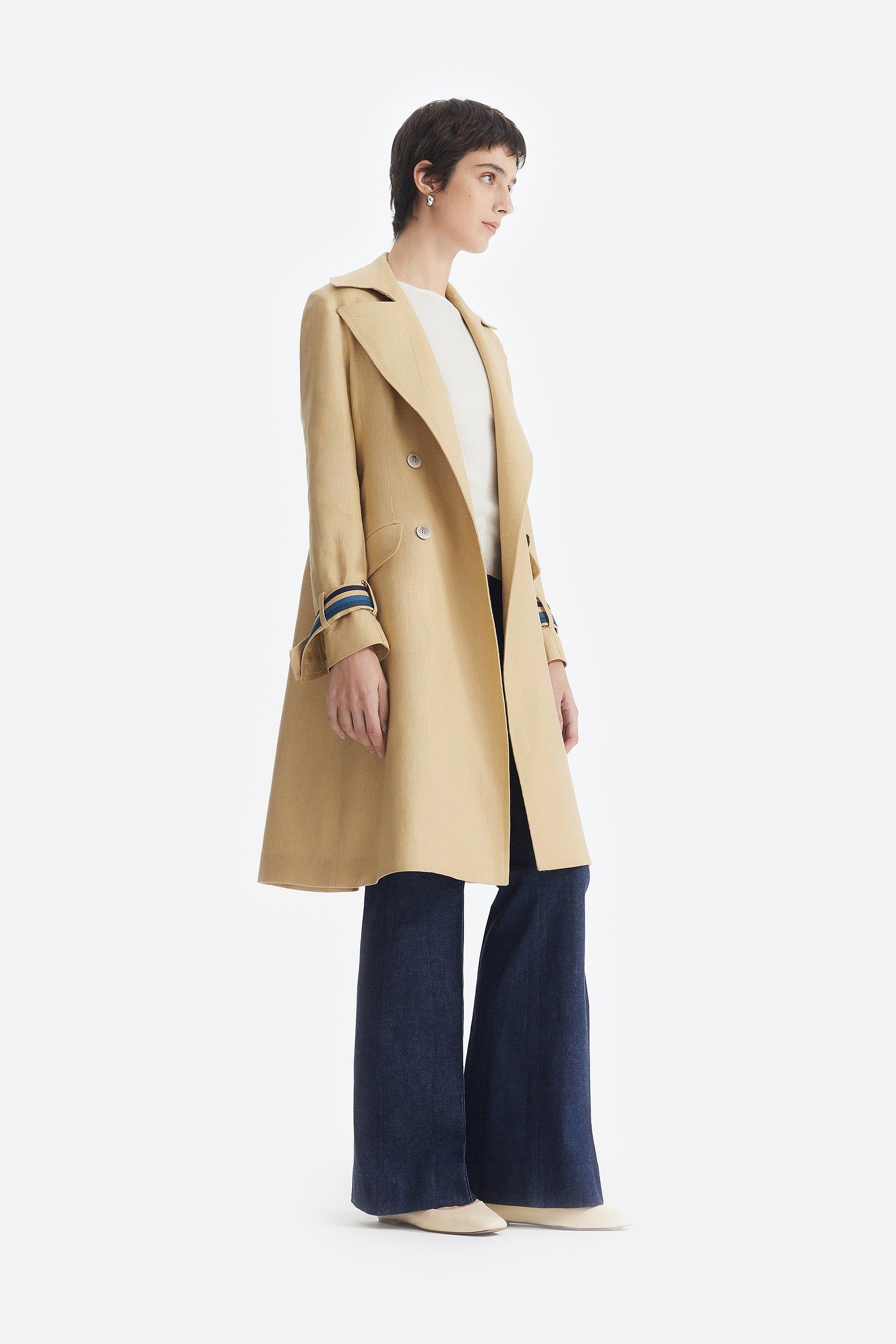 • Trench de lino sin forrería con sus terminaciones terminadas con vivos a tono y detalle en puños en el mismo lino.